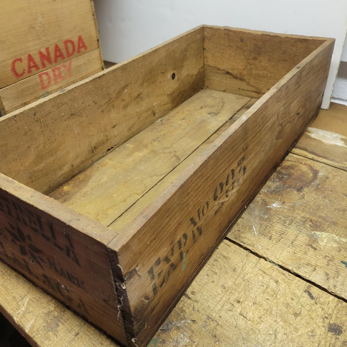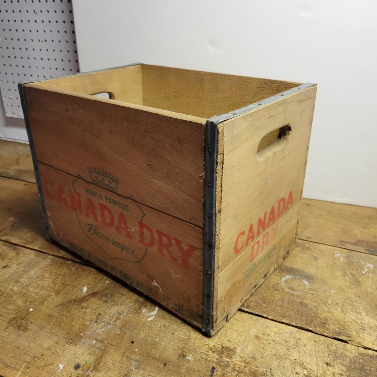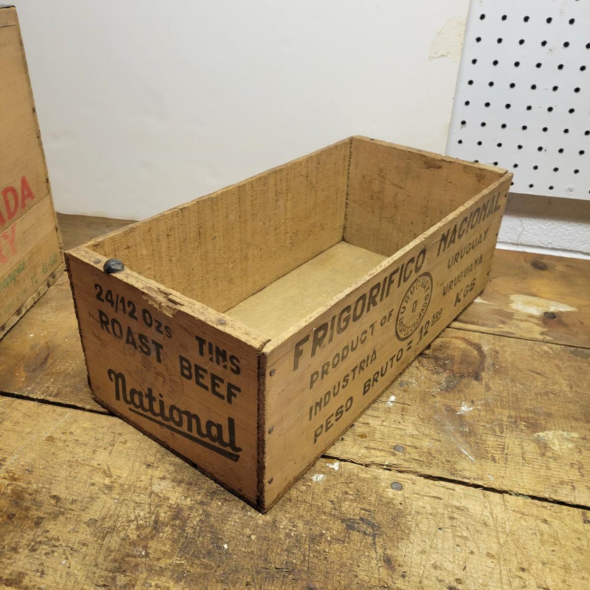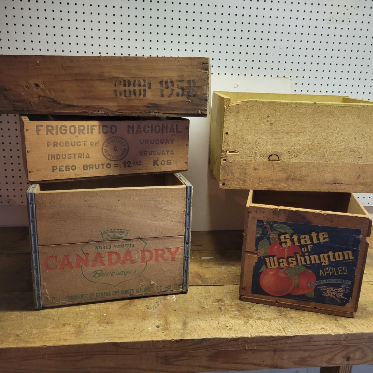 Five wooden crates in varying sizes, four appear to be vintage advertising crates. Included is a State of Washington crate, one labeled Canada Dry and another beef from Uruguay. Canada Dry crate measures approximately 16.5" x 11.5" x 12.5"H. Local pickup only