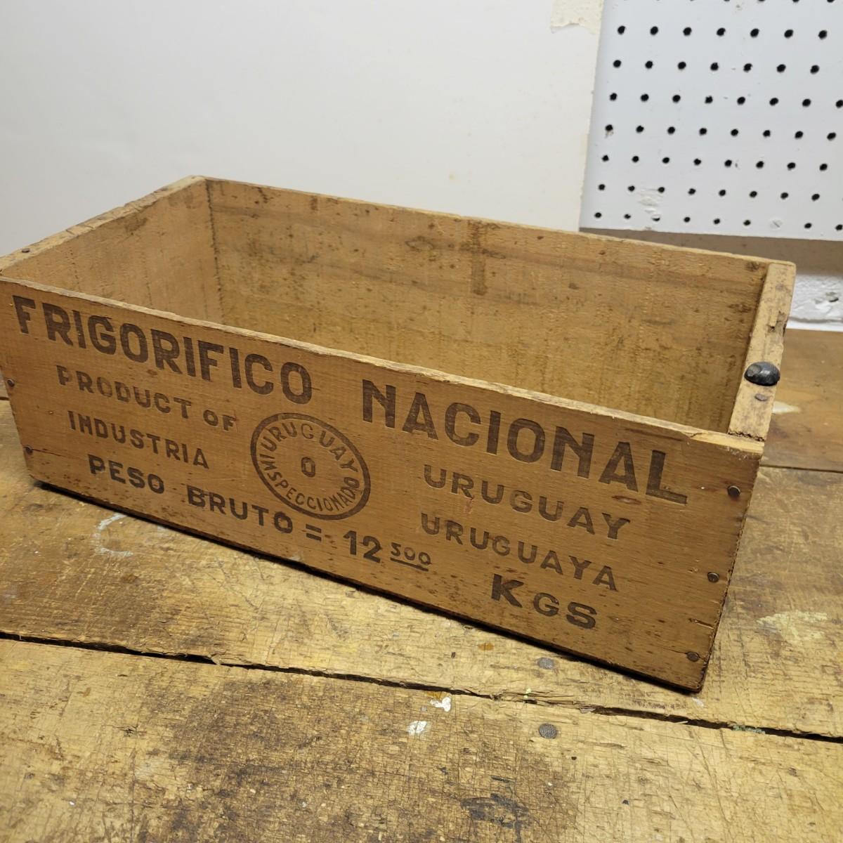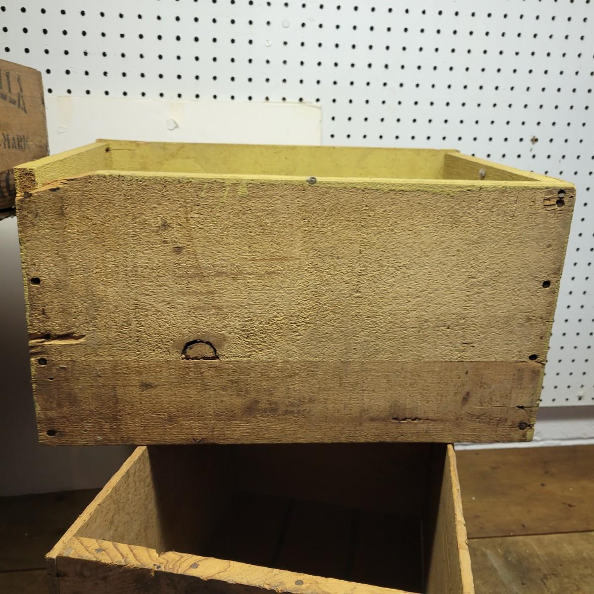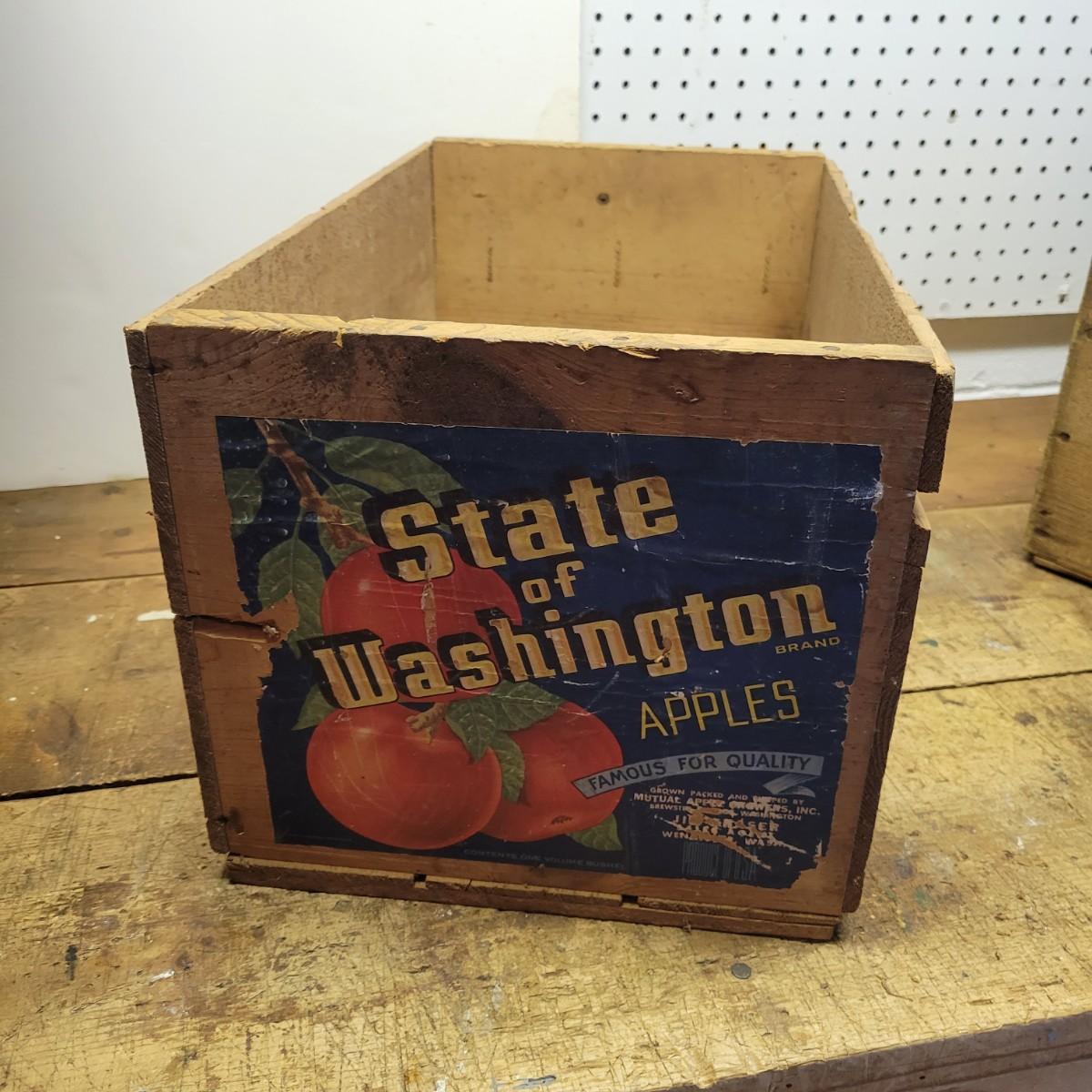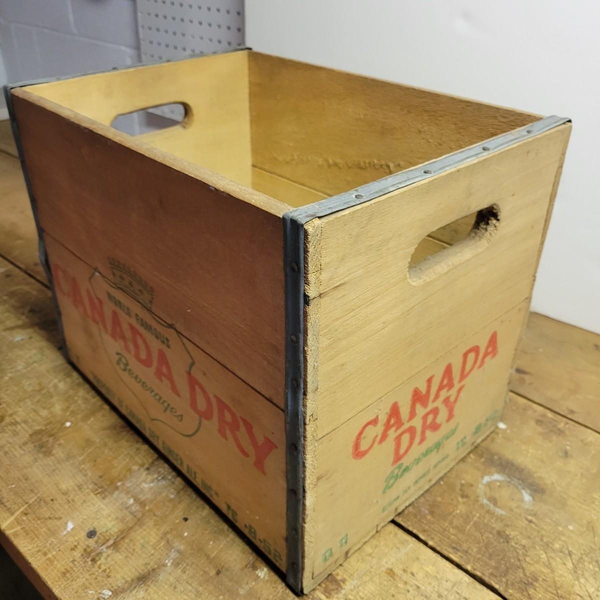 Five wooden crates in varying sizes, four appear to be vintage advertising crates. Included is a State of Washington crate, one labeled Canada Dry and another beef from Uruguay. Canada Dry crate measures approximately 16.5" x 11.5" x 12.5"H. Local pickup only