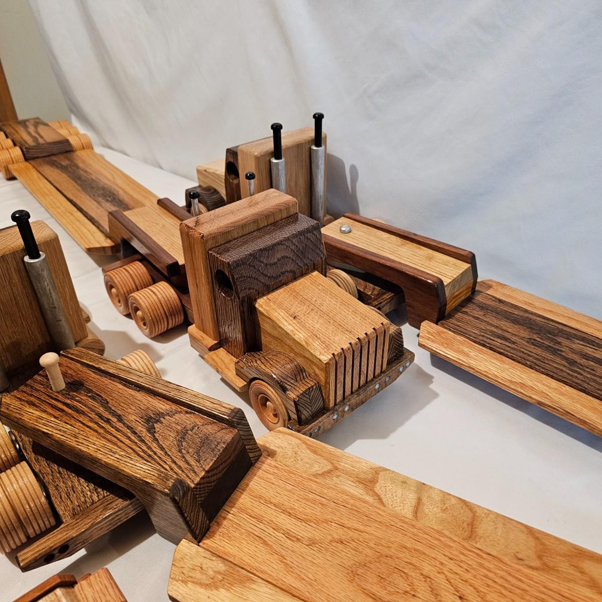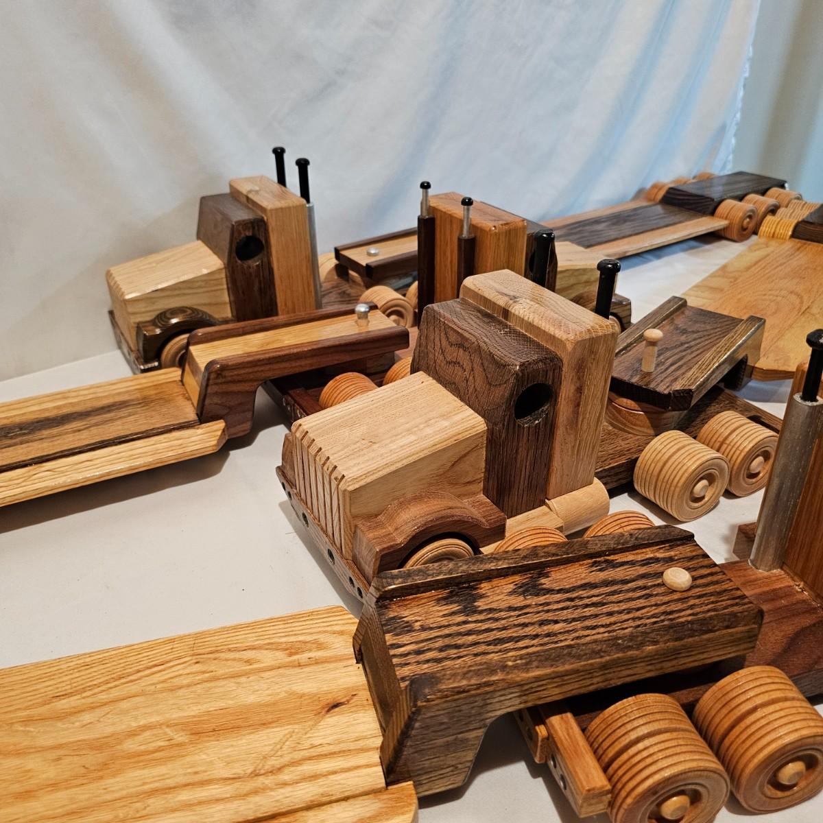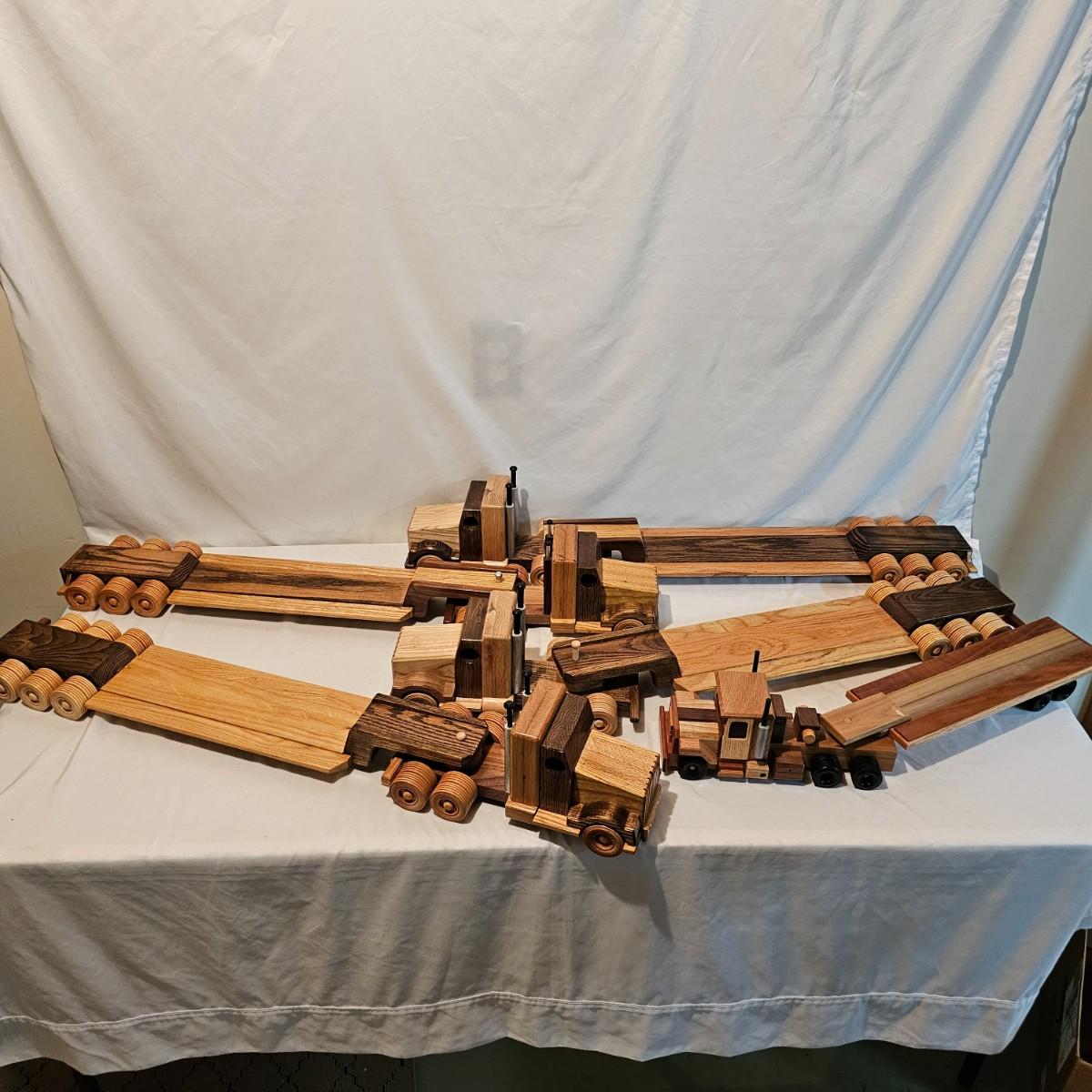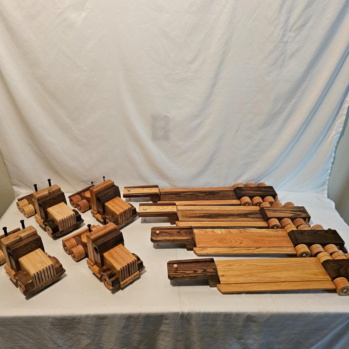 Five toy tractor trailer rigs, each with its own cab unit. Handmade out of hardwood and pine, these bug rigs have removable trailers, rotate around hitch pins. All wheels roll. Larger combos are each 6.25" x 38" x 6.5"H. Smaller set is 5" x 27" x 5.5"H. See photos for details. Local pickup only.