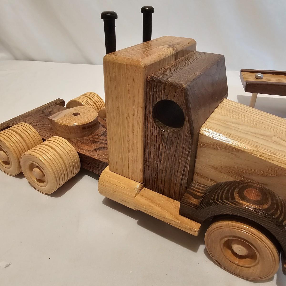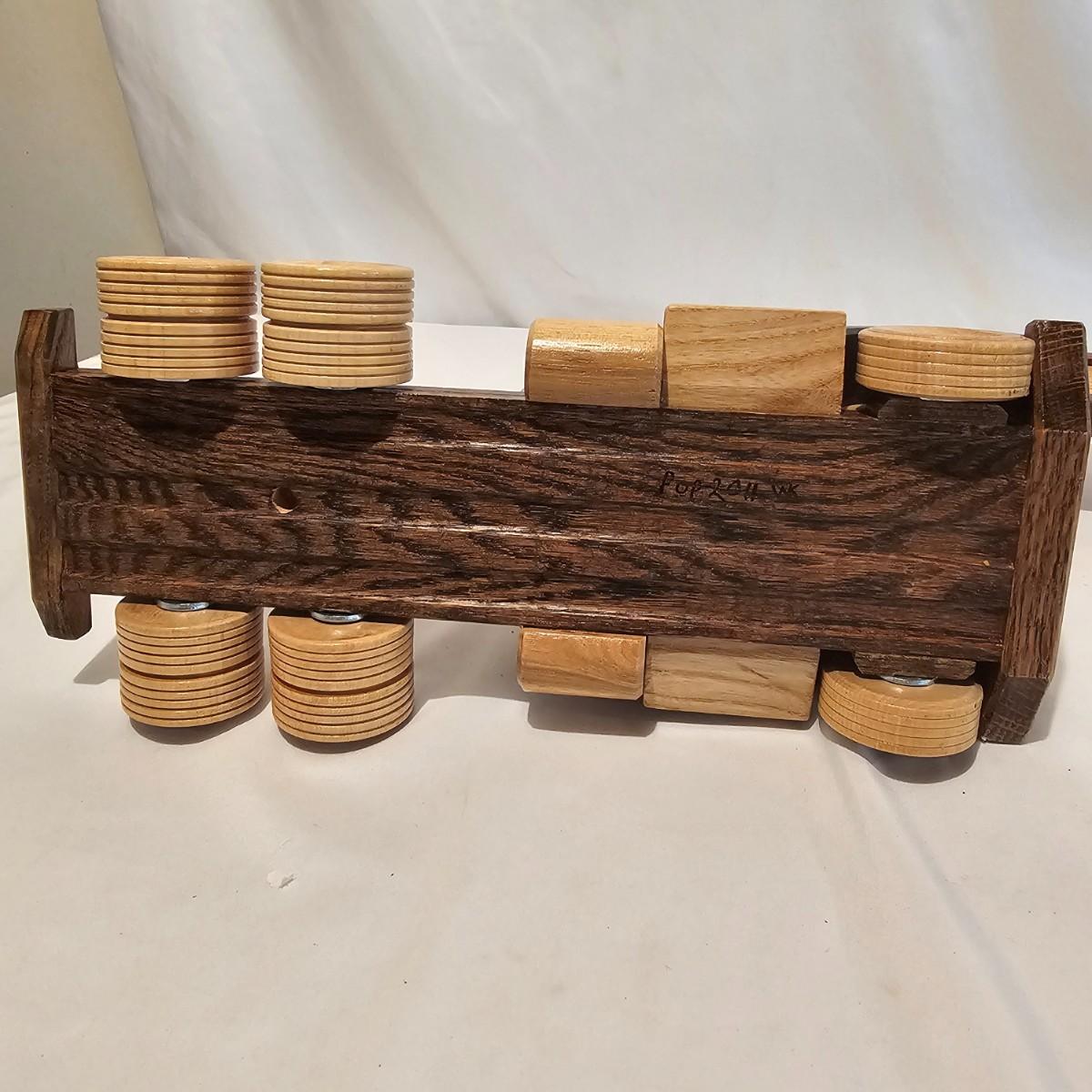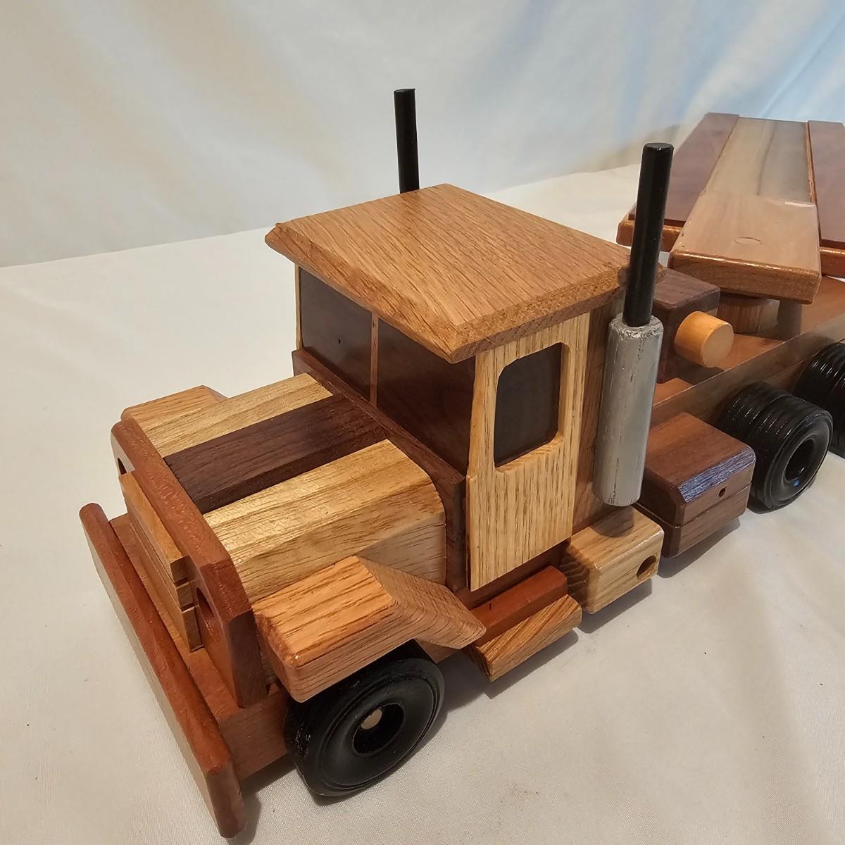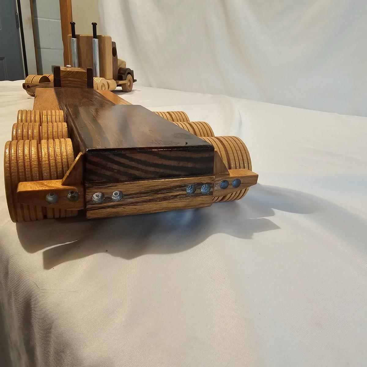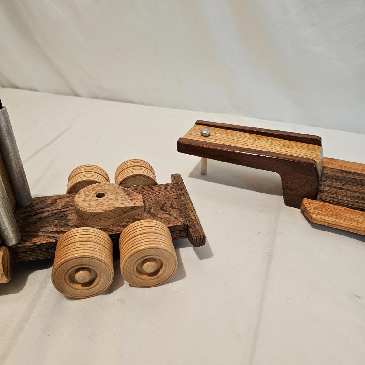 Five toy tractor trailer rigs, each with its own cab unit. Handmade out of hardwood and pine, these bug rigs have removable trailers, rotate around hitch pins. All wheels roll. Larger combos are each 6.25" x 38" x 6.5"H. Smaller set is 5" x 27" x 5.5"H. See photos for details. Local pickup only.