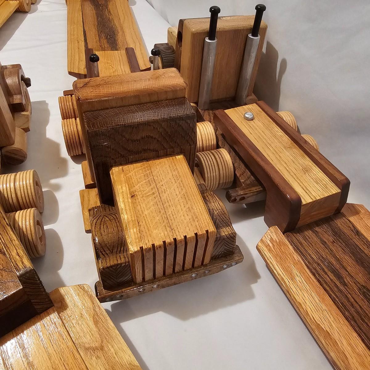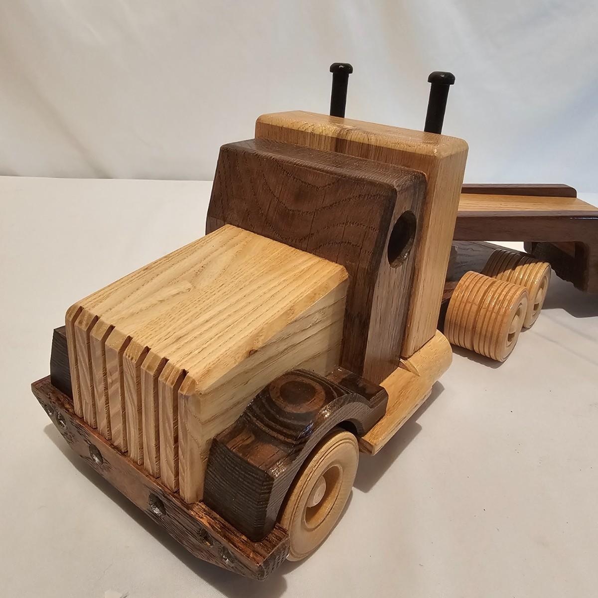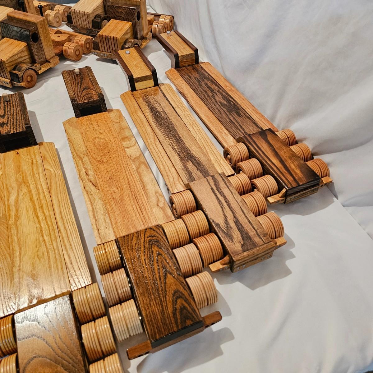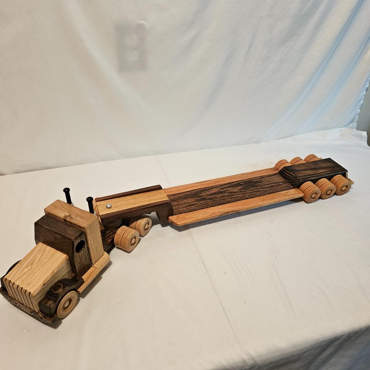 Five toy tractor trailer rigs, each with its own cab unit. Handmade out of hardwood and pine, these bug rigs have removable trailers, rotate around hitch pins. All wheels roll. Larger combos are each 6.25" x 38" x 6.5"H. Smaller set is 5" x 27" x 5.5"H. See photos for details. Local pickup only.
