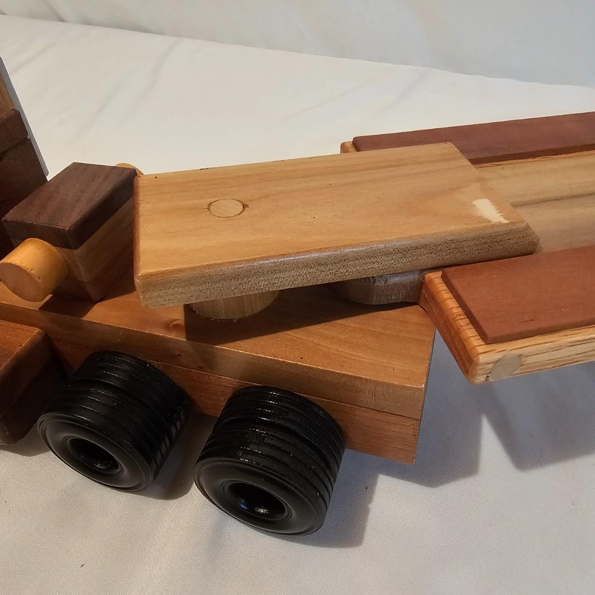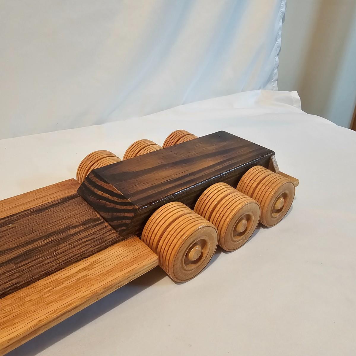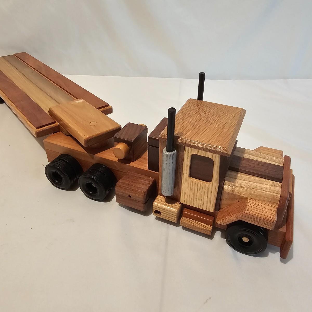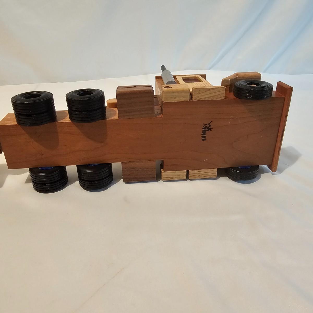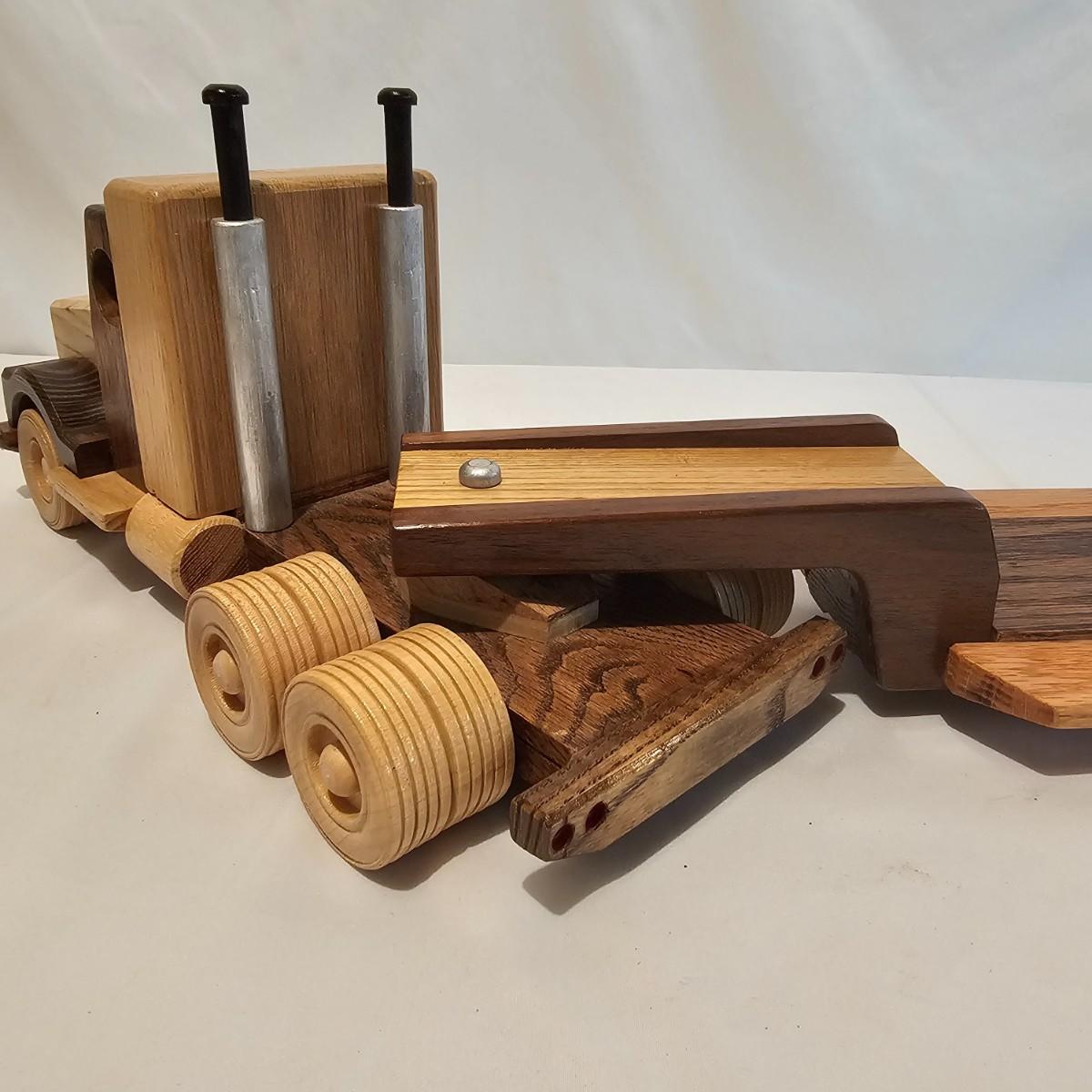Five toy tractor trailer rigs, each with its own cab unit. Handmade out of hardwood and pine, these bug rigs have removable trailers, rotate around hitch pins. All wheels roll. Larger combos are each 6.25" x 38" x 6.5"H. Smaller set is 5" x 27" x 5.5"H. See photos for details. Local pickup only.