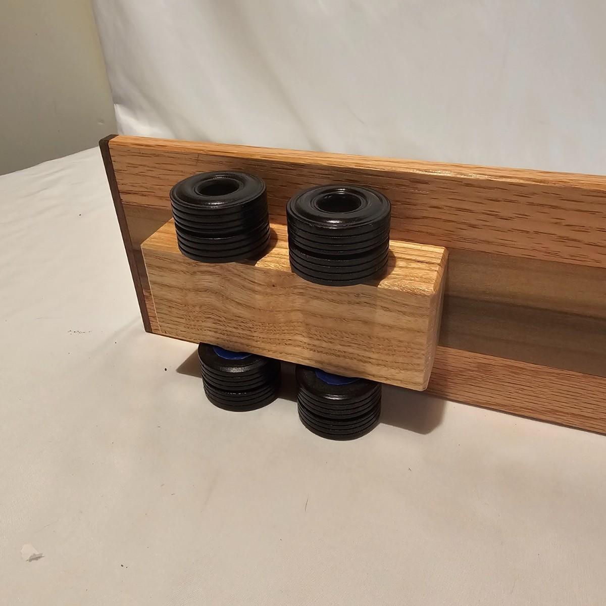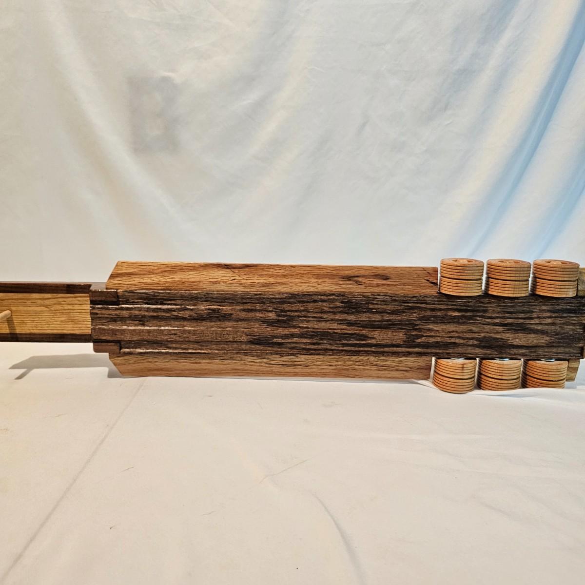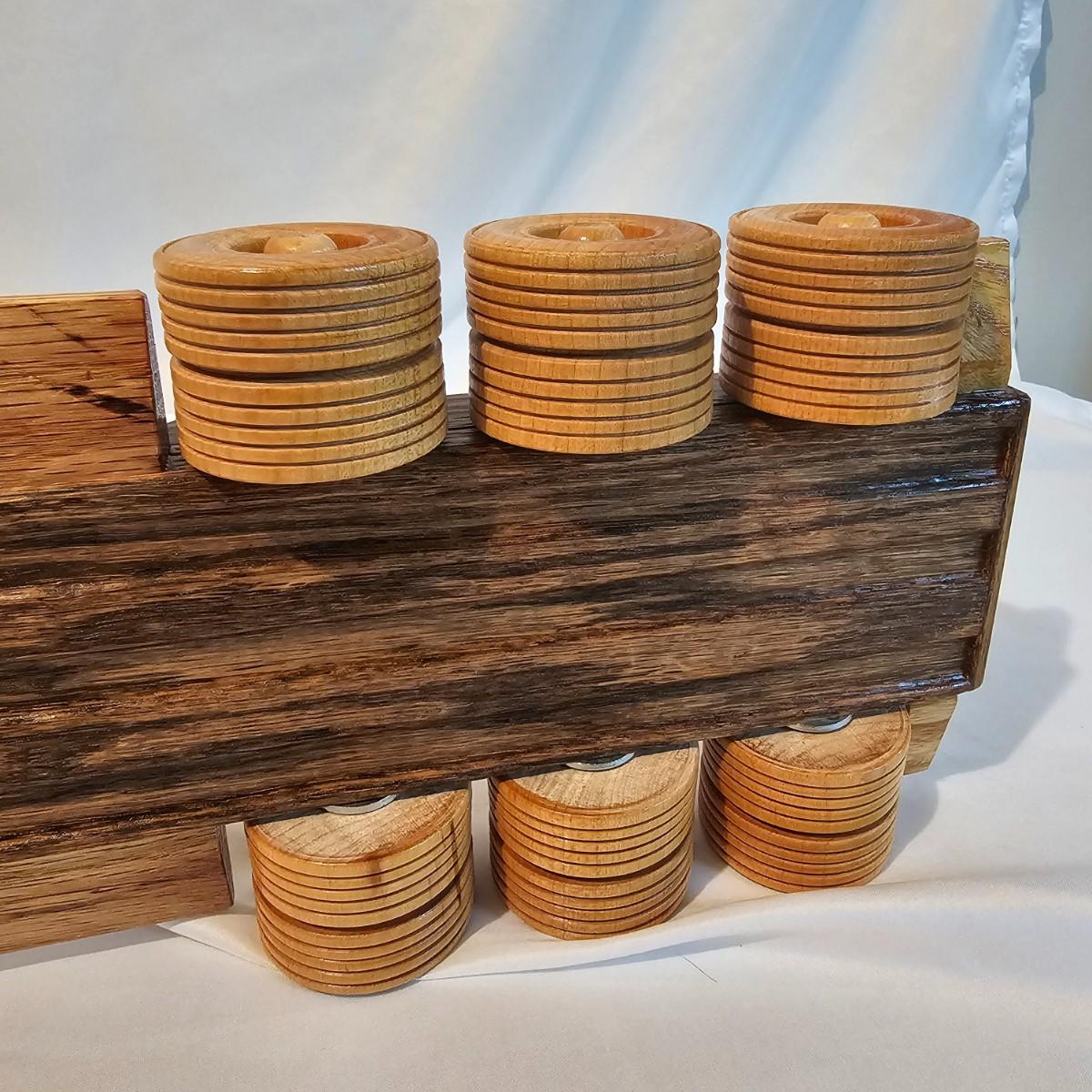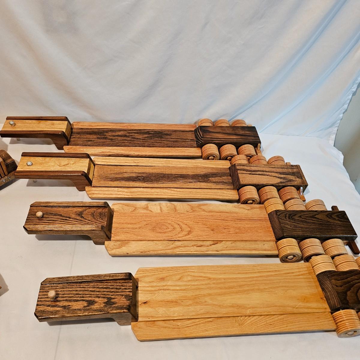 Five toy tractor trailer rigs, each with its own cab unit. Handmade out of hardwood and pine, these bug rigs have removable trailers, rotate around hitch pins. All wheels roll. Larger combos are each 6.25" x 38" x 6.5"H. Smaller set is 5" x 27" x 5.5"H. See photos for details. Local pickup only.