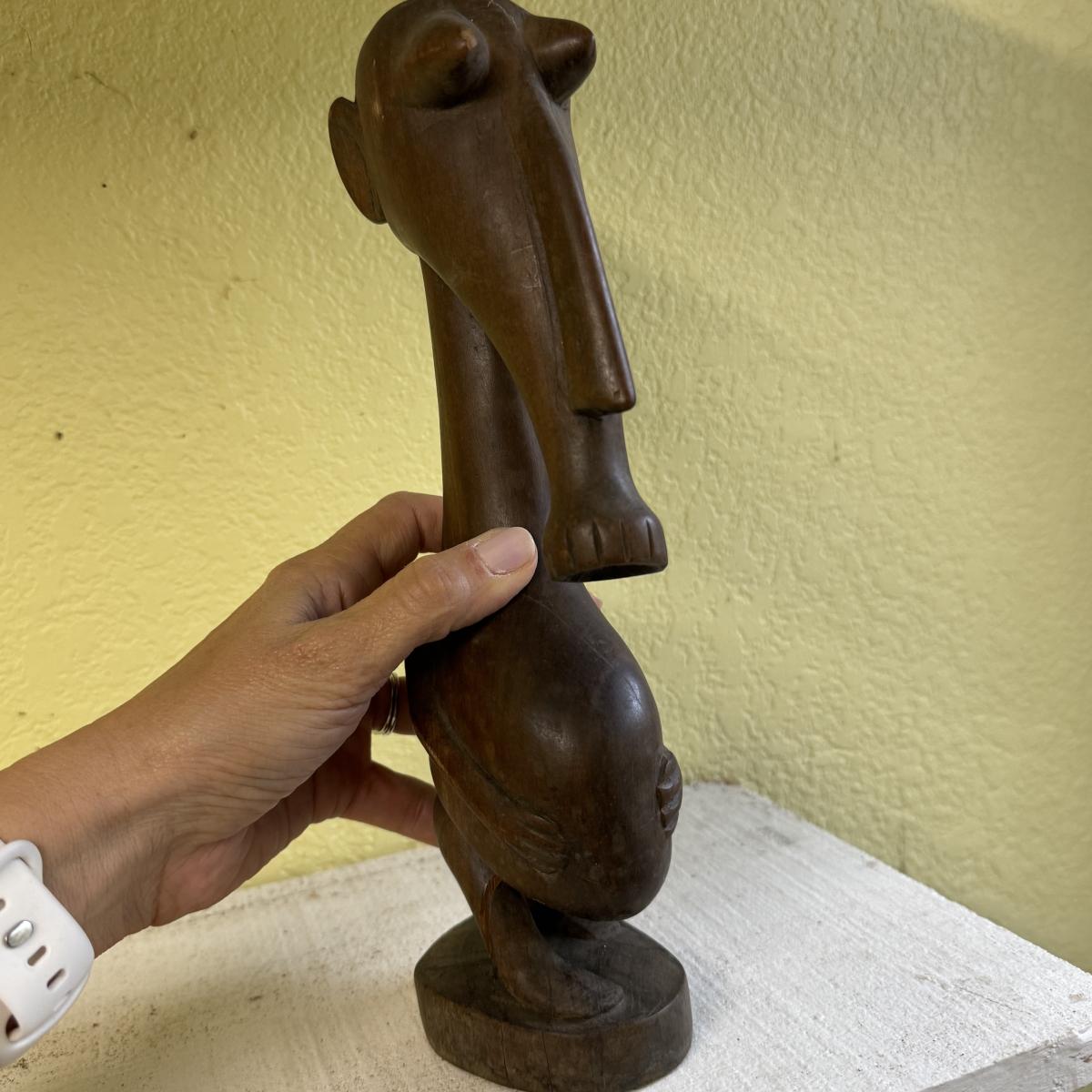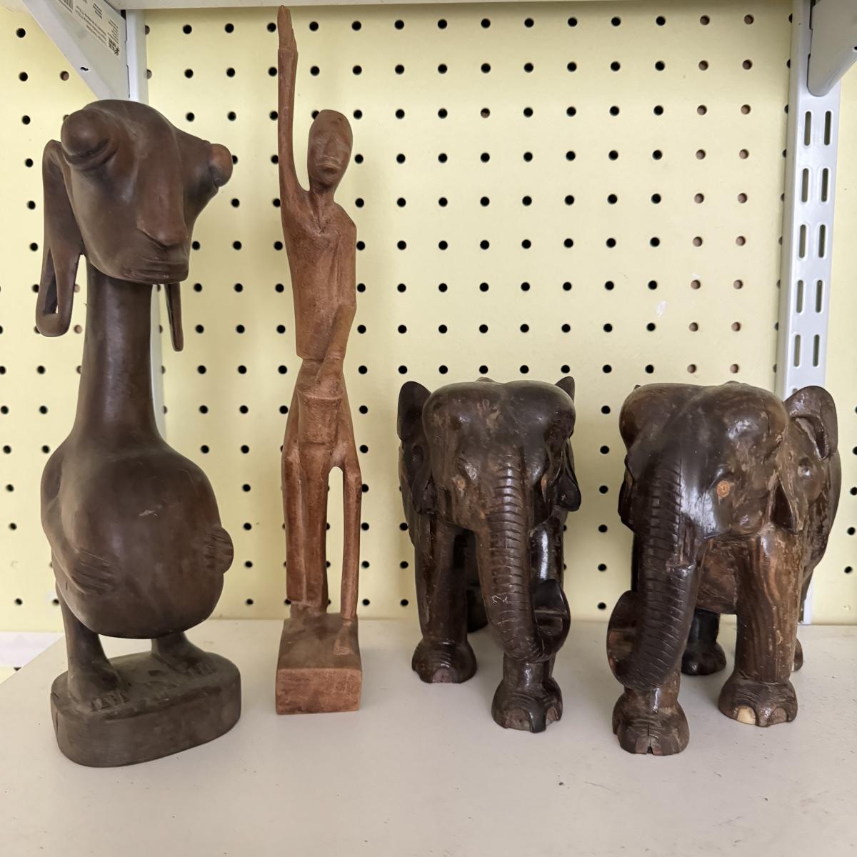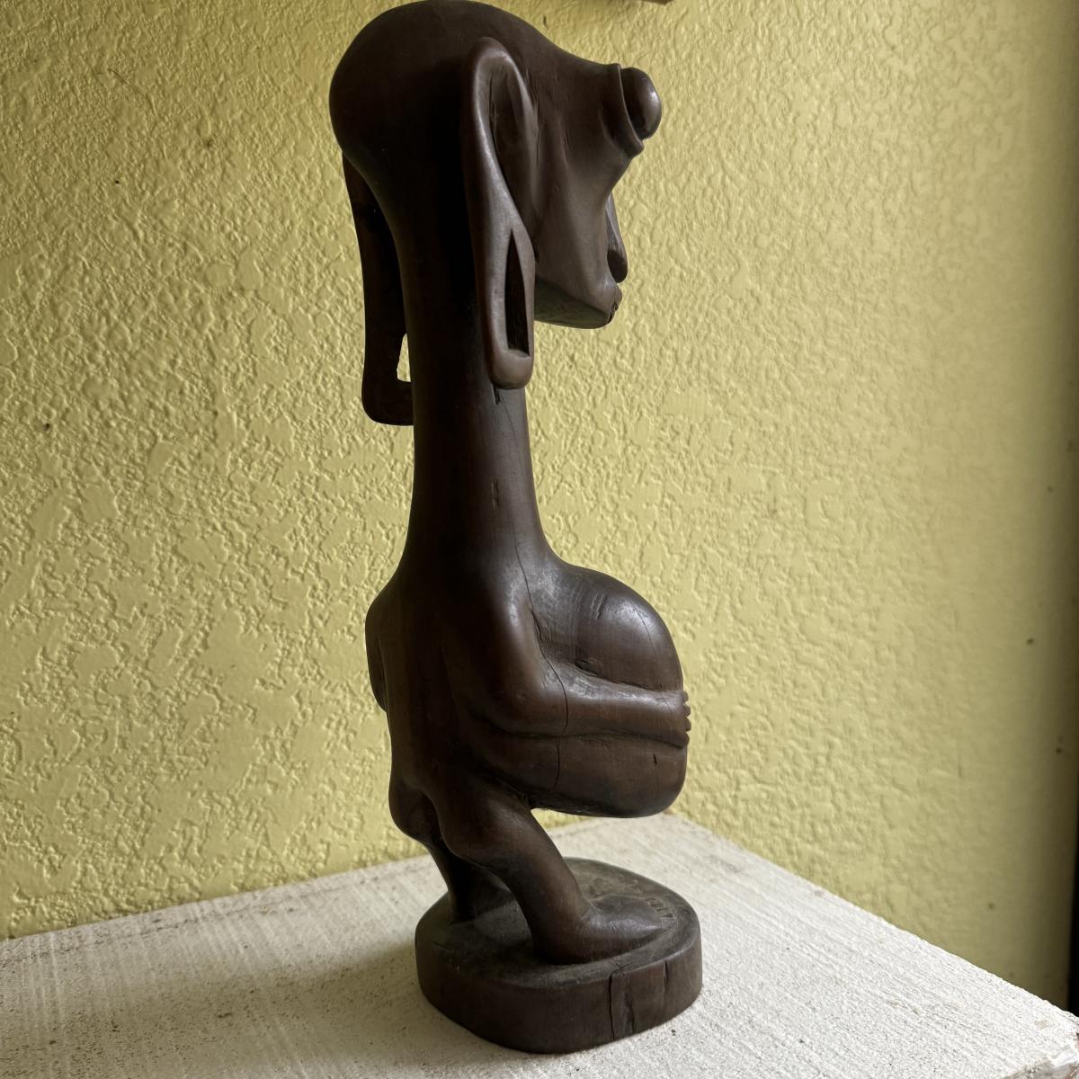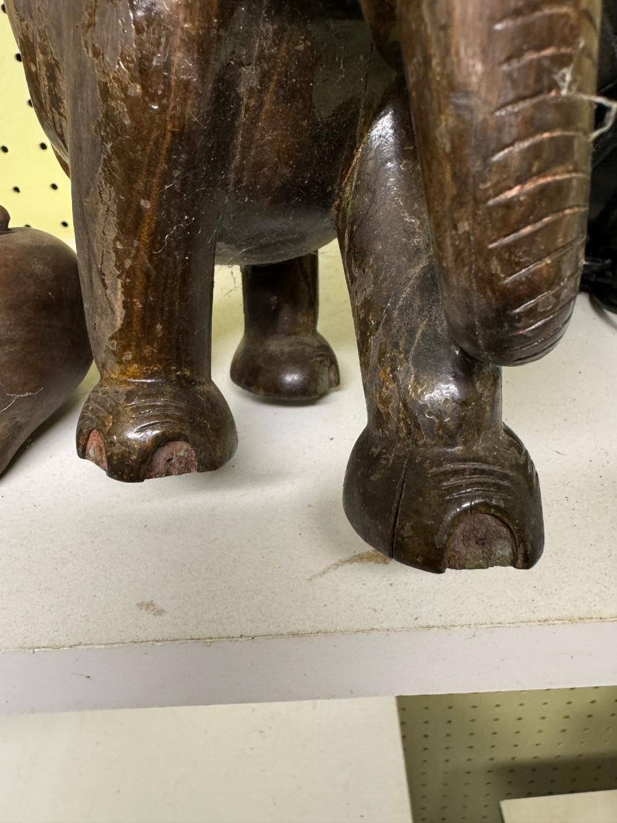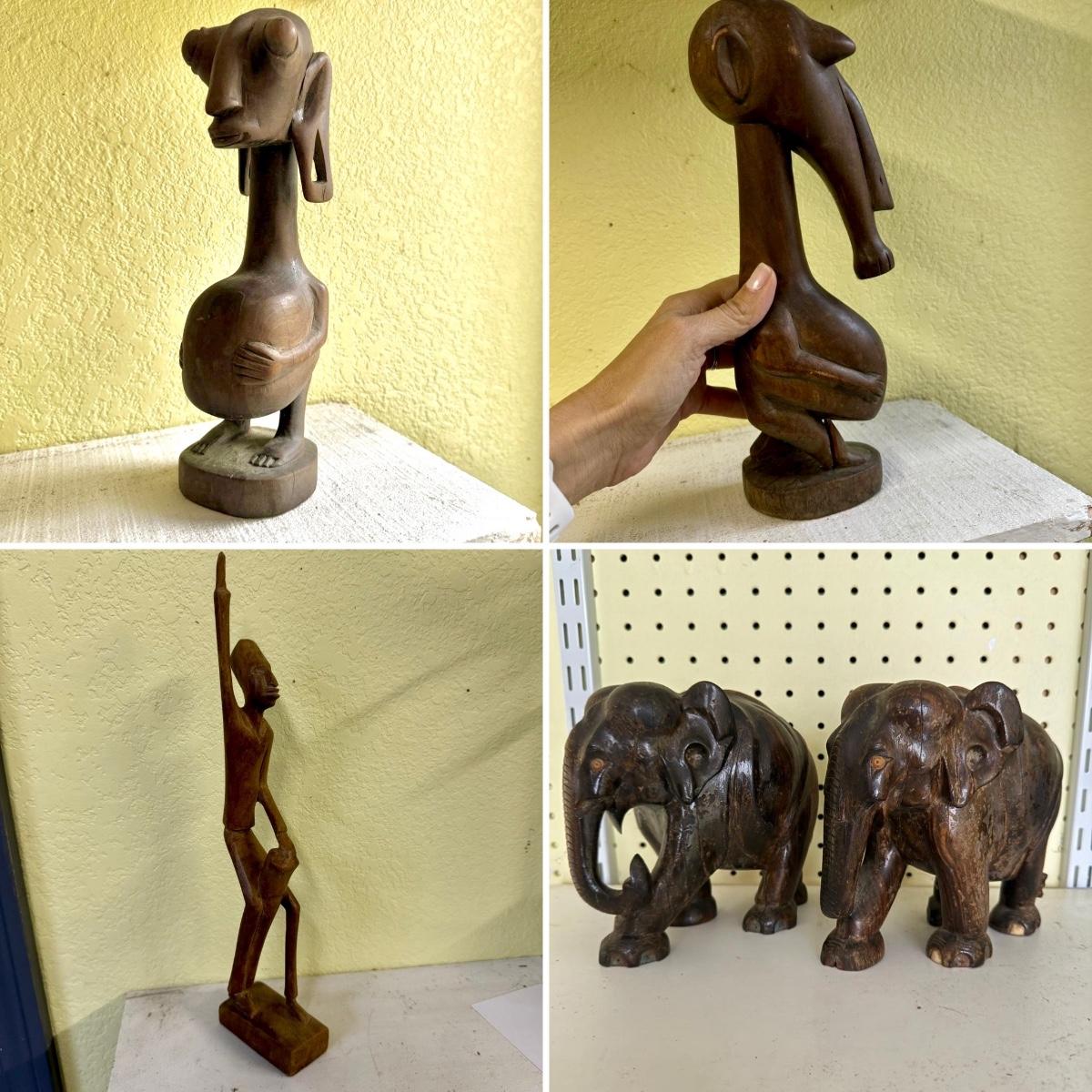 An eclectic collection of wooden statues. Includes a man banging a drum, two pregnant looking people and a pair of elephants (tusks missing and glaze on wood is coming off). One of the wooden people is broken at the base. It appears that it can be glued back together and too fun of a piece to not include! Man with drum measures 13.5” tall and elephants measure 6” tall. The people are a bit heavier than they appear. Unknown wood. Shipping available