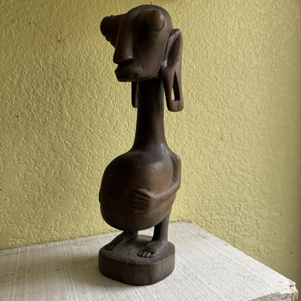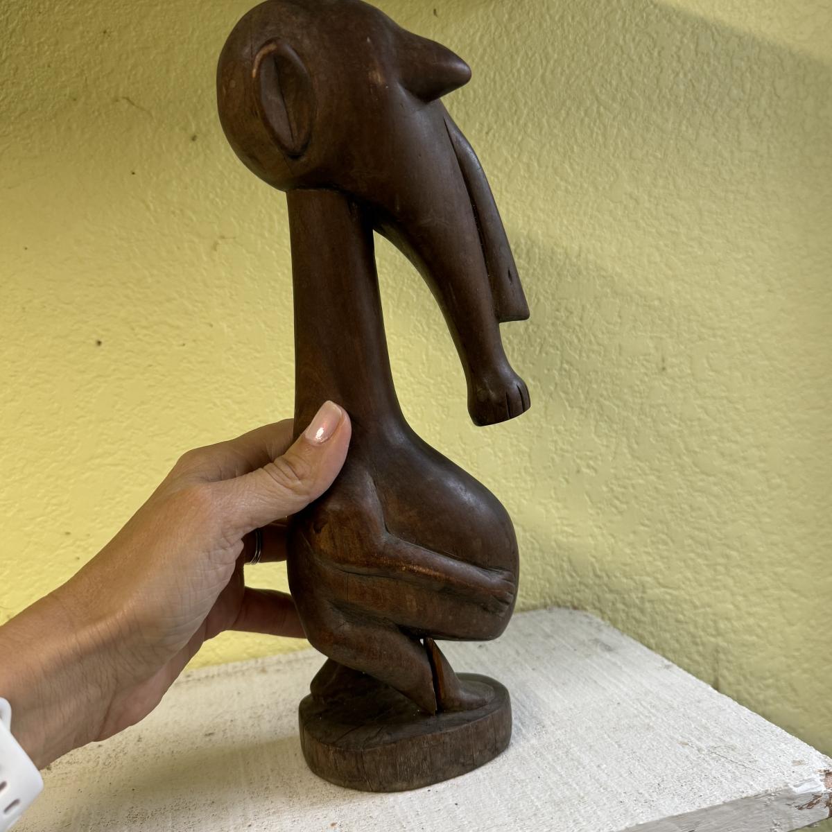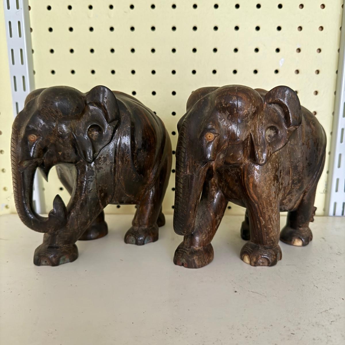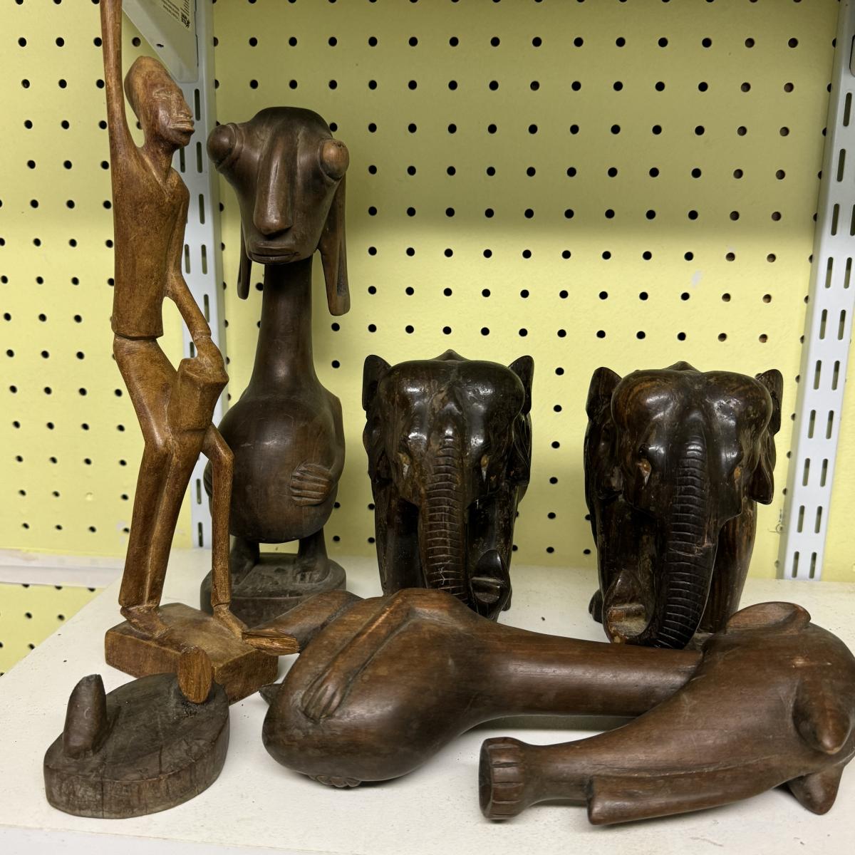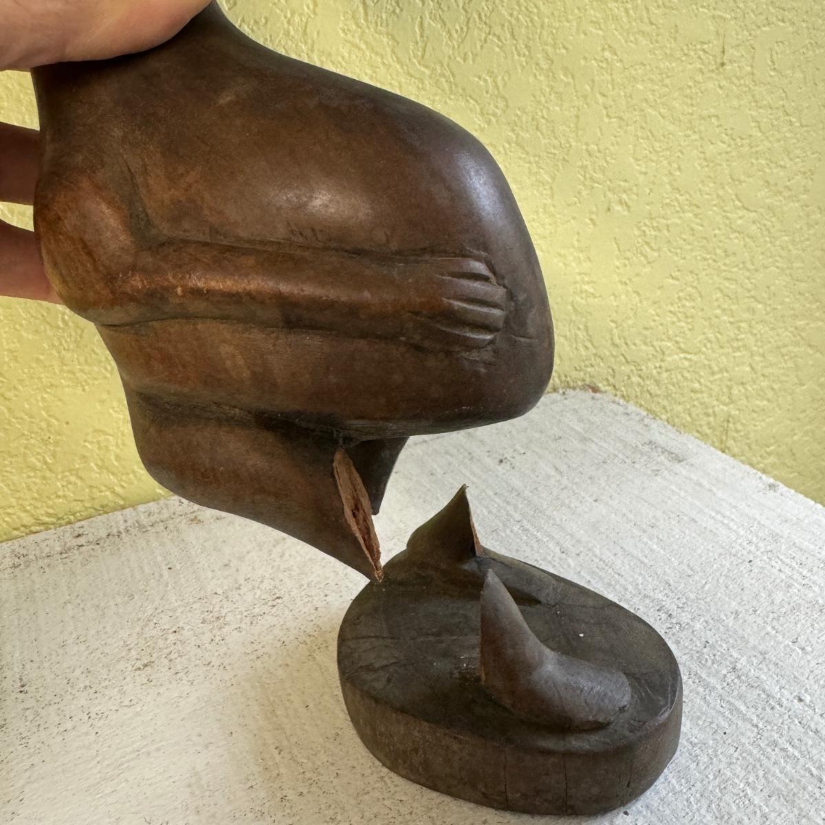 An eclectic collection of wooden statues. Includes a man banging a drum, two pregnant looking people and a pair of elephants (tusks missing and glaze on wood is coming off). One of the wooden people is broken at the base. It appears that it can be glued back together and too fun of a piece to not include! Man with drum measures 13.5” tall and elephants measure 6” tall. The people are a bit heavier than they appear. Unknown wood. Shipping available