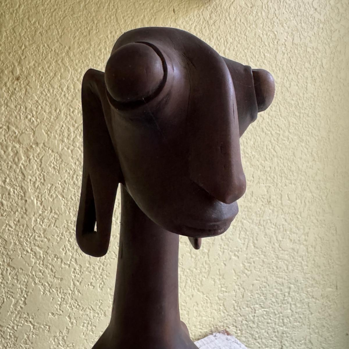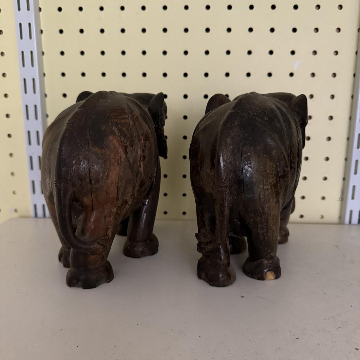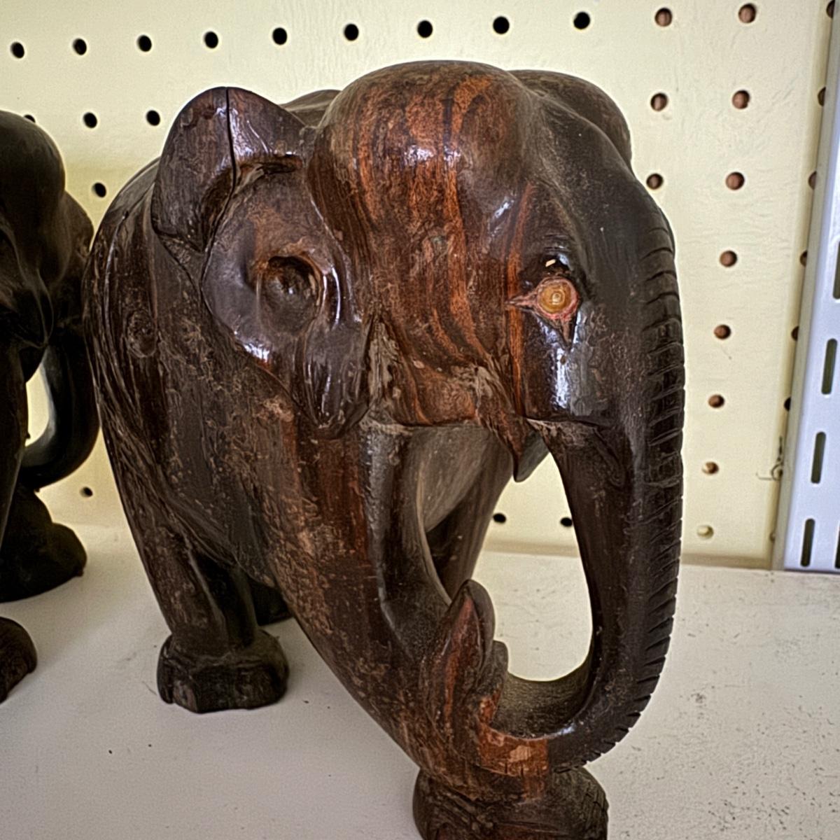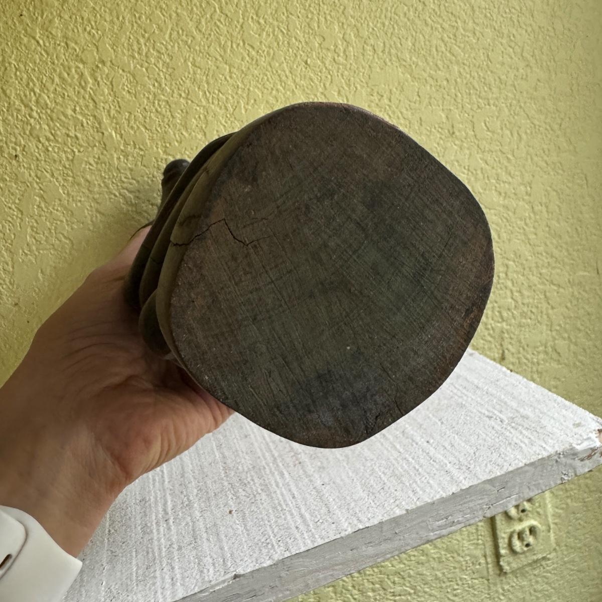 An eclectic collection of wooden statues. Includes a man banging a drum, two pregnant looking people and a pair of elephants (tusks missing and glaze on wood is coming off). One of the wooden people is broken at the base. It appears that it can be glued back together and too fun of a piece to not include! Man with drum measures 13.5” tall and elephants measure 6” tall. The people are a bit heavier than they appear. Unknown wood. Shipping available