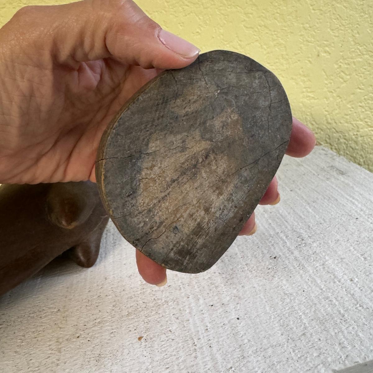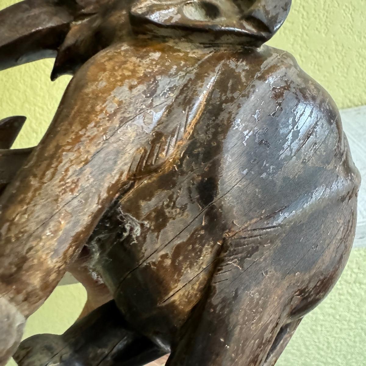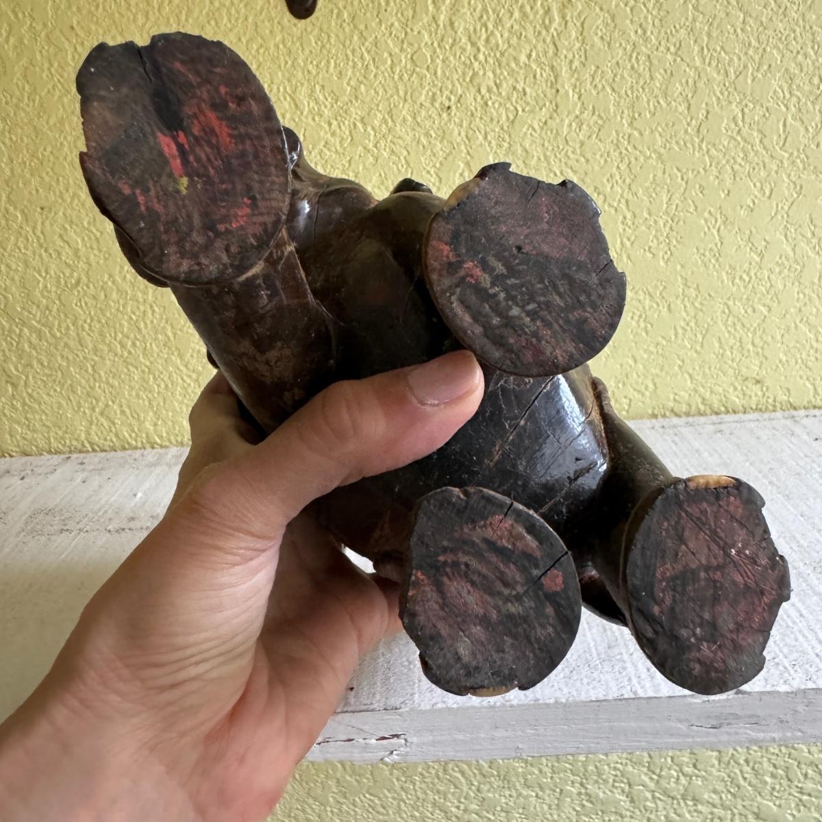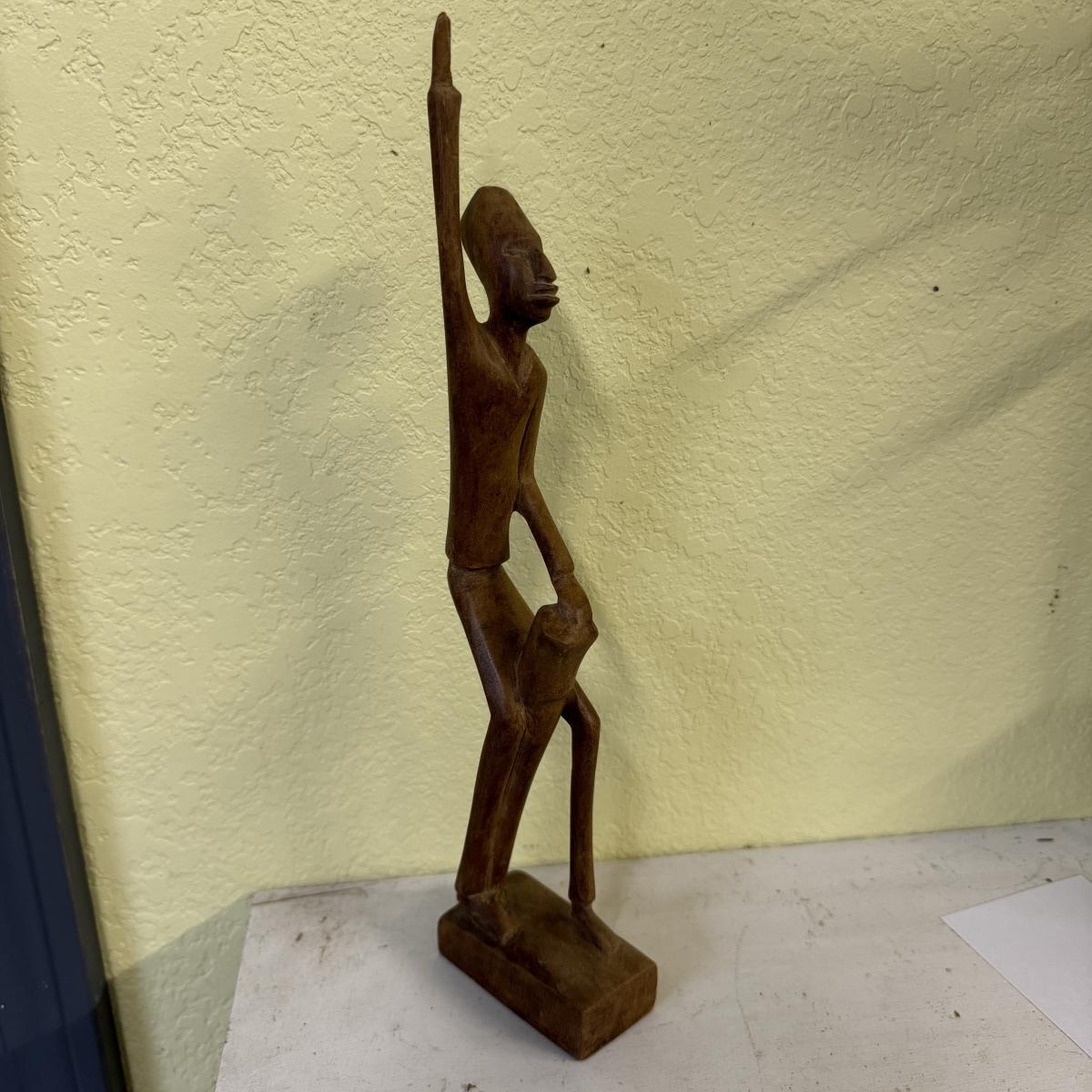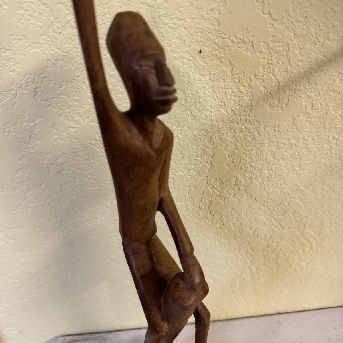 An eclectic collection of wooden statues. Includes a man banging a drum, two pregnant looking people and a pair of elephants (tusks missing and glaze on wood is coming off). One of the wooden people is broken at the base. It appears that it can be glued back together and too fun of a piece to not include! Man with drum measures 13.5” tall and elephants measure 6” tall. The people are a bit heavier than they appear. Unknown wood. Shipping available
