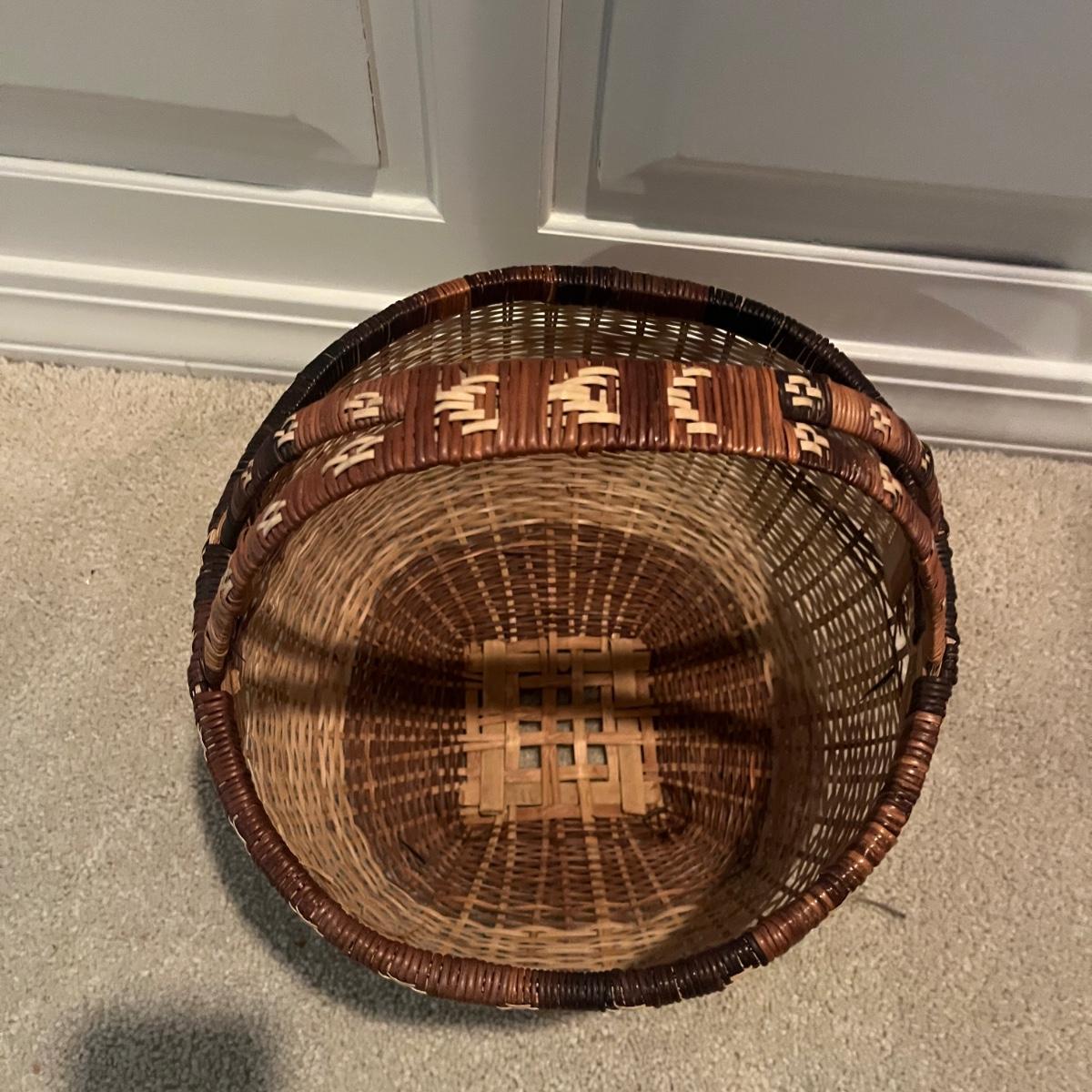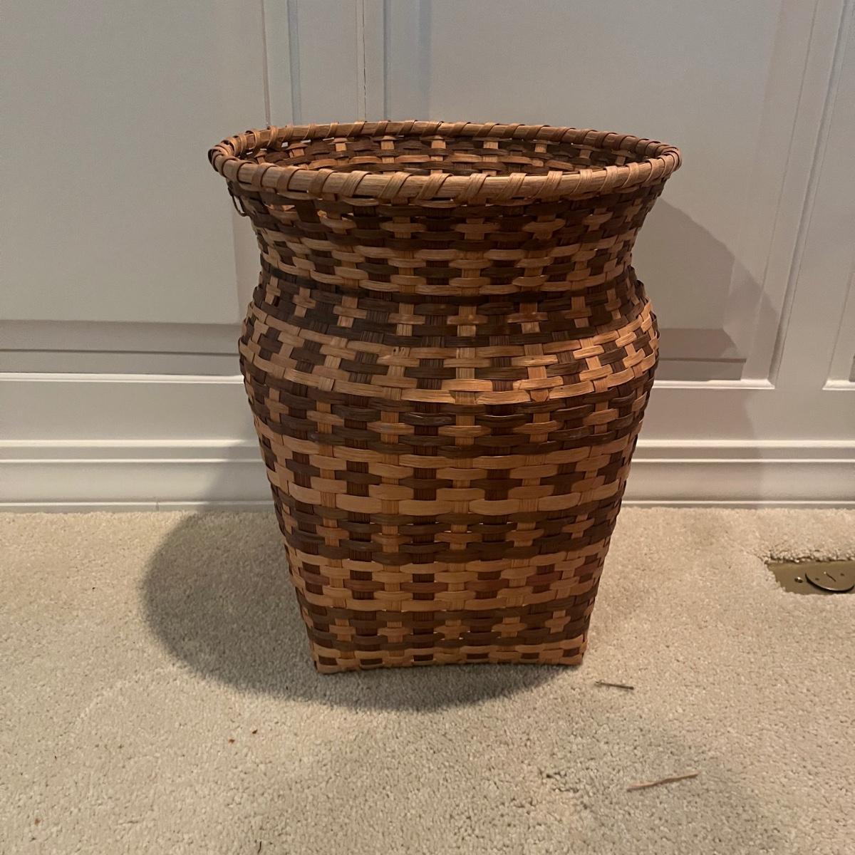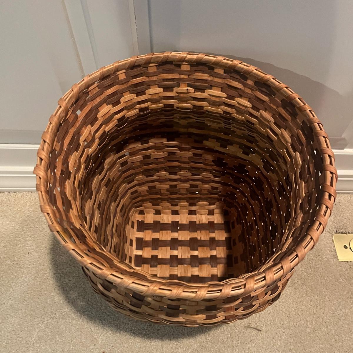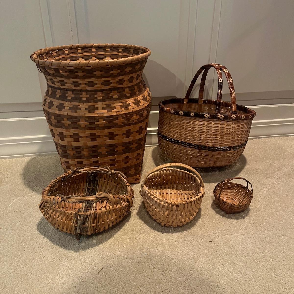 Lot includes five woven wicker baskets in a variety of sizes and shapes with the largest measuring 13”D x 16”H.