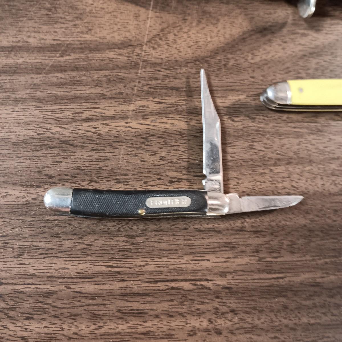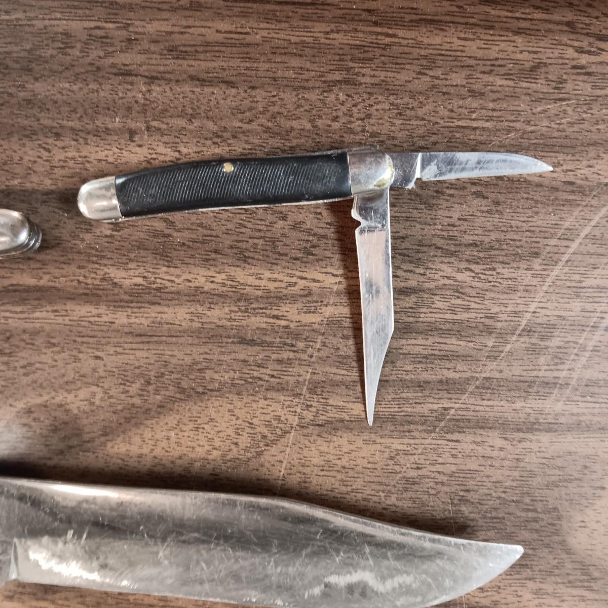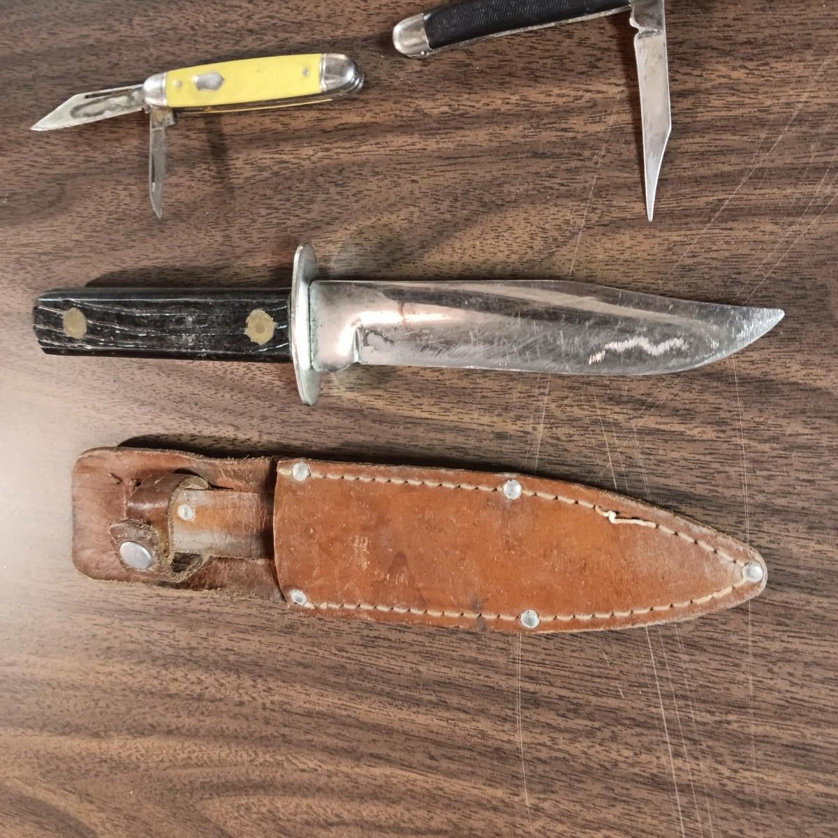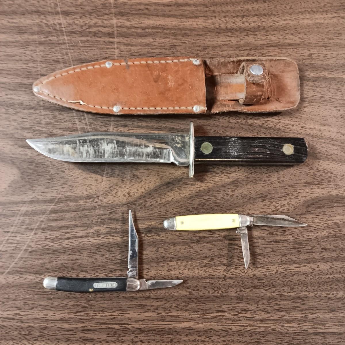 FIXED BLADE KNIFE WITH LEATHER SHEATH AND 2 POCKET KNIVES