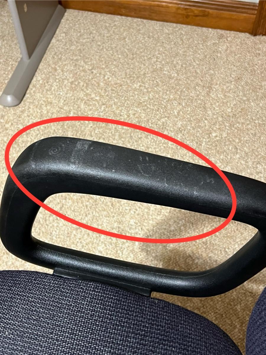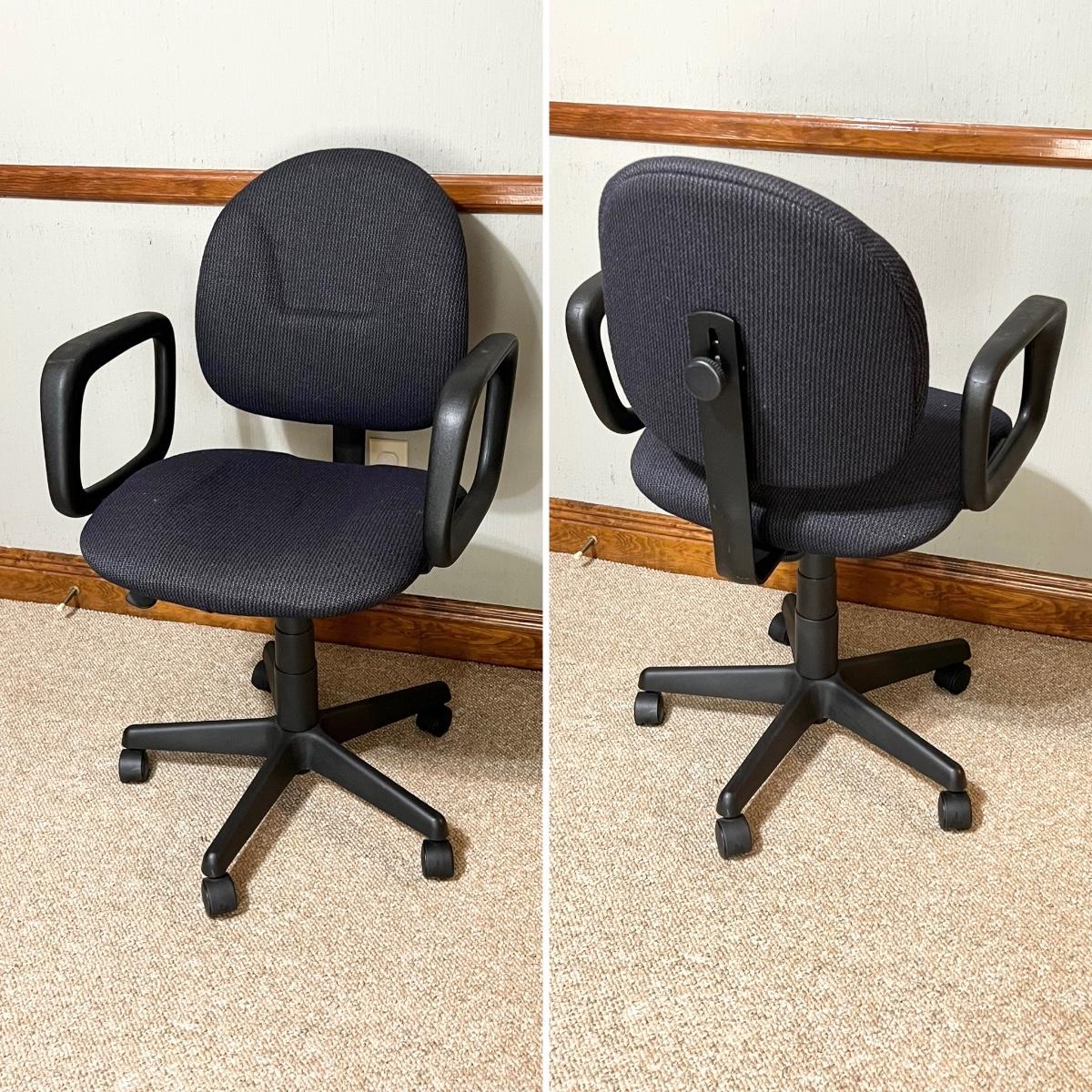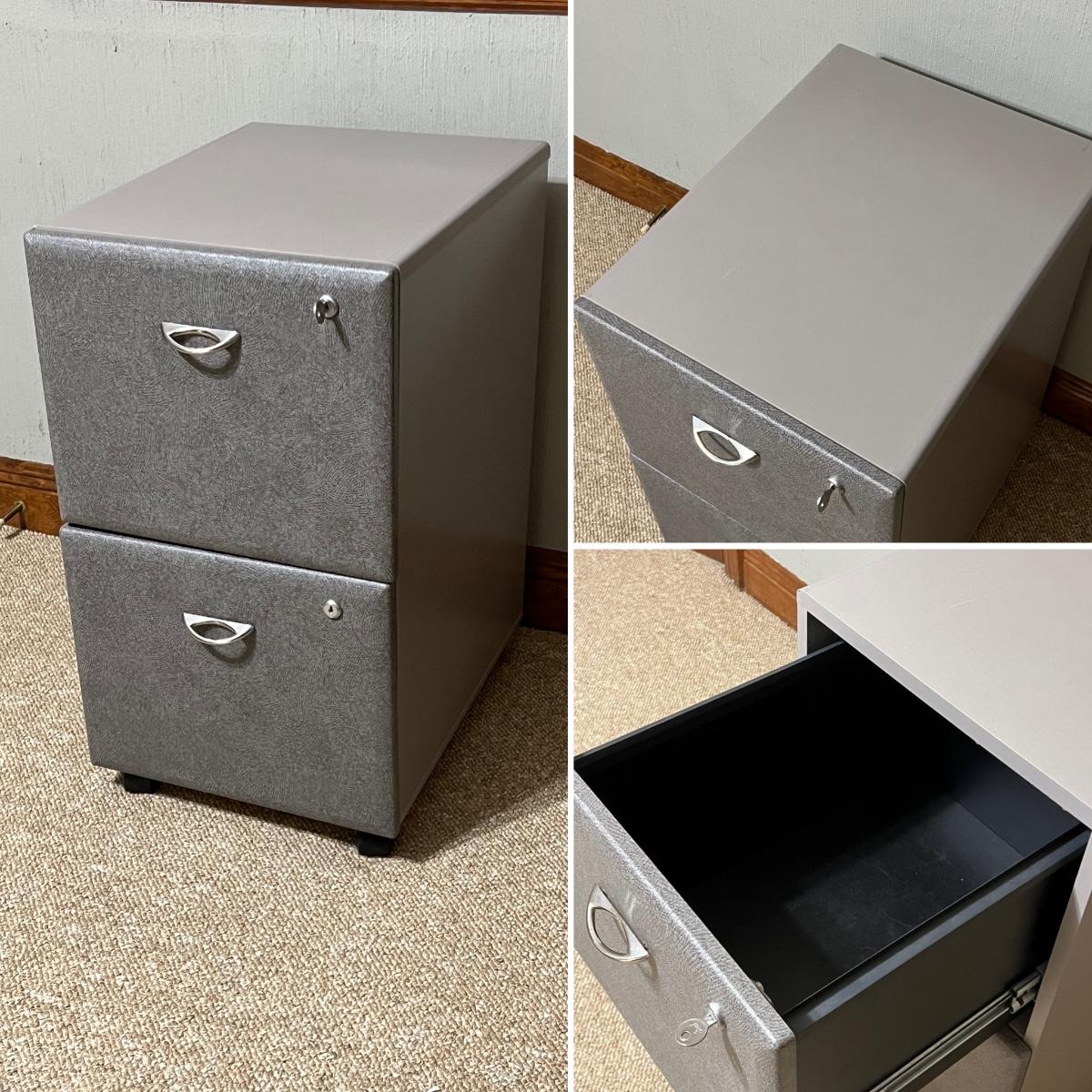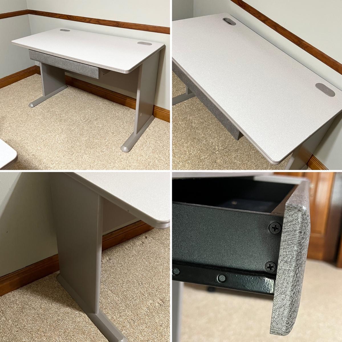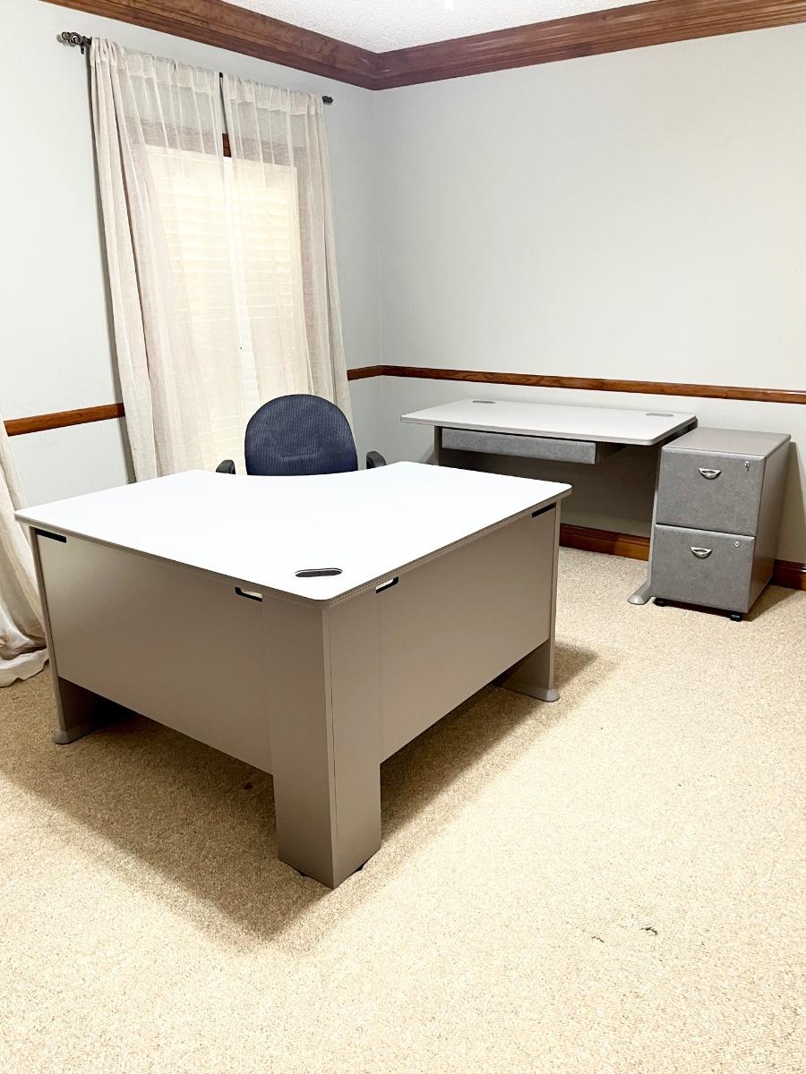 Includes: 2 desks, adjustable office chair, & filing cabinet ~ All drawers slide easily ~ Filing cabinet & office chair have wheels, both roll easy ~ Filing cabinet only hangs letter paper, does have hardware to hang files ~ Chair does have some fading writing on one of the arms, see photos ~ Rectangle desk with drawer = 29” H x 47.5” W x 27” D ~ Desk with chair cutout = 29” H x 47” Square ~ Office chair highest setting = 37” H x 24” W ~ 21” D, Seat to floor = 21” H ~ Lowest setting seat to floor = 15” H ~ Filing cabinet = 27.5” H x 16” W x 20.5” D