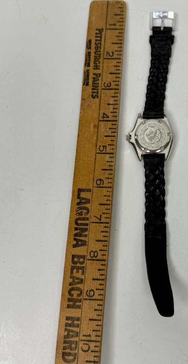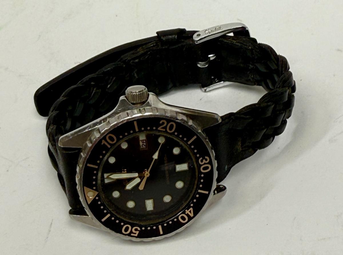 Rotating bezel, date window. Leather band. Not running, most likely needs a new battery.