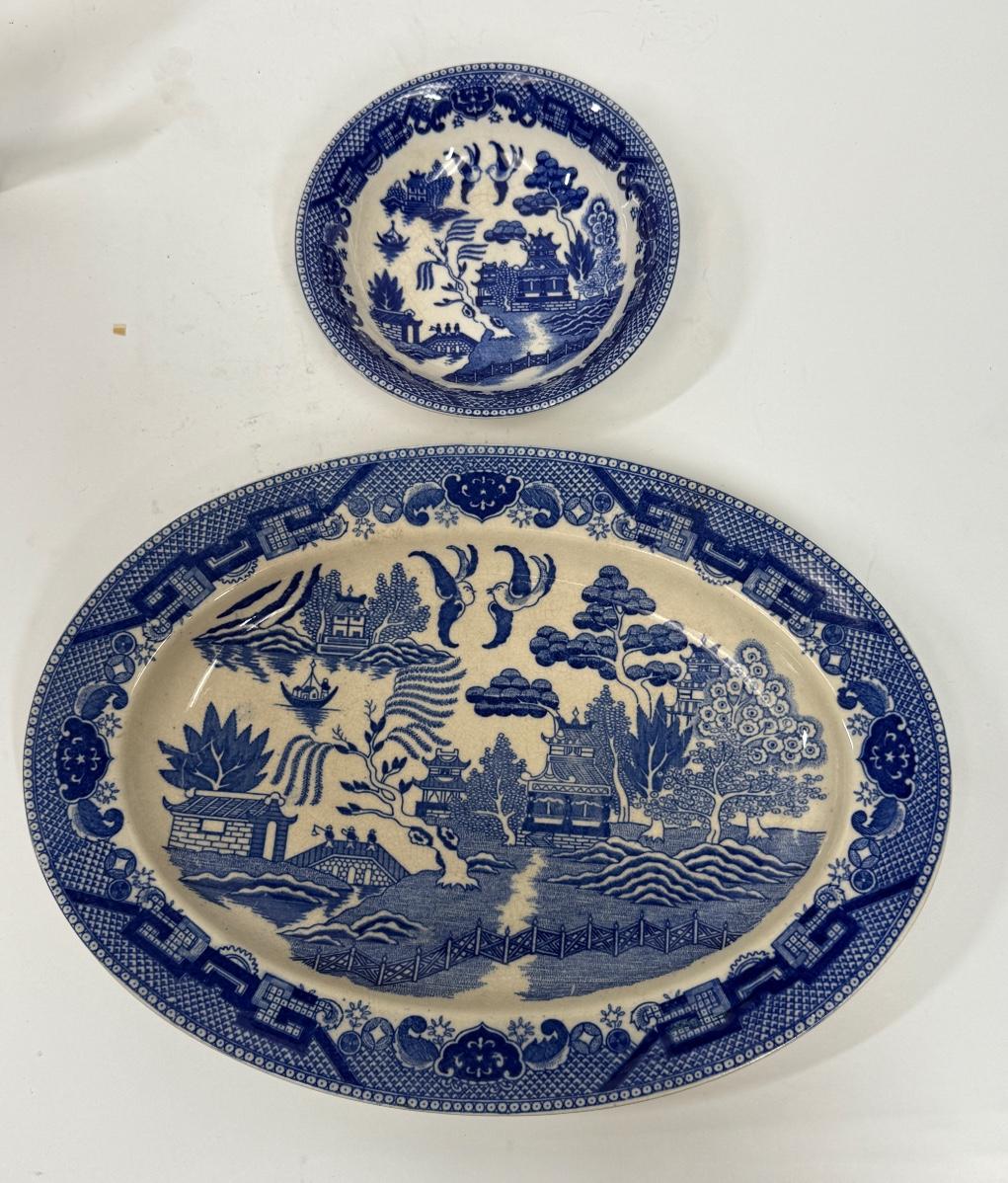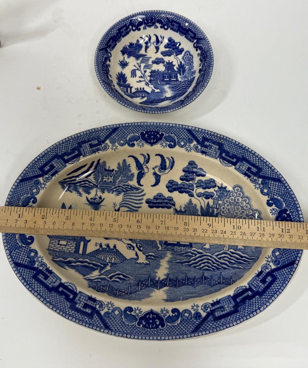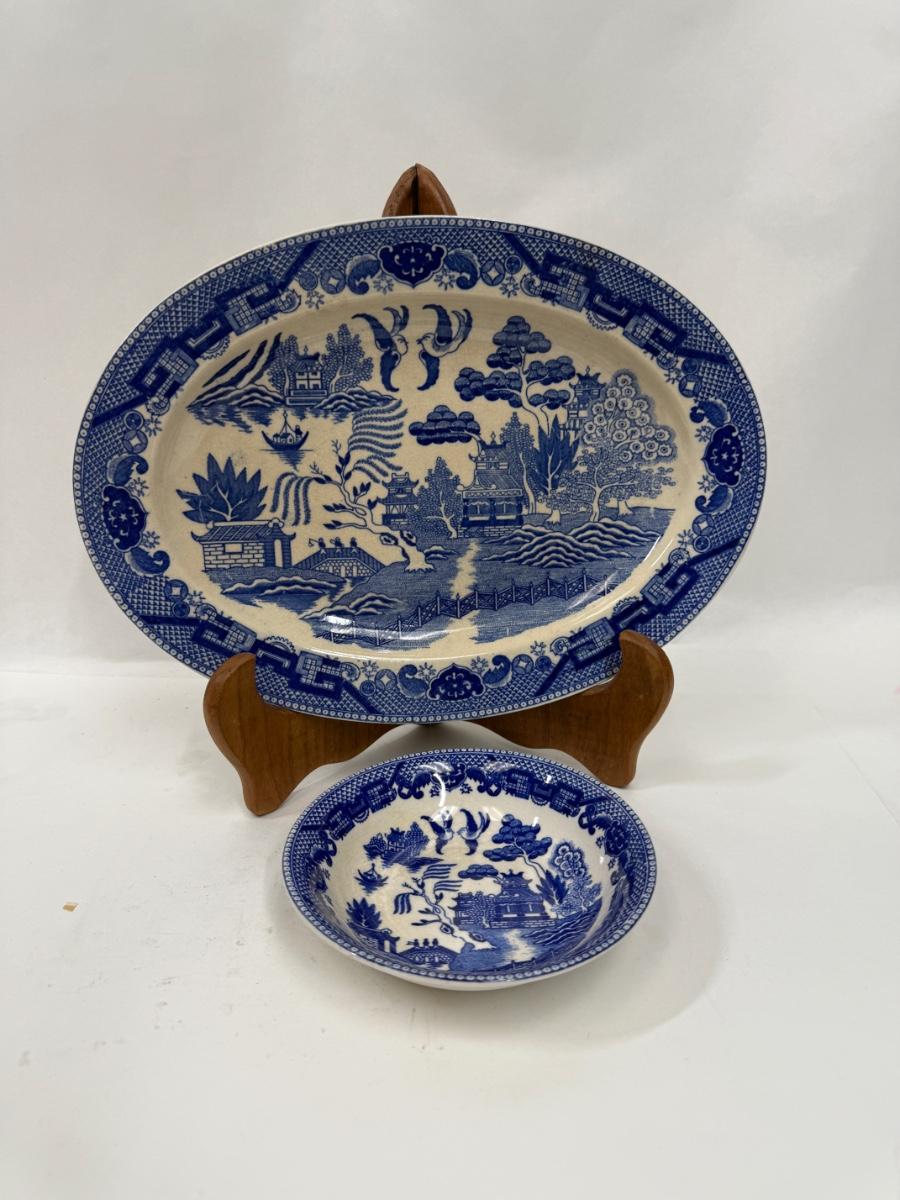 Vintage Blue Willow Porcelain Oval Platter and Round Bowl