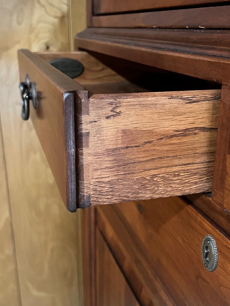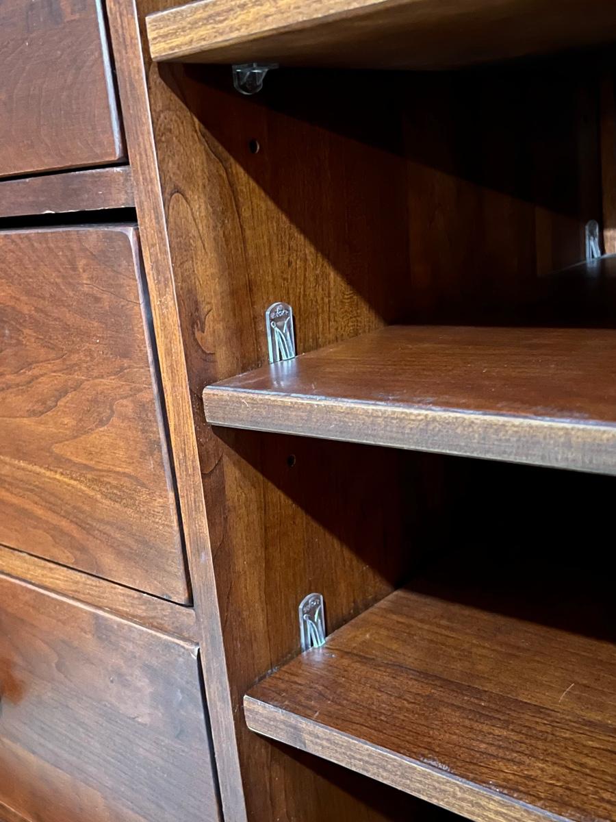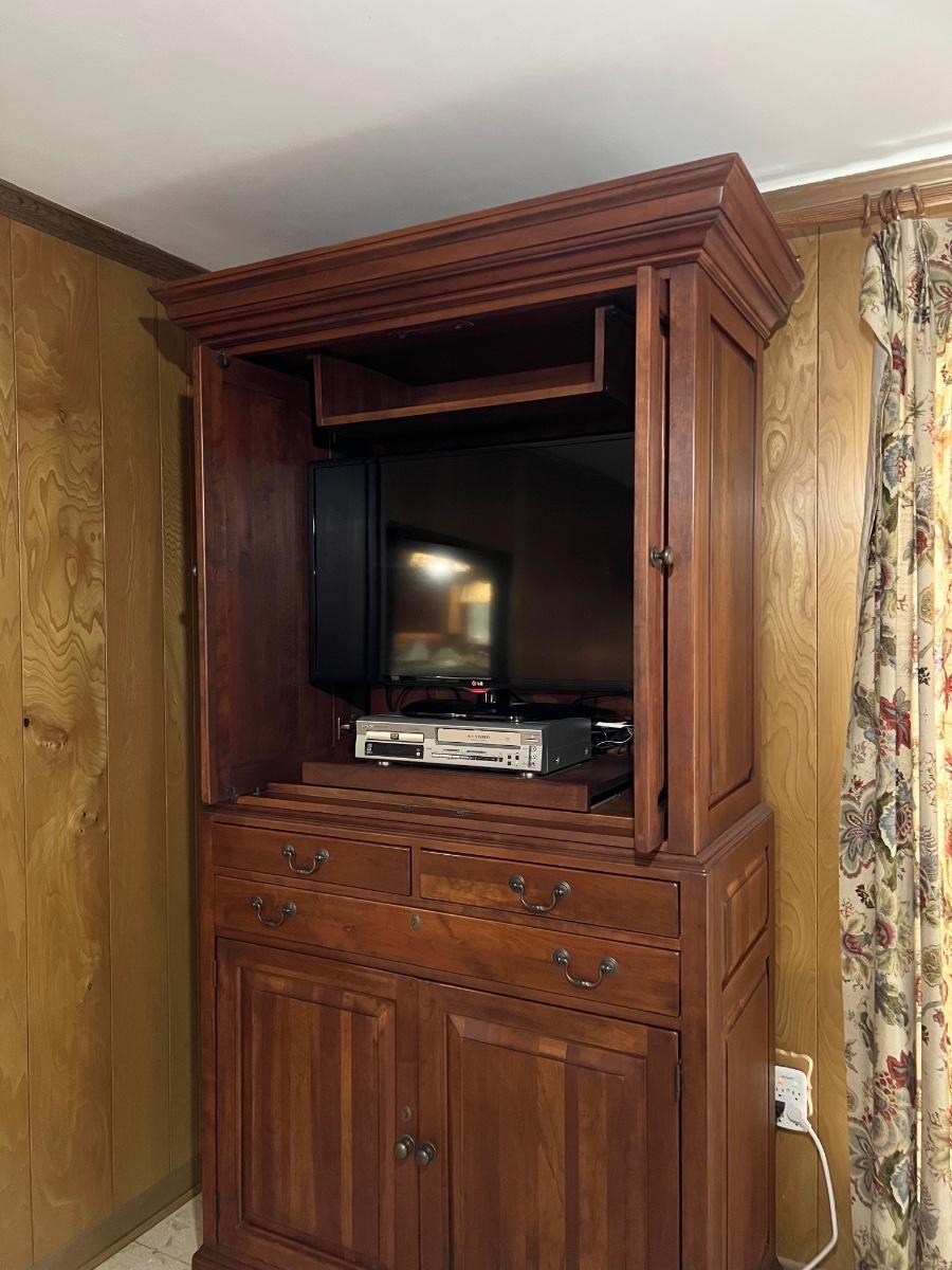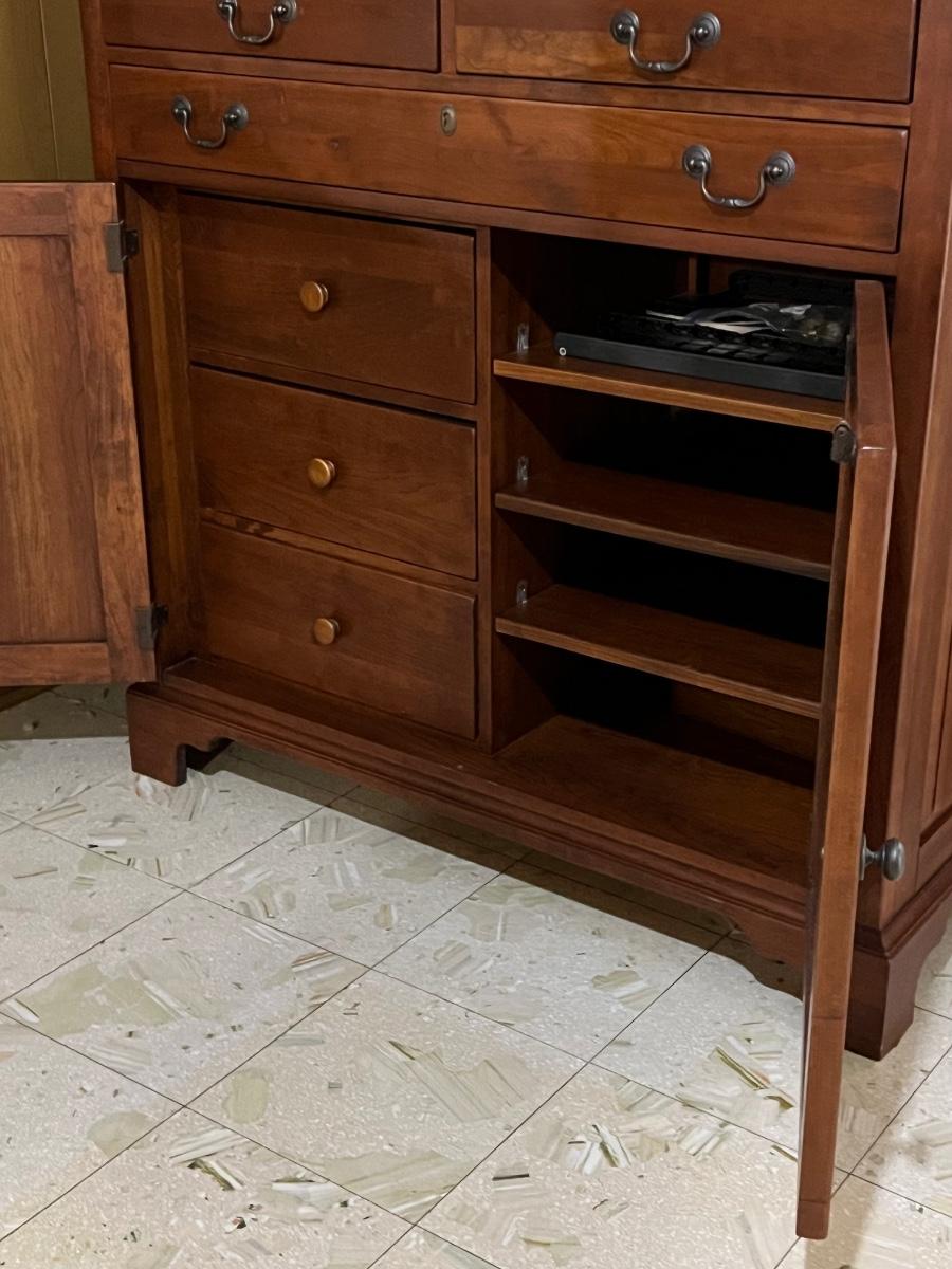 2 pieces ~ Has 3 drawers, all slide easy ~ Shelves are adjustable ~ Electronics not included ~ There is a 38" TV (23" H x 35" W) in the photo to have an idea of how big the inside is, it fits perfectly = 88” H x 49” W x 24” D