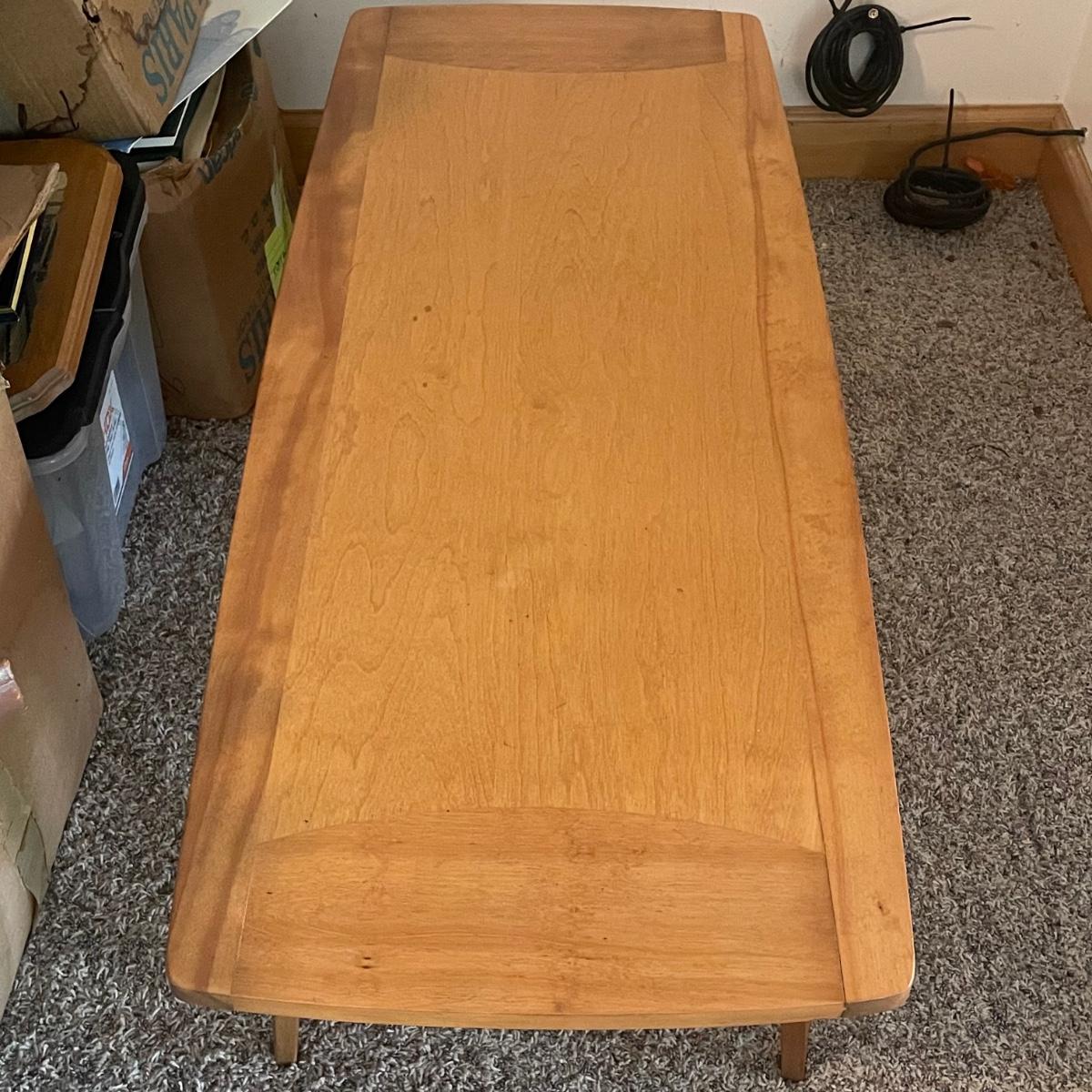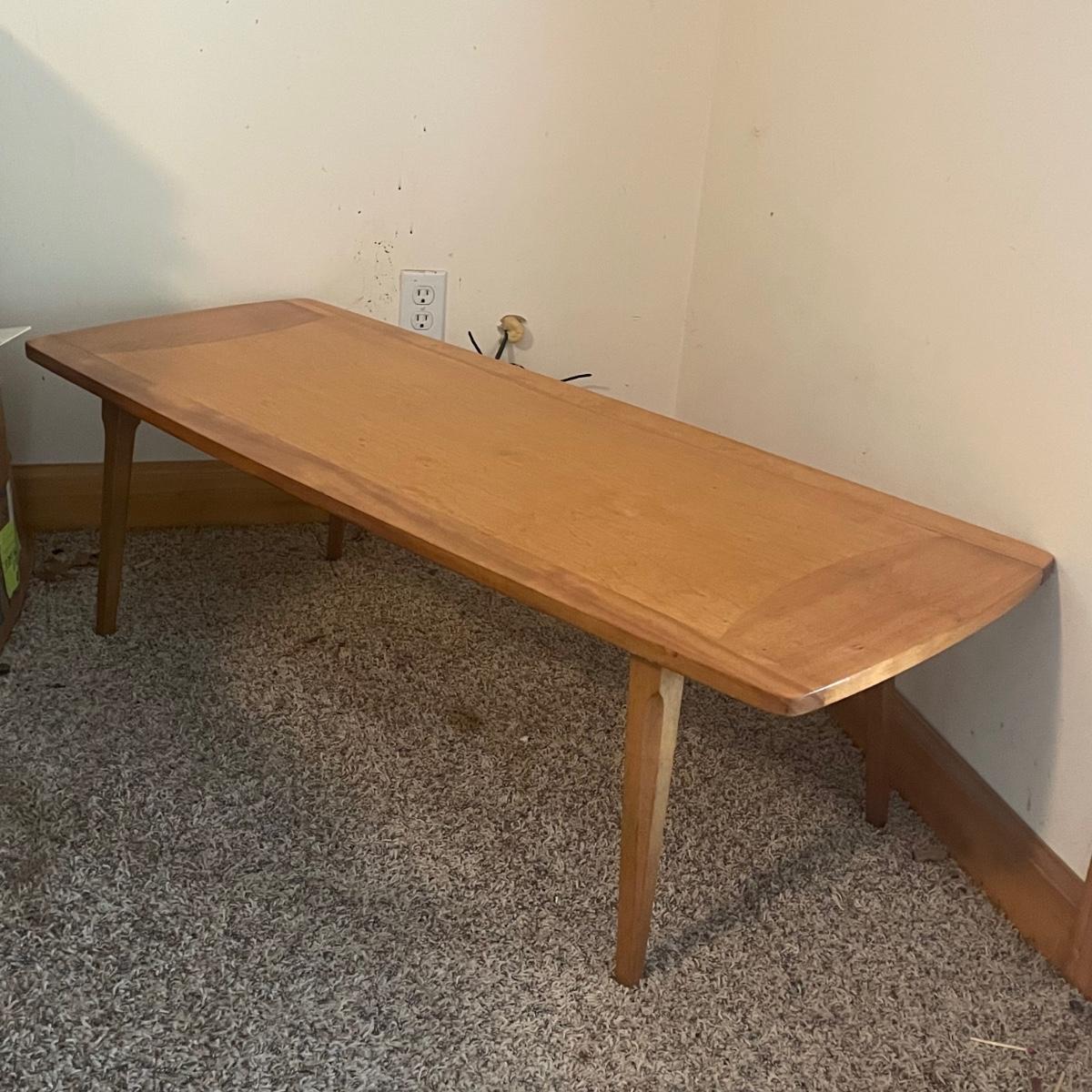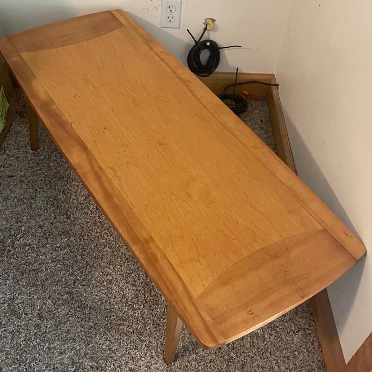 This sleek MCM solid wood table measures 19” x 48” x 14.5". Wood and finish are in good condition.