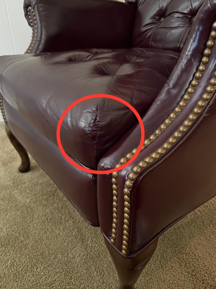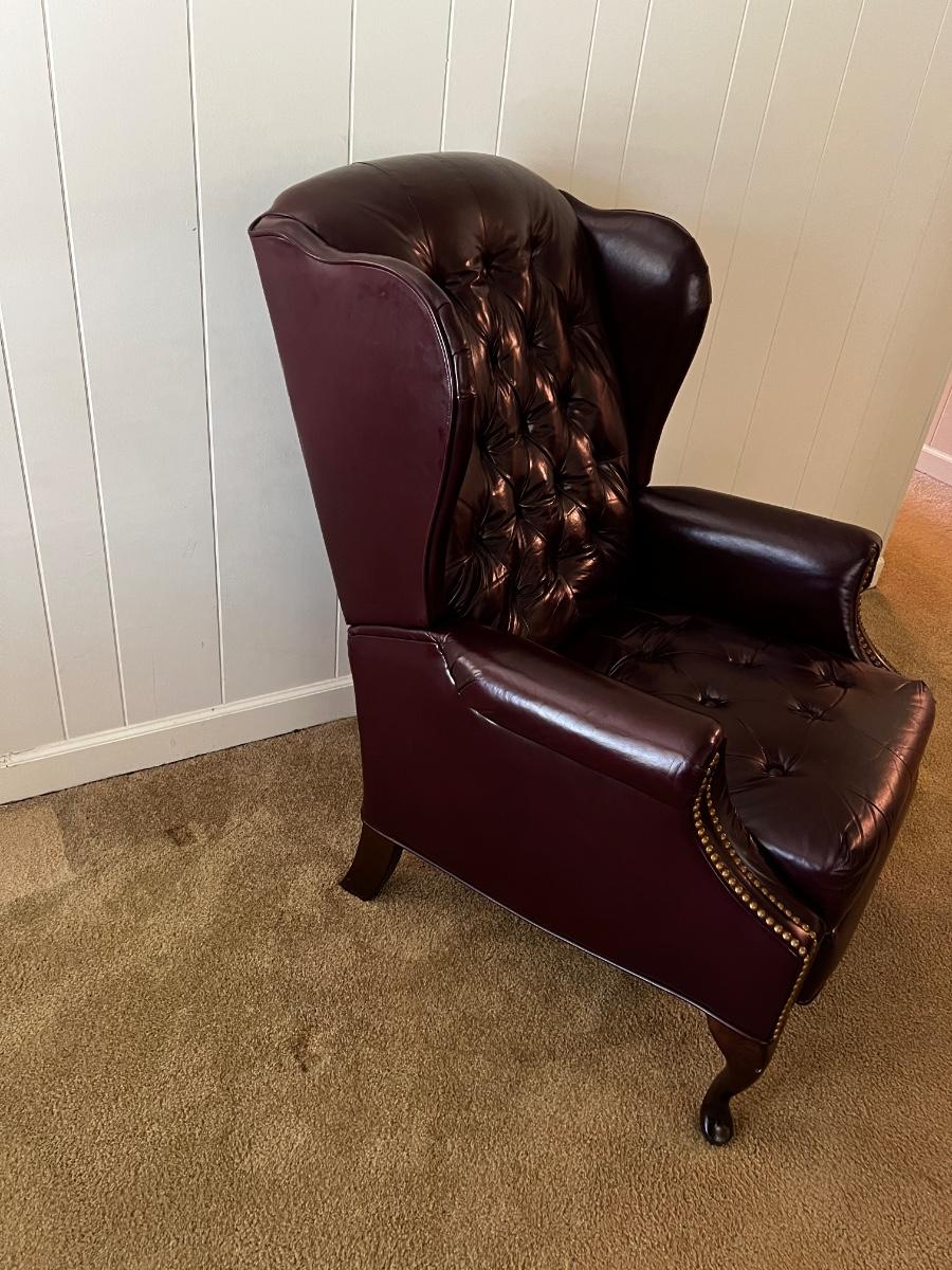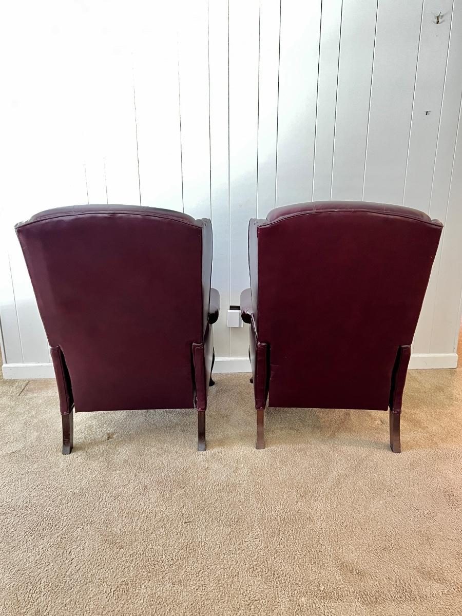 Chairs are a burgundy color. One of the chairs has a button missing & the other chair needs very minor sewing repair. See photos. Both = 42” H x 30.5” W x 36” D.