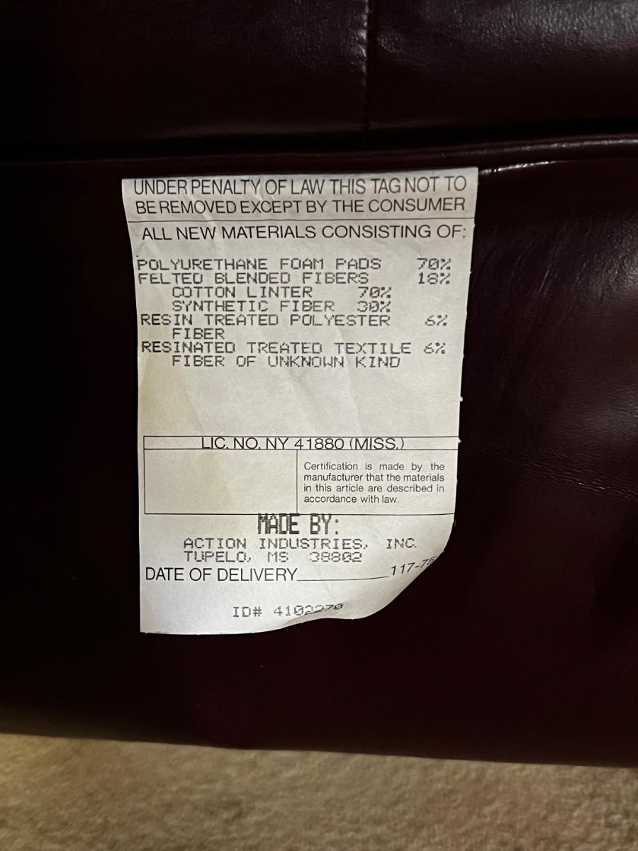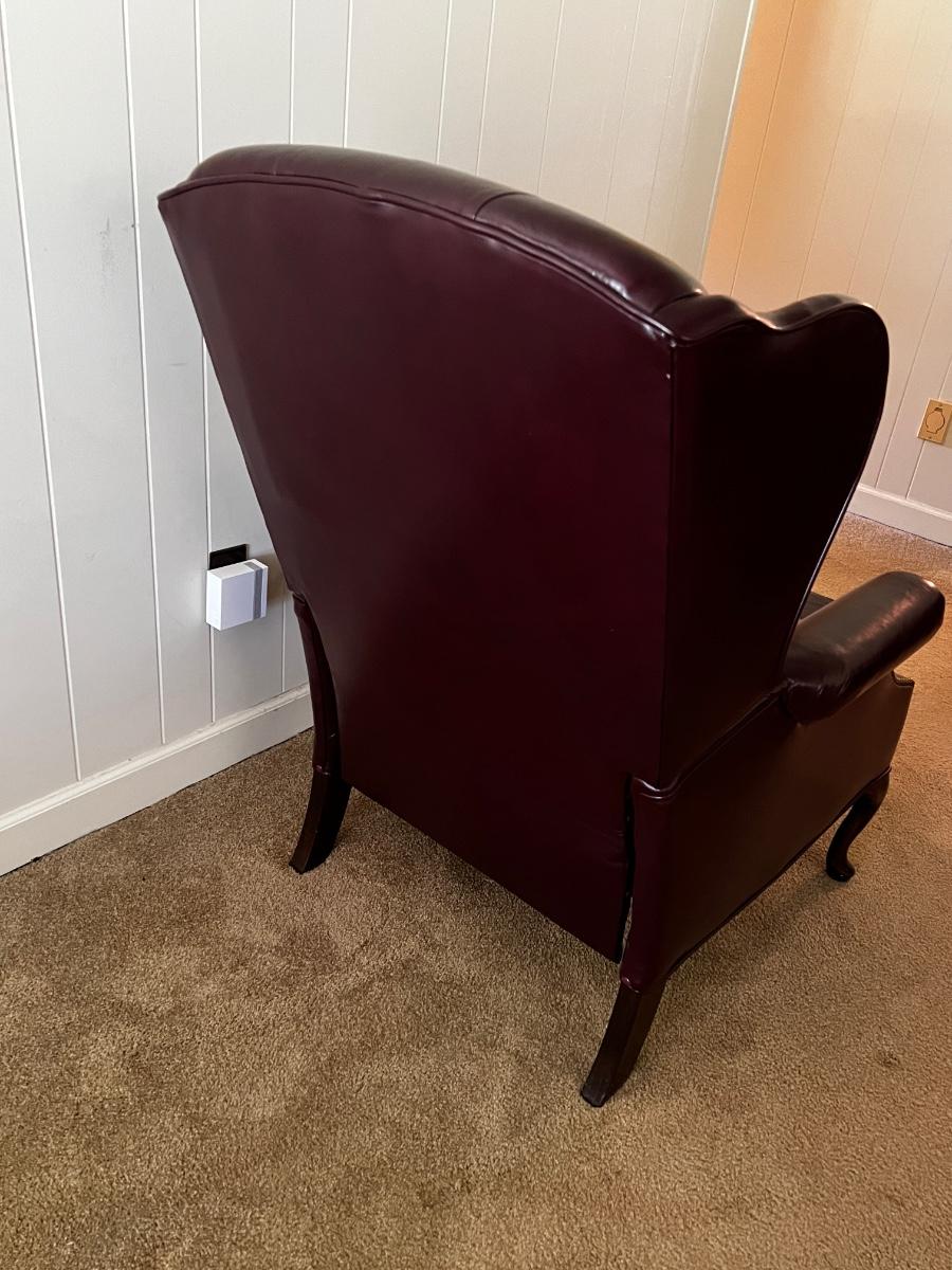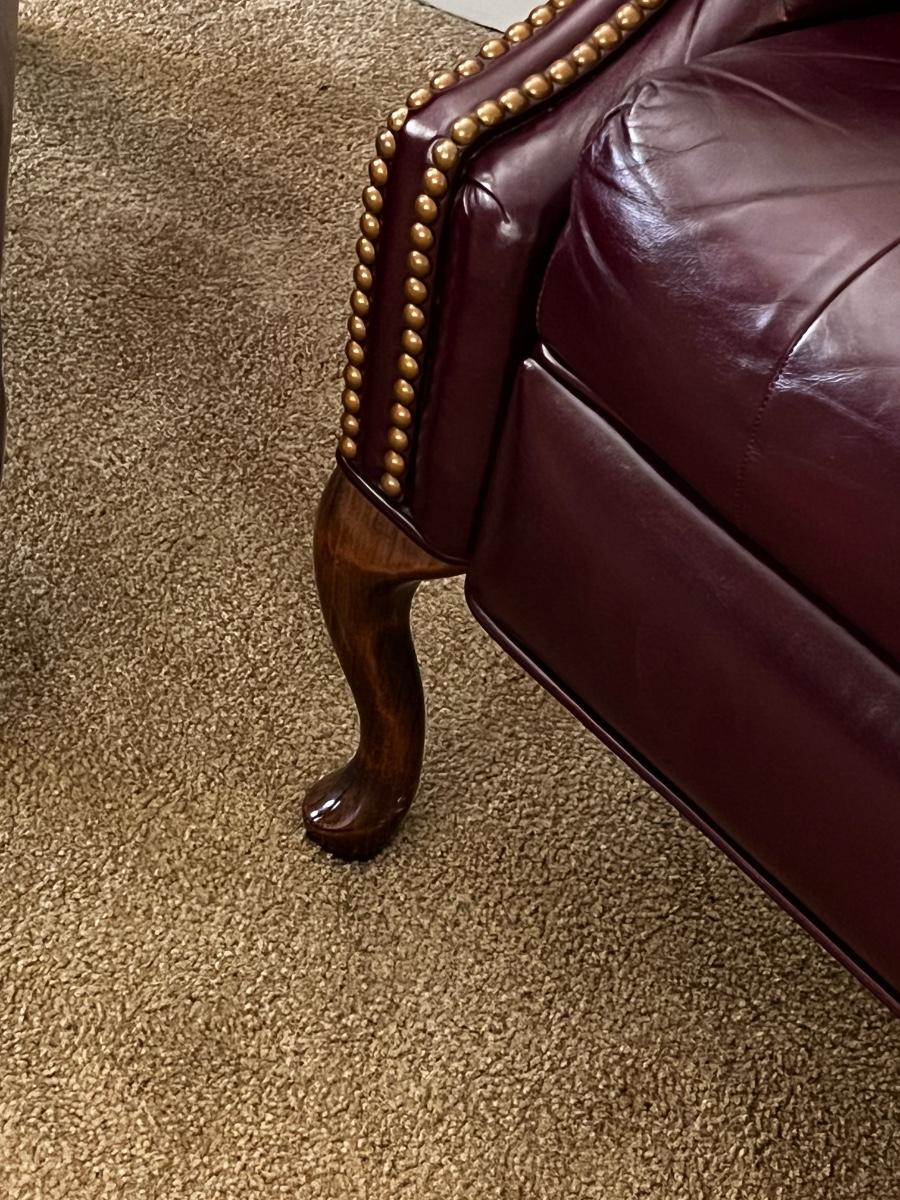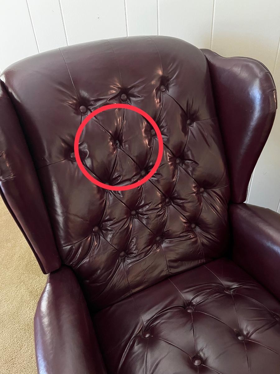 Chairs are a burgundy color. One of the chairs has a button missing & the other chair needs very minor sewing repair. See photos. Both = 42” H x 30.5” W x 36” D.