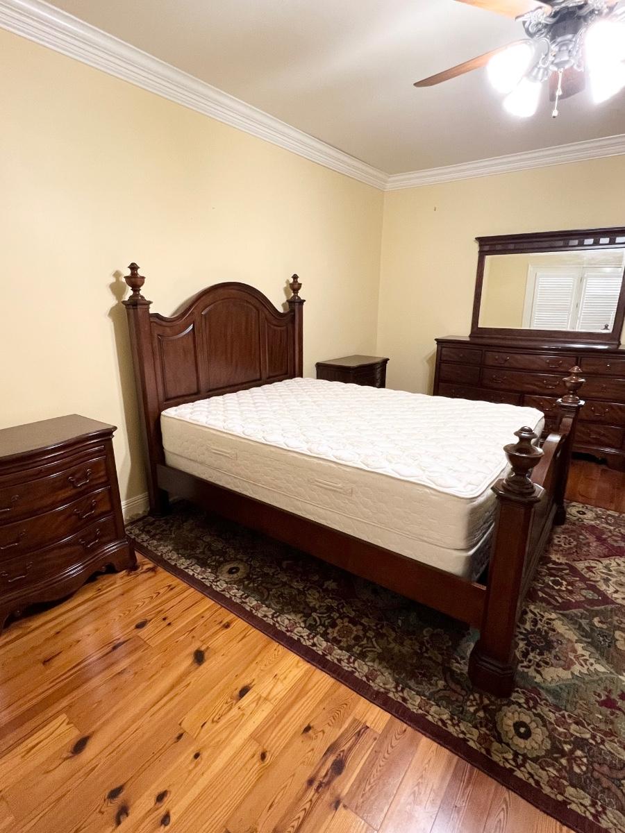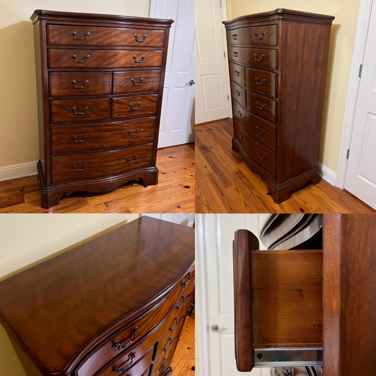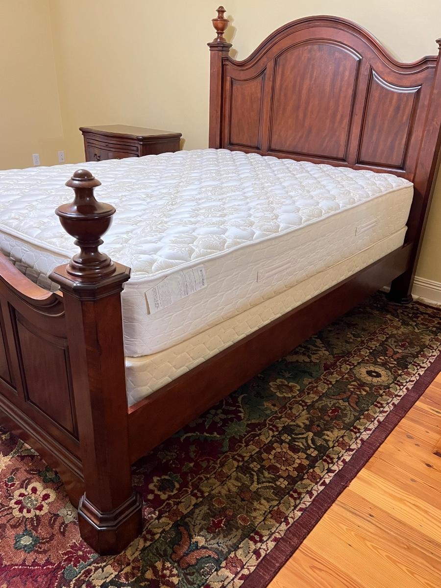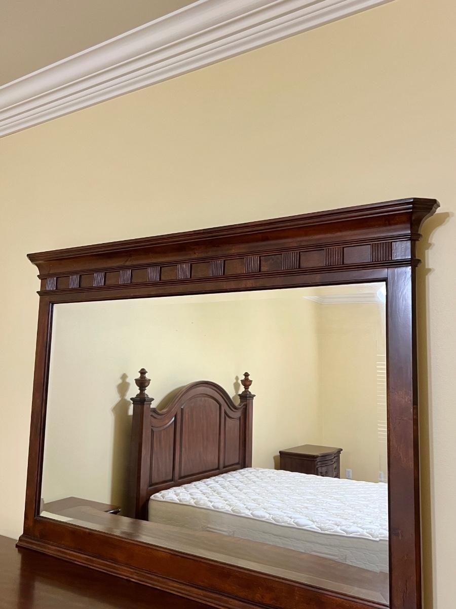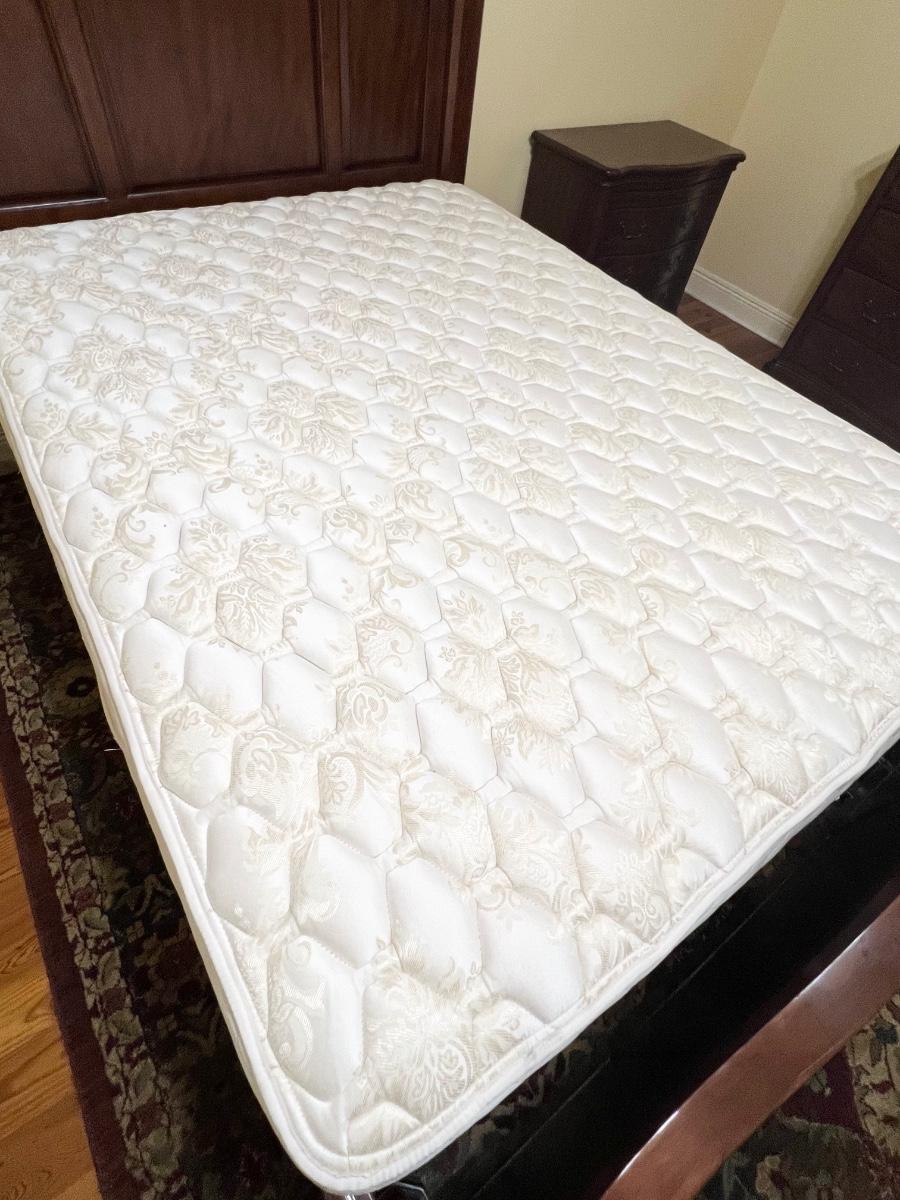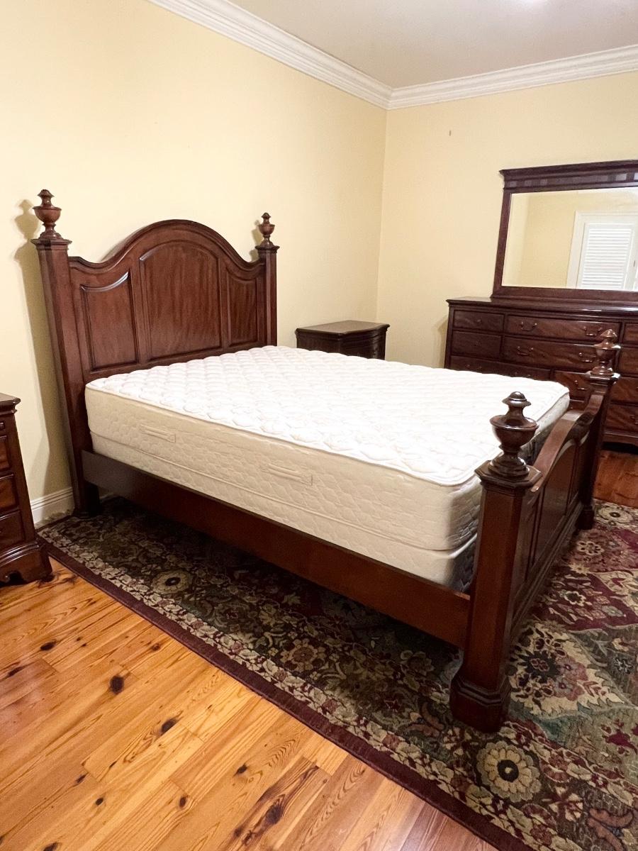 Includes: Queen bed, Beveled mirrored dresser, 2 nightstands, & 6-drawer tall chest of drawers ~ Also includes SEALY mattress & boxspring ~ All drawers slide easily ~ All drawers are felt lined except for the bottom drawers on all pieces ~ Mattress has been sanitized, deodorized, & disinfected ~ Rug is sold separately ~ Headboard = 64” H ~ Dresser = 41” H x 71” W x 20” D ~ Beveled mirror = 39.25” H ~ Nightstands = 32” H x 31” W x 18.5” D ~ Chest of drawers = 60.75” H x 45” W x 21” D