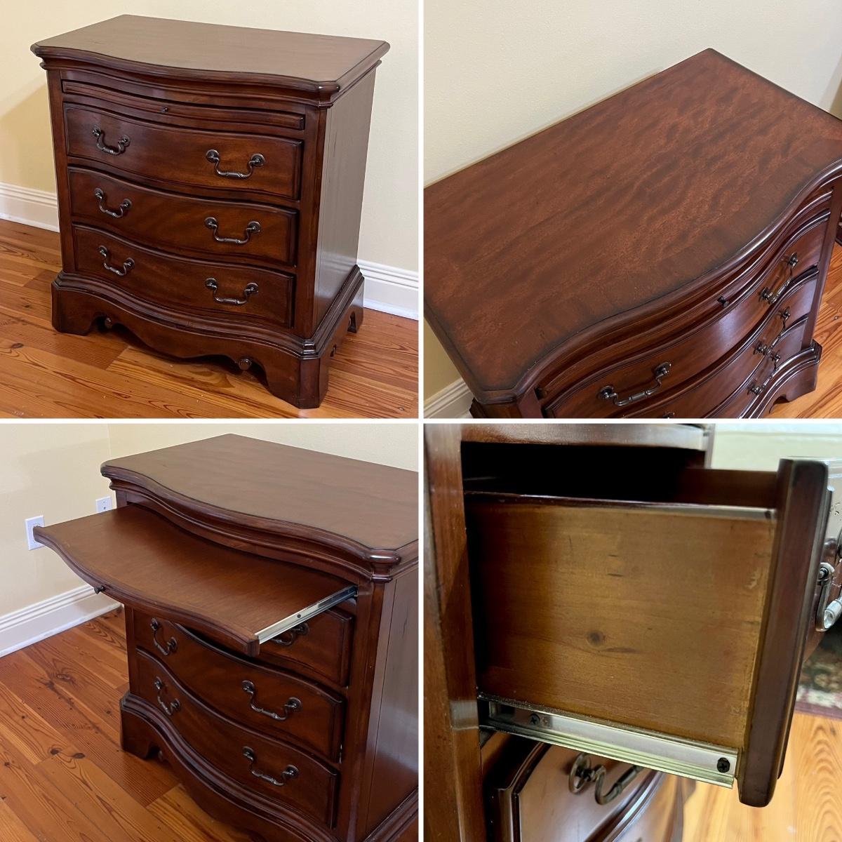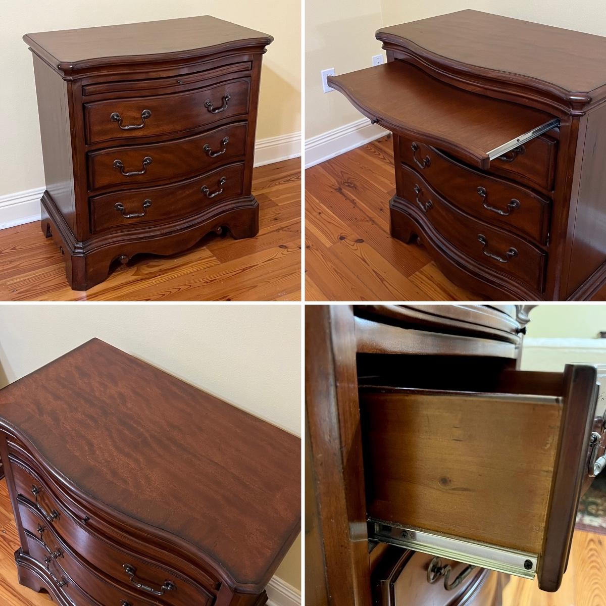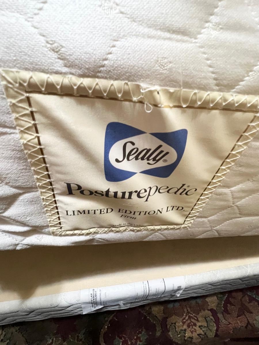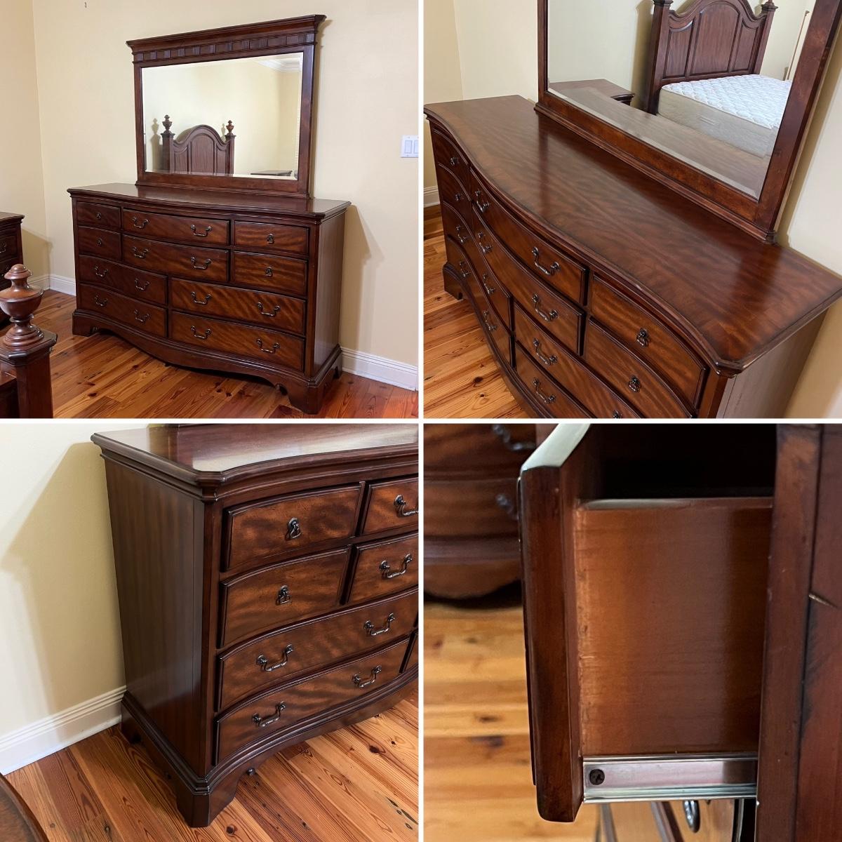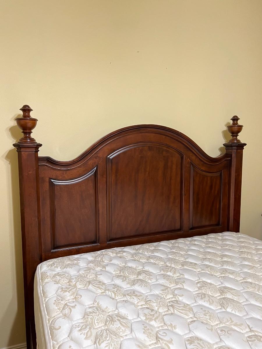 Includes: Queen bed, Beveled mirrored dresser, 2 nightstands, & 6-drawer tall chest of drawers ~ Also includes SEALY mattress & boxspring ~ All drawers slide easily ~ All drawers are felt lined except for the bottom drawers on all pieces ~ Mattress has been sanitized, deodorized, & disinfected ~ Rug is sold separately ~ Headboard = 64” H ~ Dresser = 41” H x 71” W x 20” D ~ Beveled mirror = 39.25” H ~ Nightstands = 32” H x 31” W x 18.5” D ~ Chest of drawers = 60.75” H x 45” W x 21” D