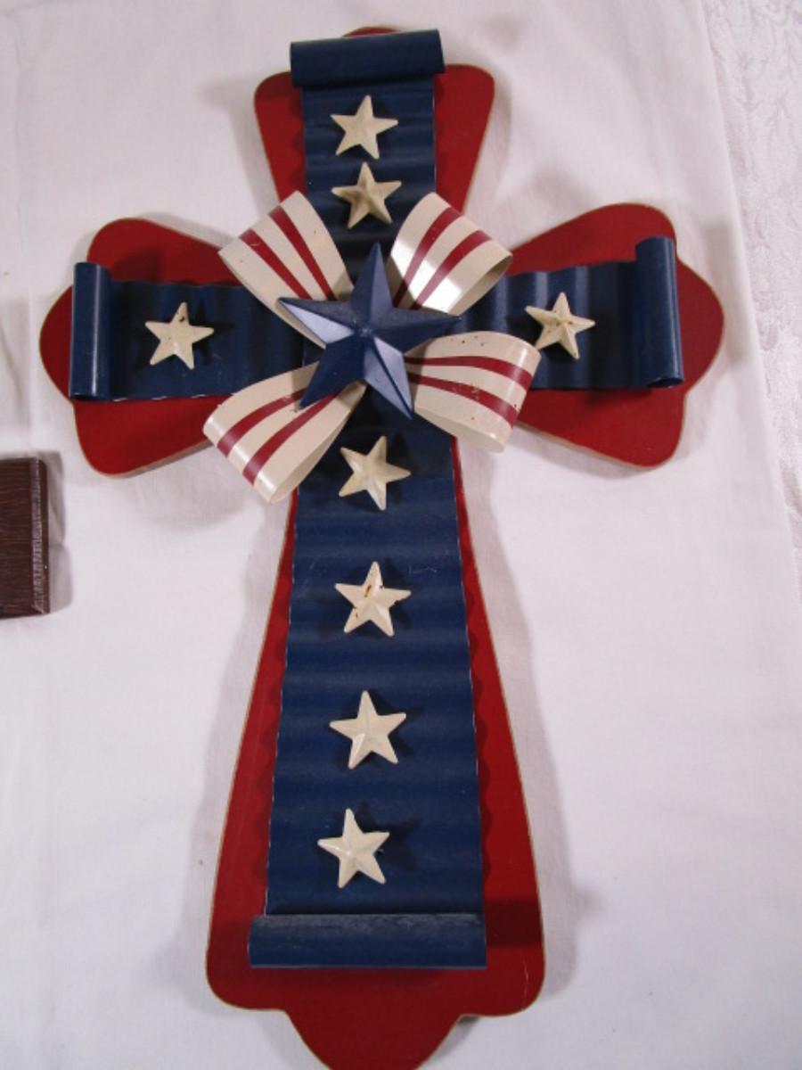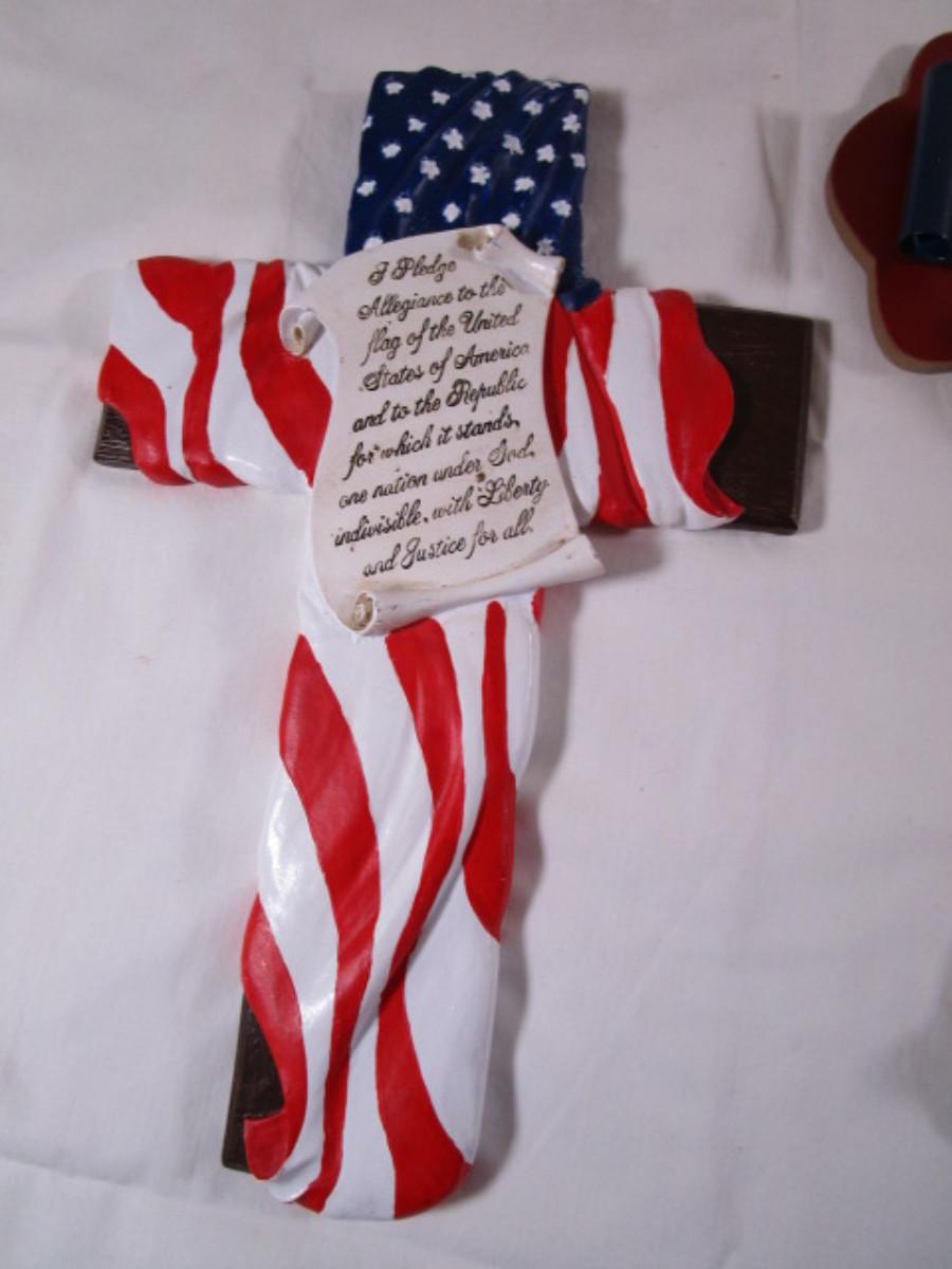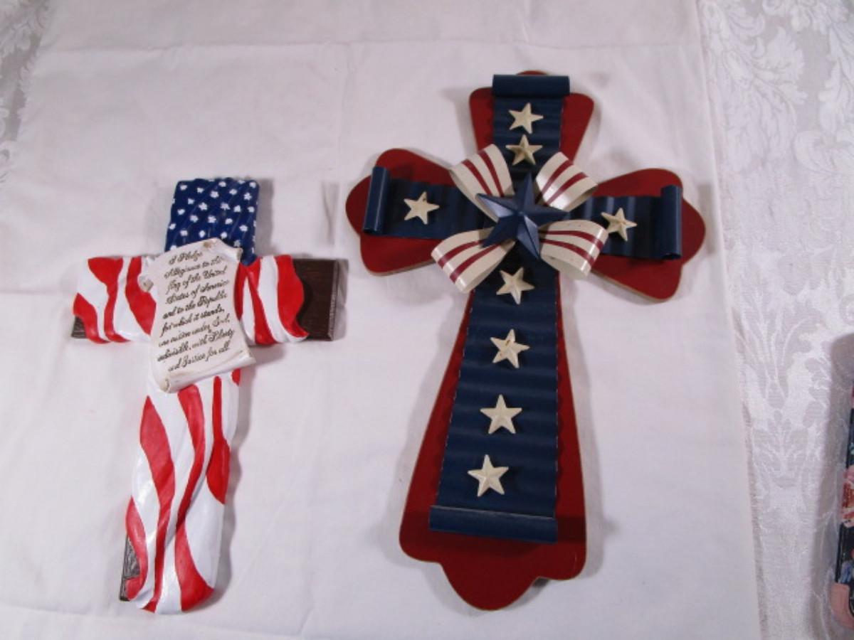 Flag cross 11-1/4" x 7-1/4" & has Pledge of Allegiance on it; Red, White & Blue Cross 14-1/2" x 9-1/2"