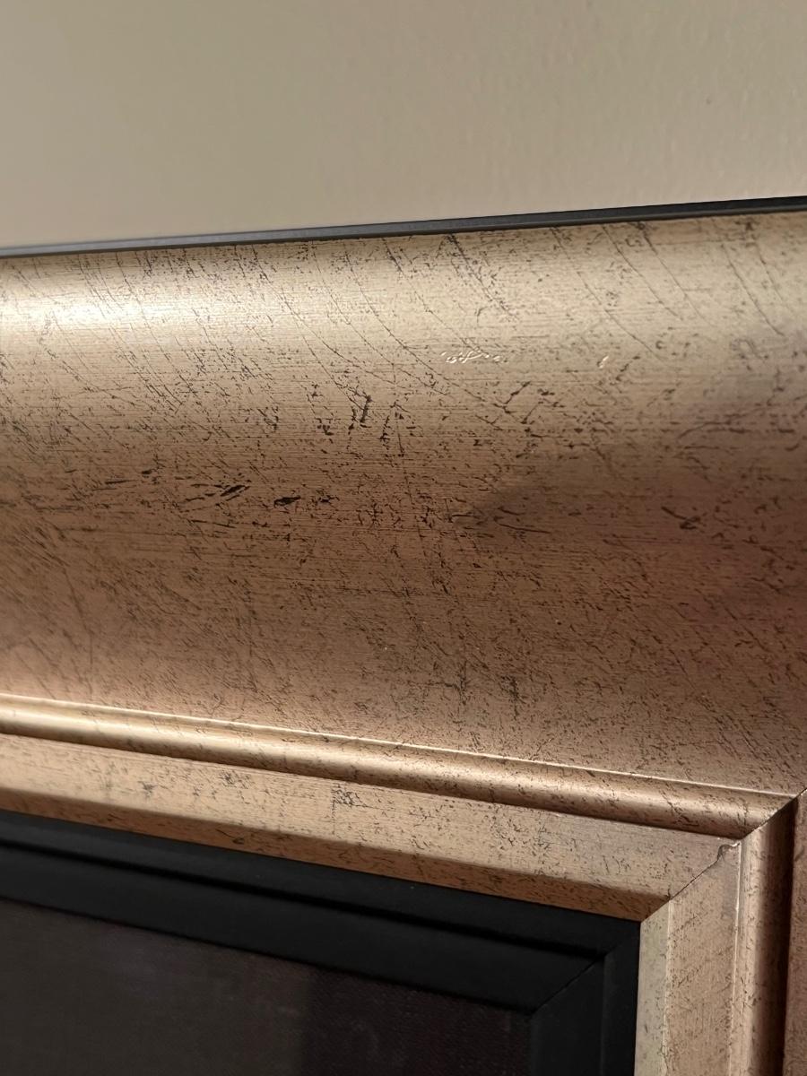 Mounted under glass in an attractive metallic, muted aged gold hued metal frame and black mat. Frame measures 26” x 1.5” x 24”H