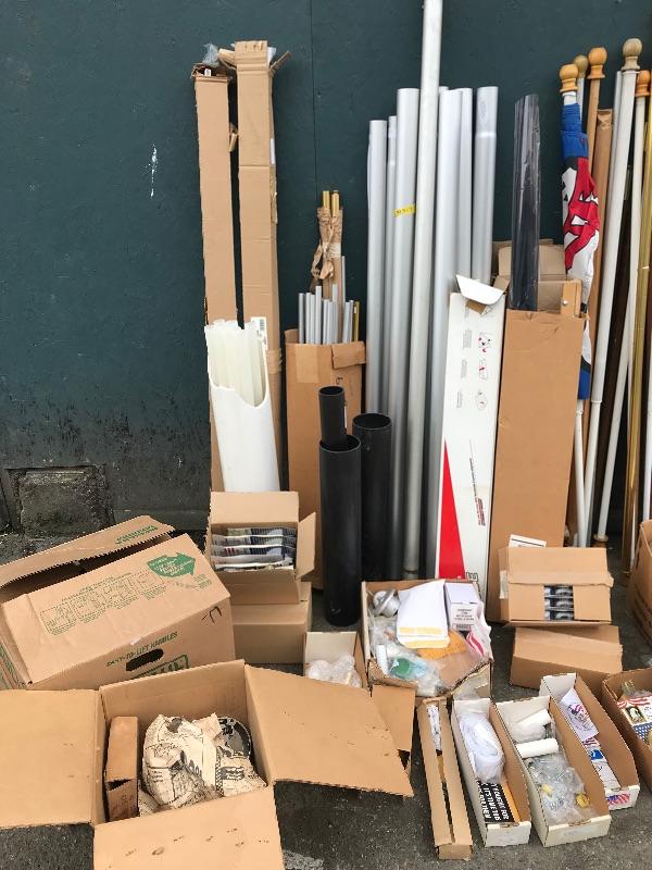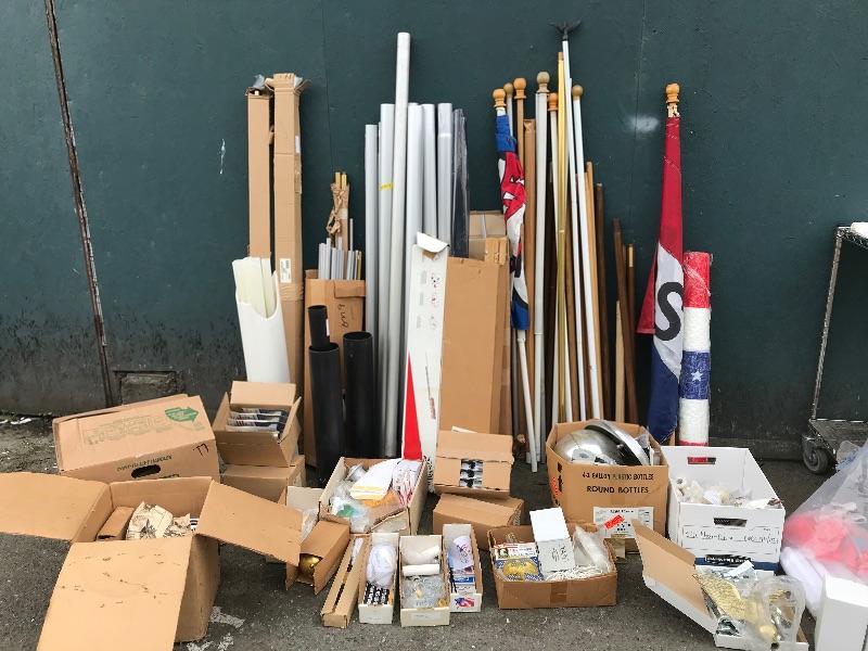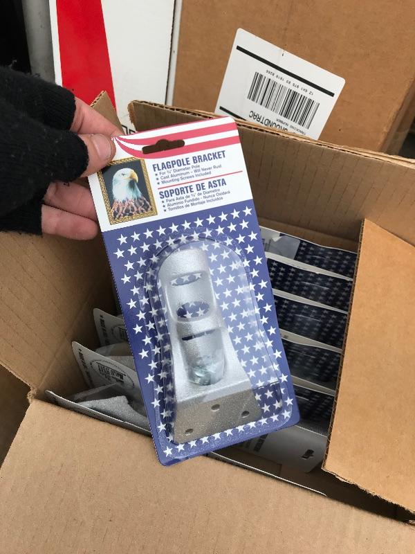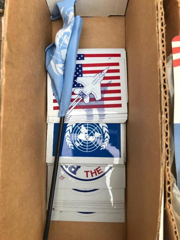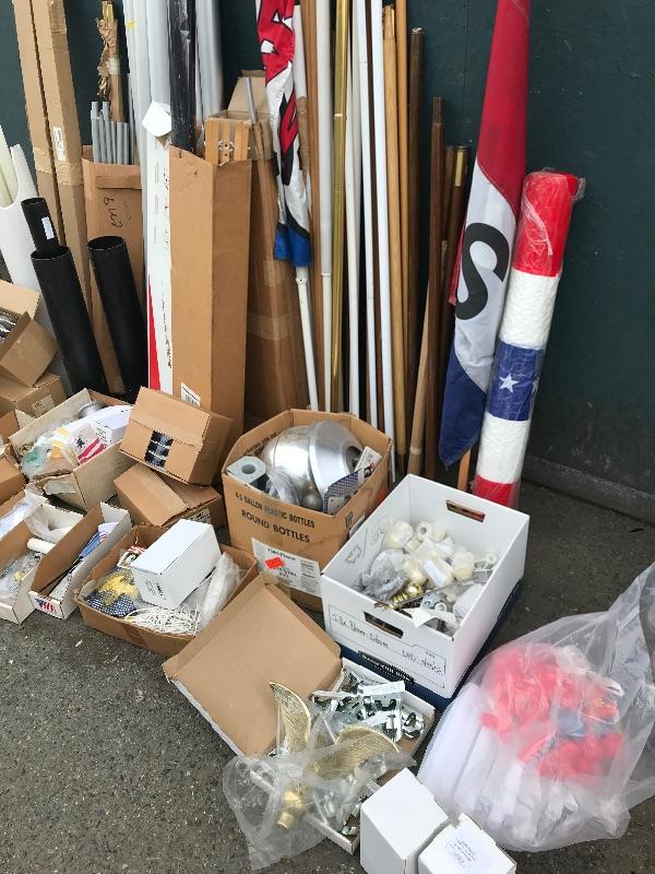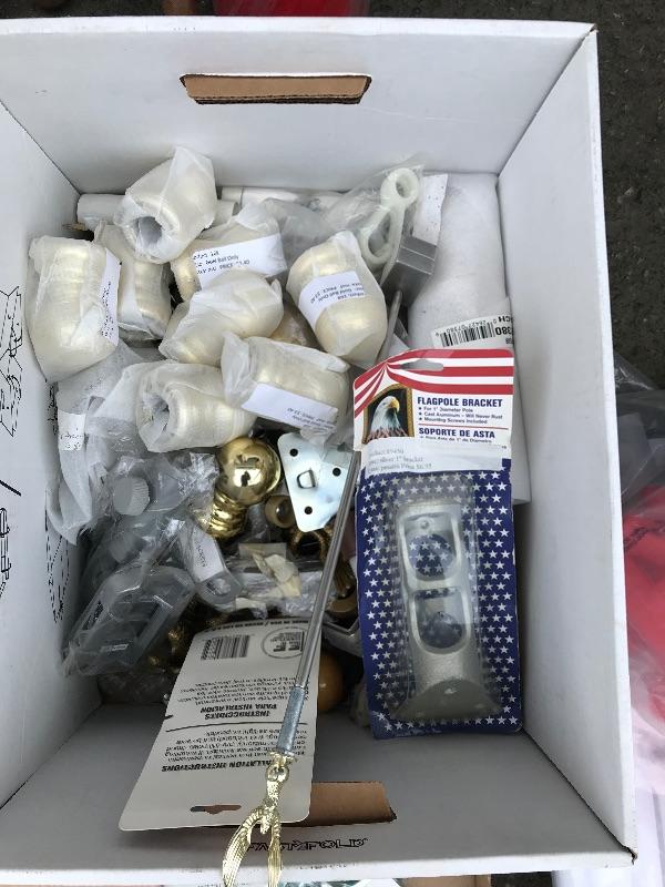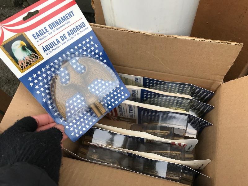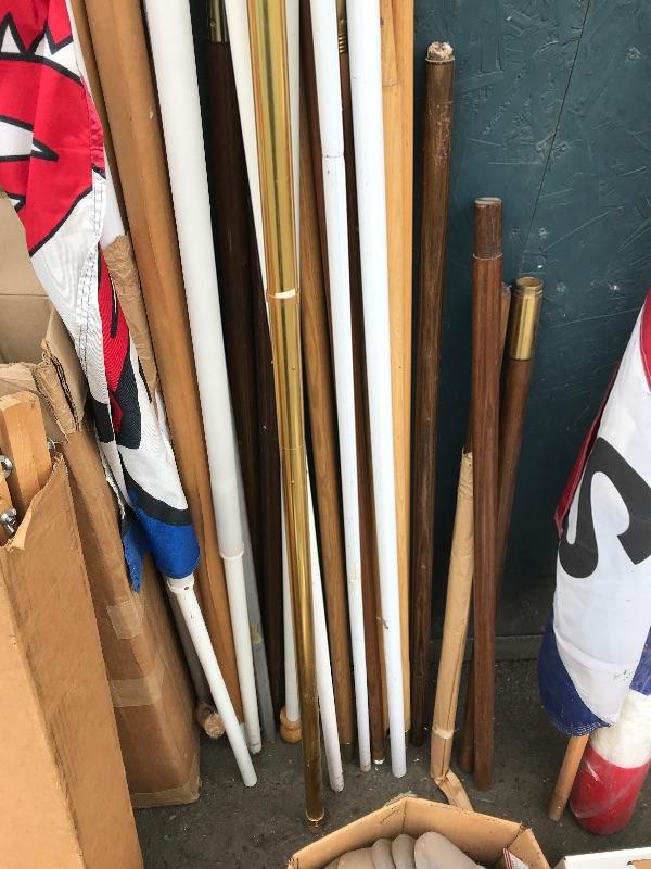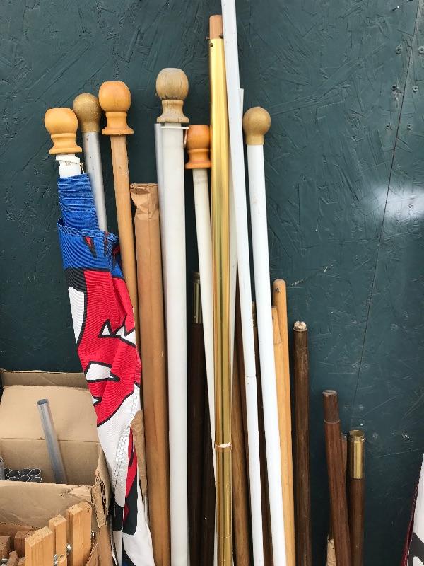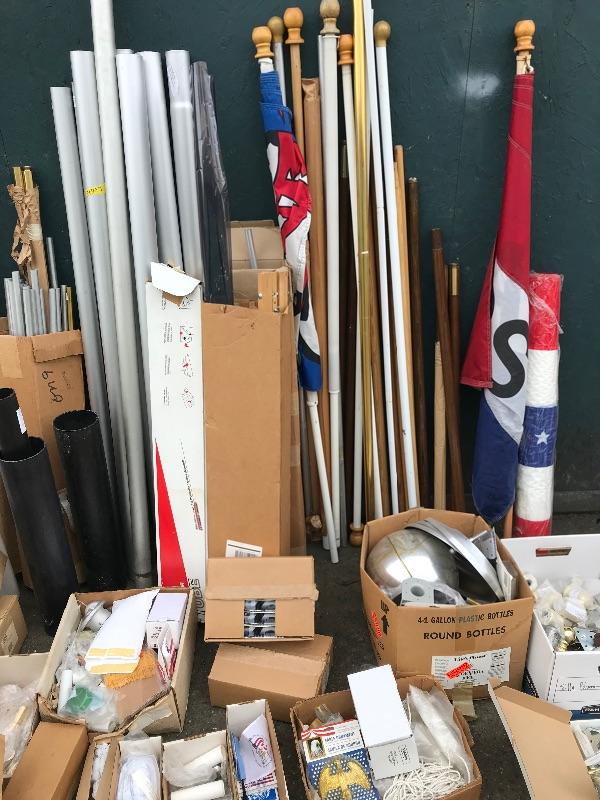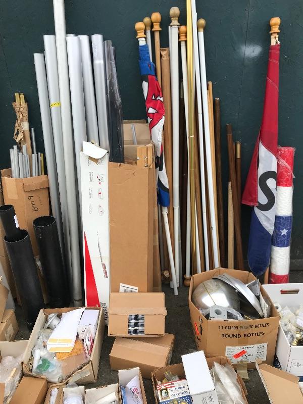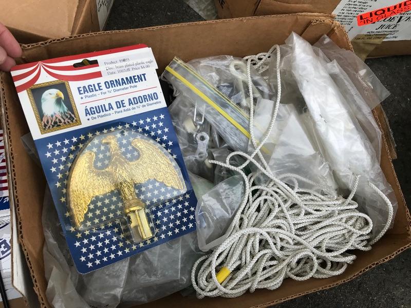 Included are a variety of flag poles of different sizes made of metal, wood, and plastic. There is a large "FLAGS" flag, a patriotic red, white, and blue vinyl banner, many eagle pole tops, hardware, and a collection of stickers.