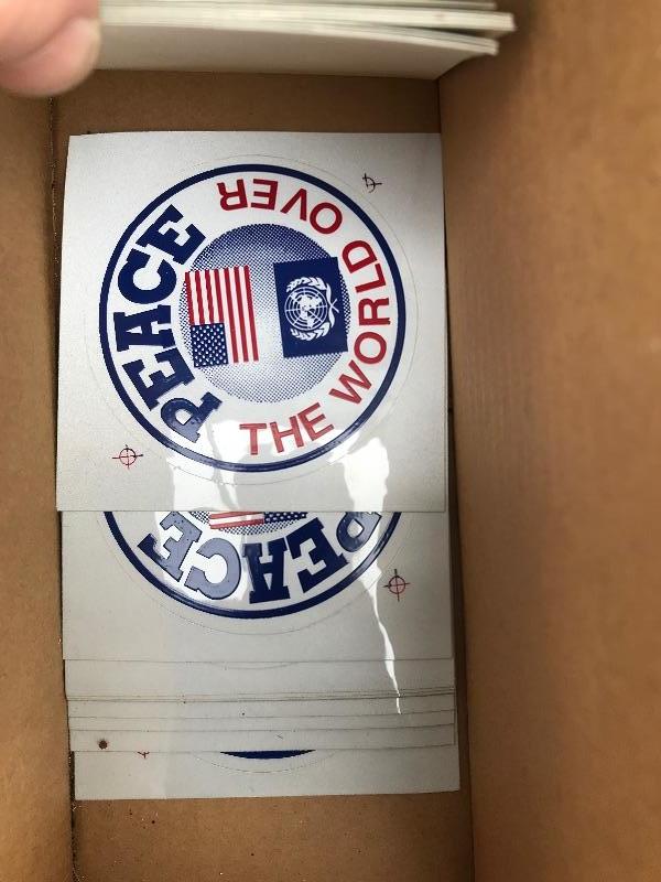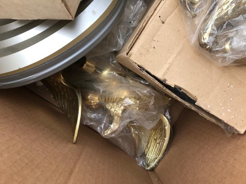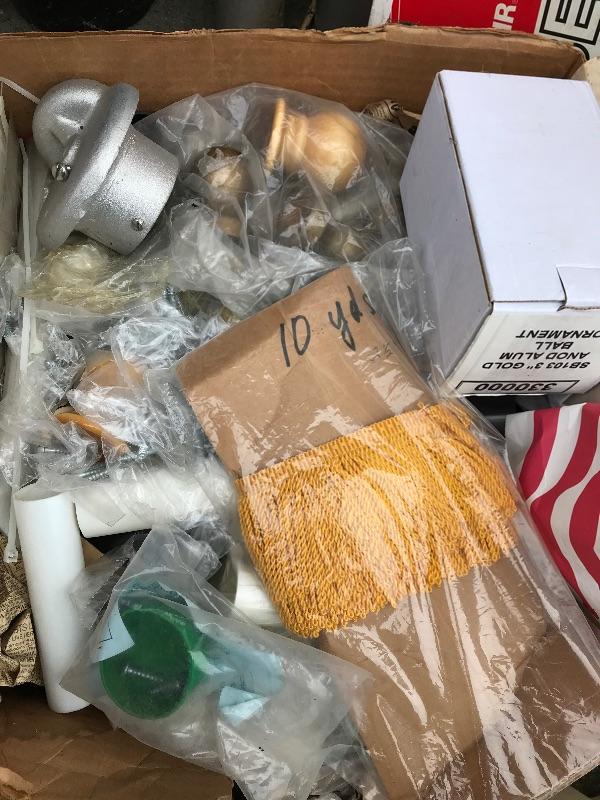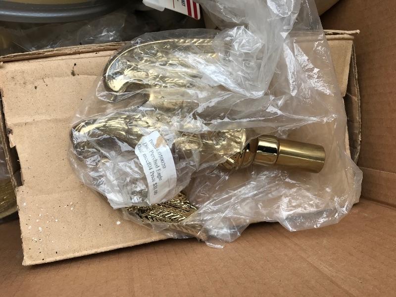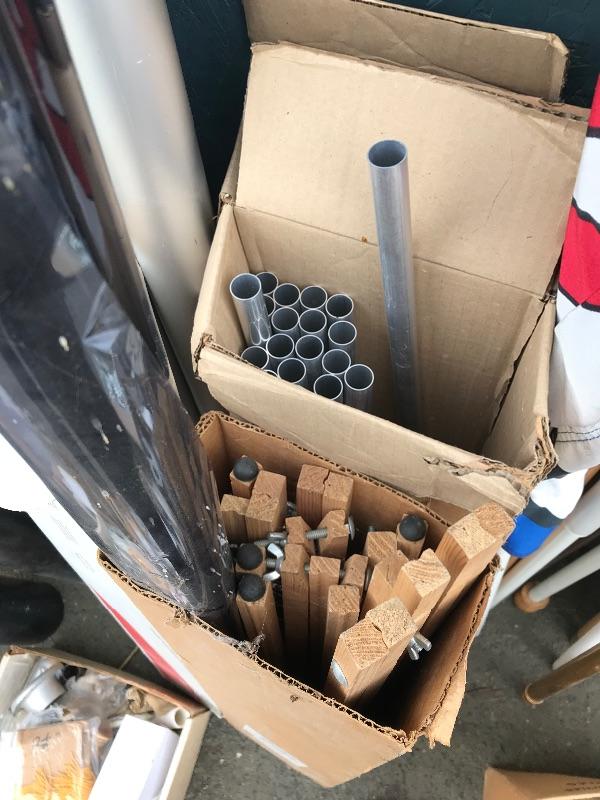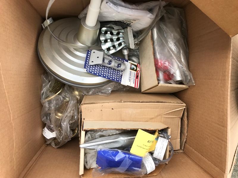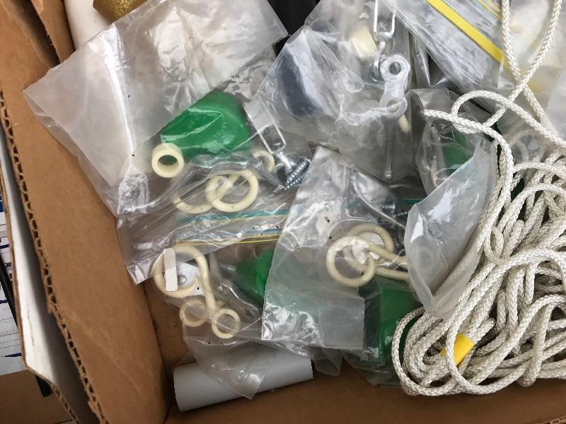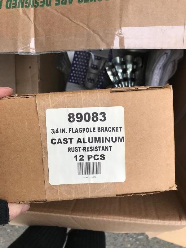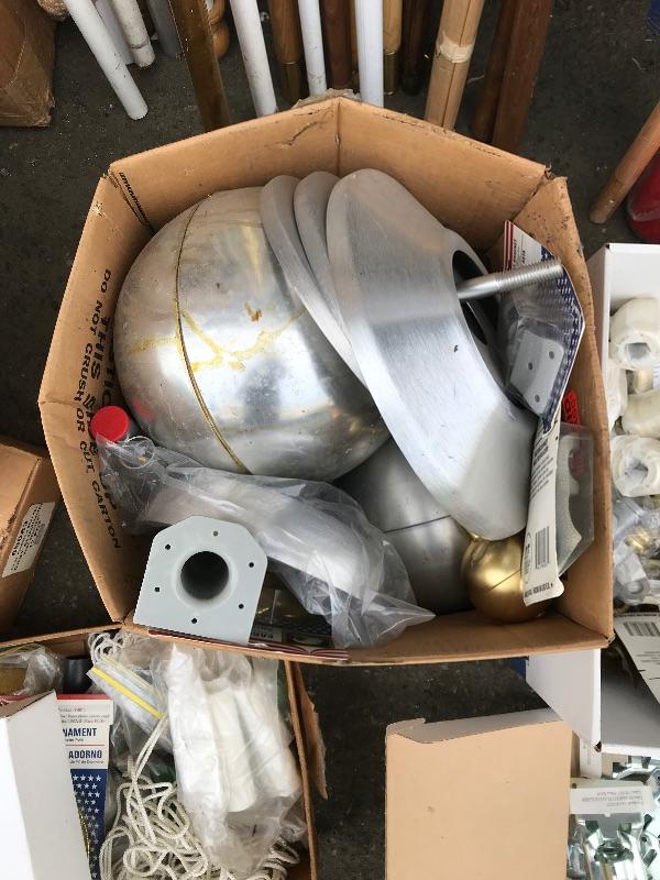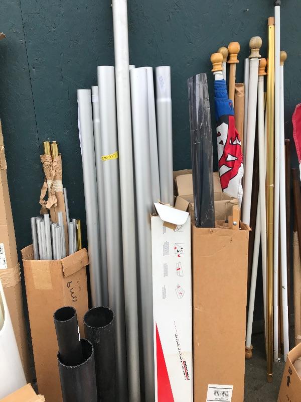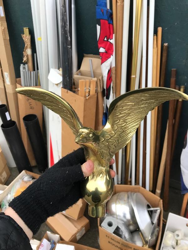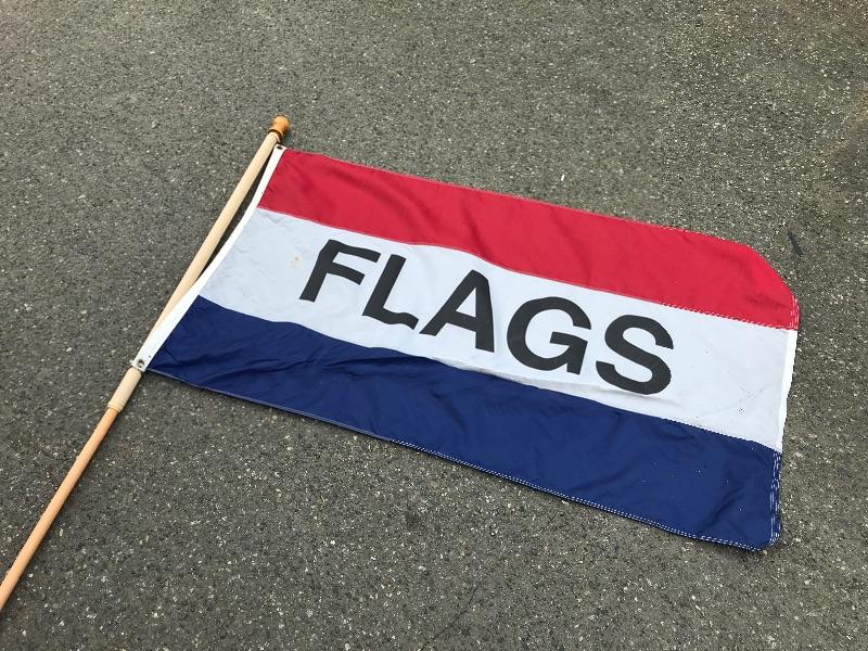 Included are a variety of flag poles of different sizes made of metal, wood, and plastic. There is a large "FLAGS" flag, a patriotic red, white, and blue vinyl banner, many eagle pole tops, hardware, and a collection of stickers.