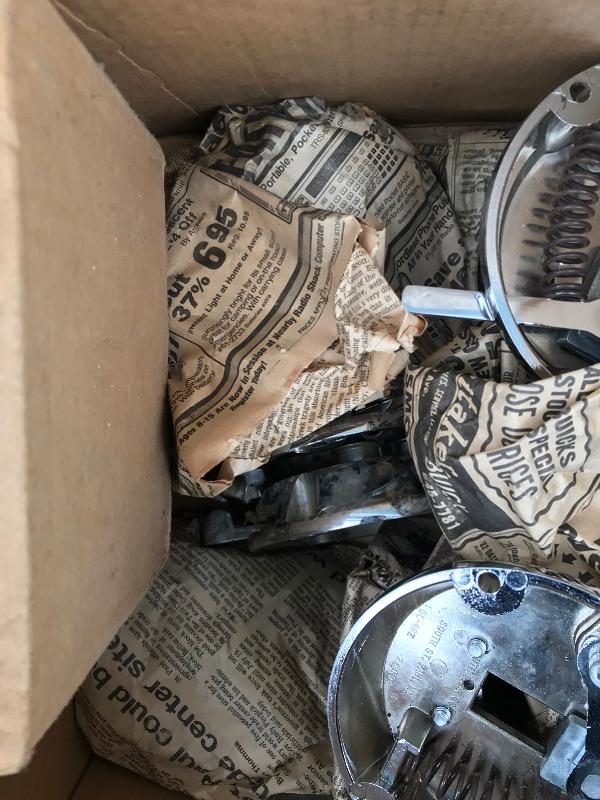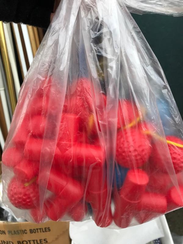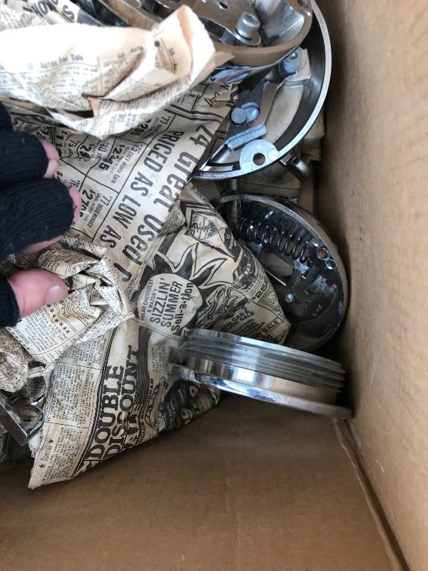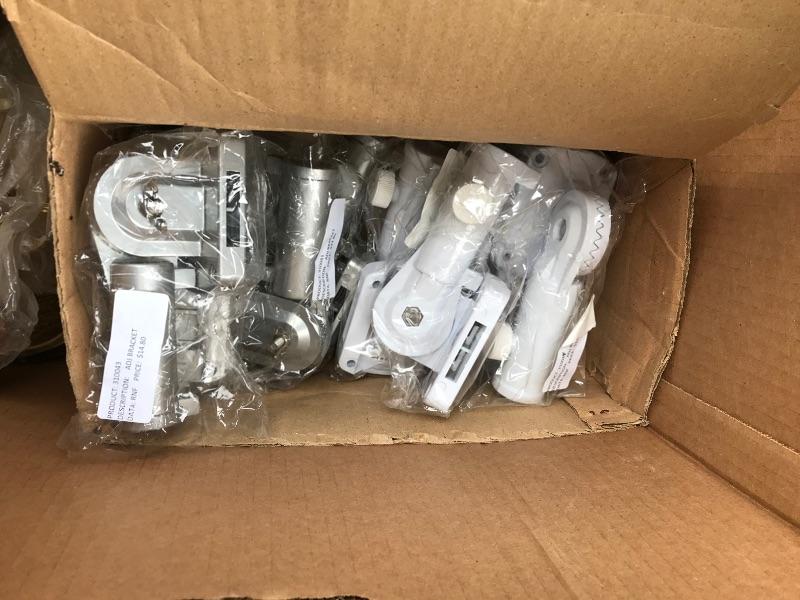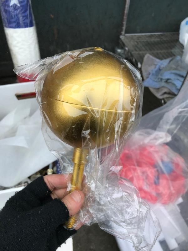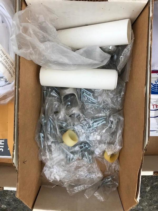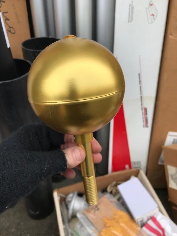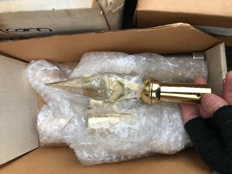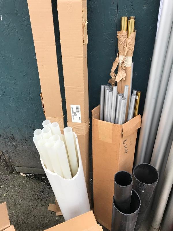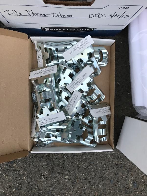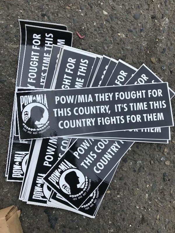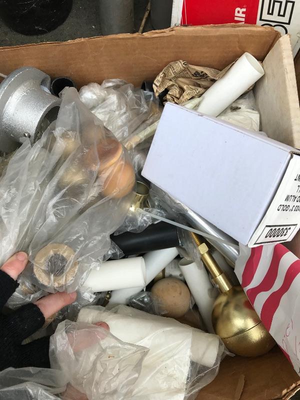 Included are a variety of flag poles of different sizes made of metal, wood, and plastic. There is a large "FLAGS" flag, a patriotic red, white, and blue vinyl banner, many eagle pole tops, hardware, and a collection of stickers.