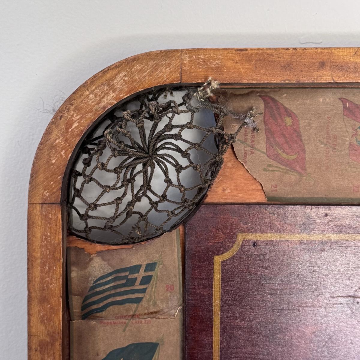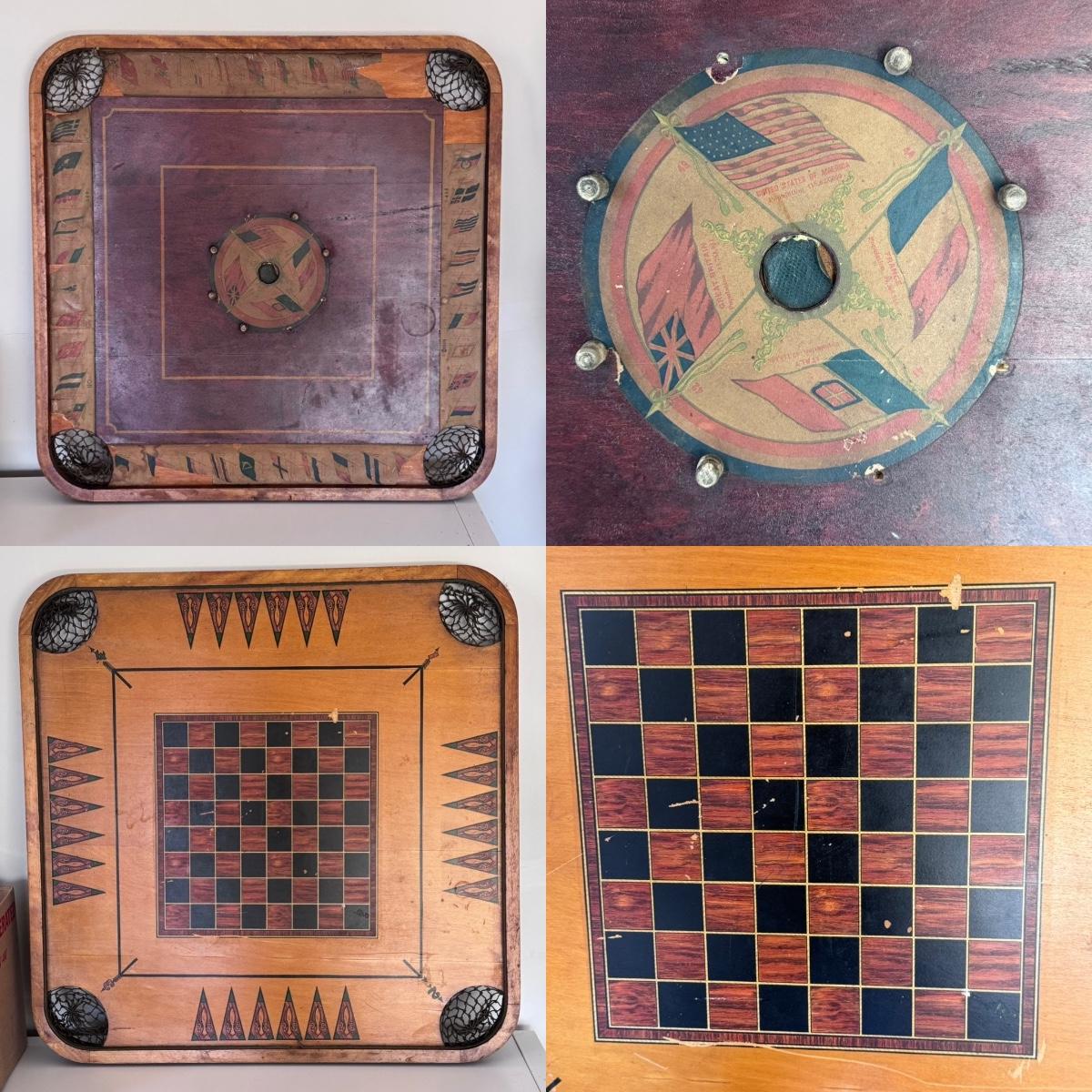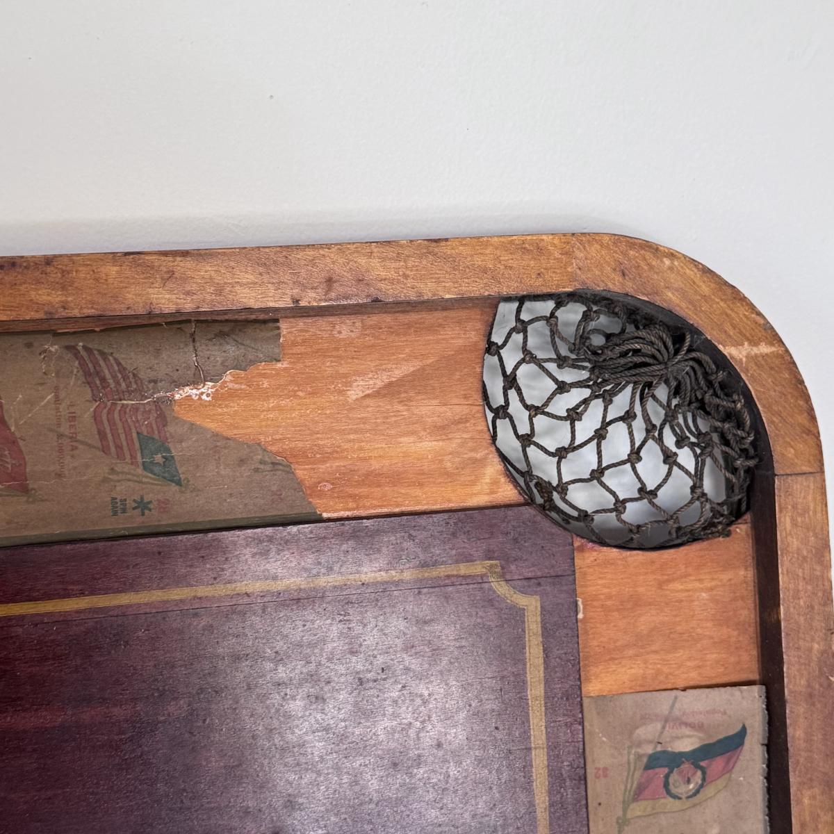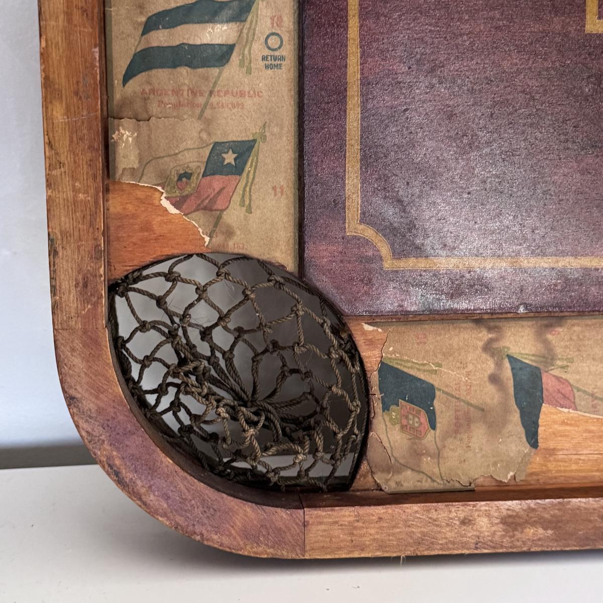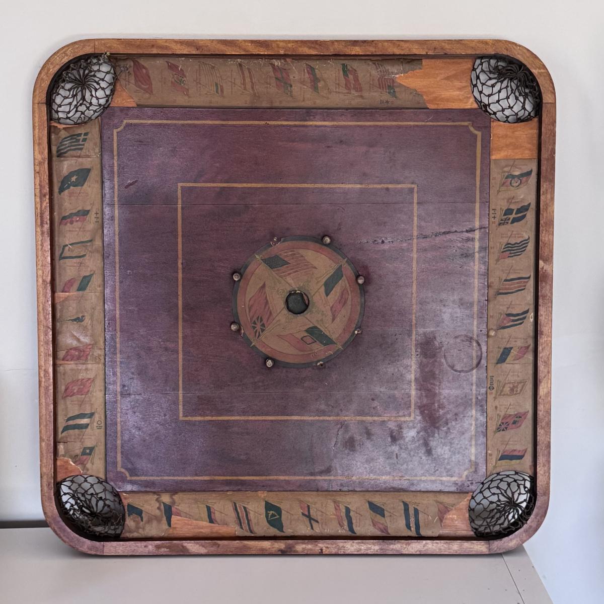 This lot includes one “Flags of The Nation” Carrom tabletop game. The game is made of wood with rope corners. There are some signs of wear due to age including some ripped paper where the decorative flags are - see pictures included. The board measures 28.5” square x 1.5”W. Shipping available.