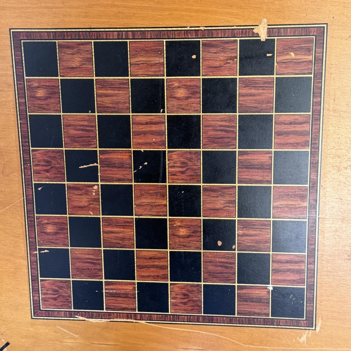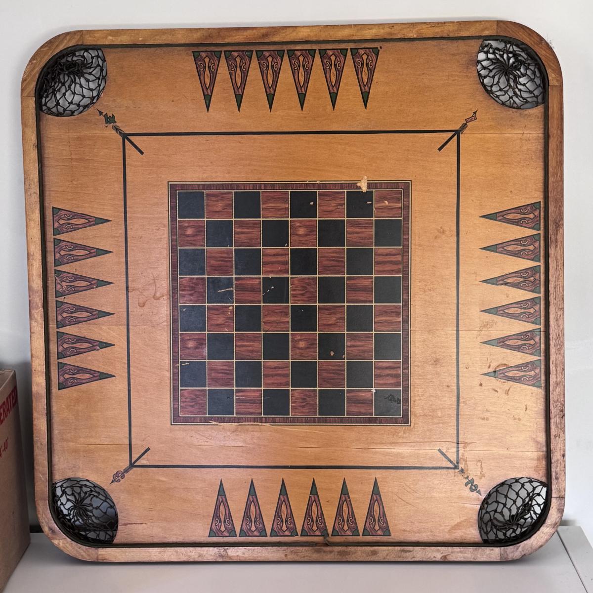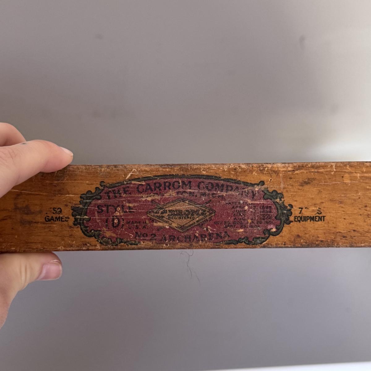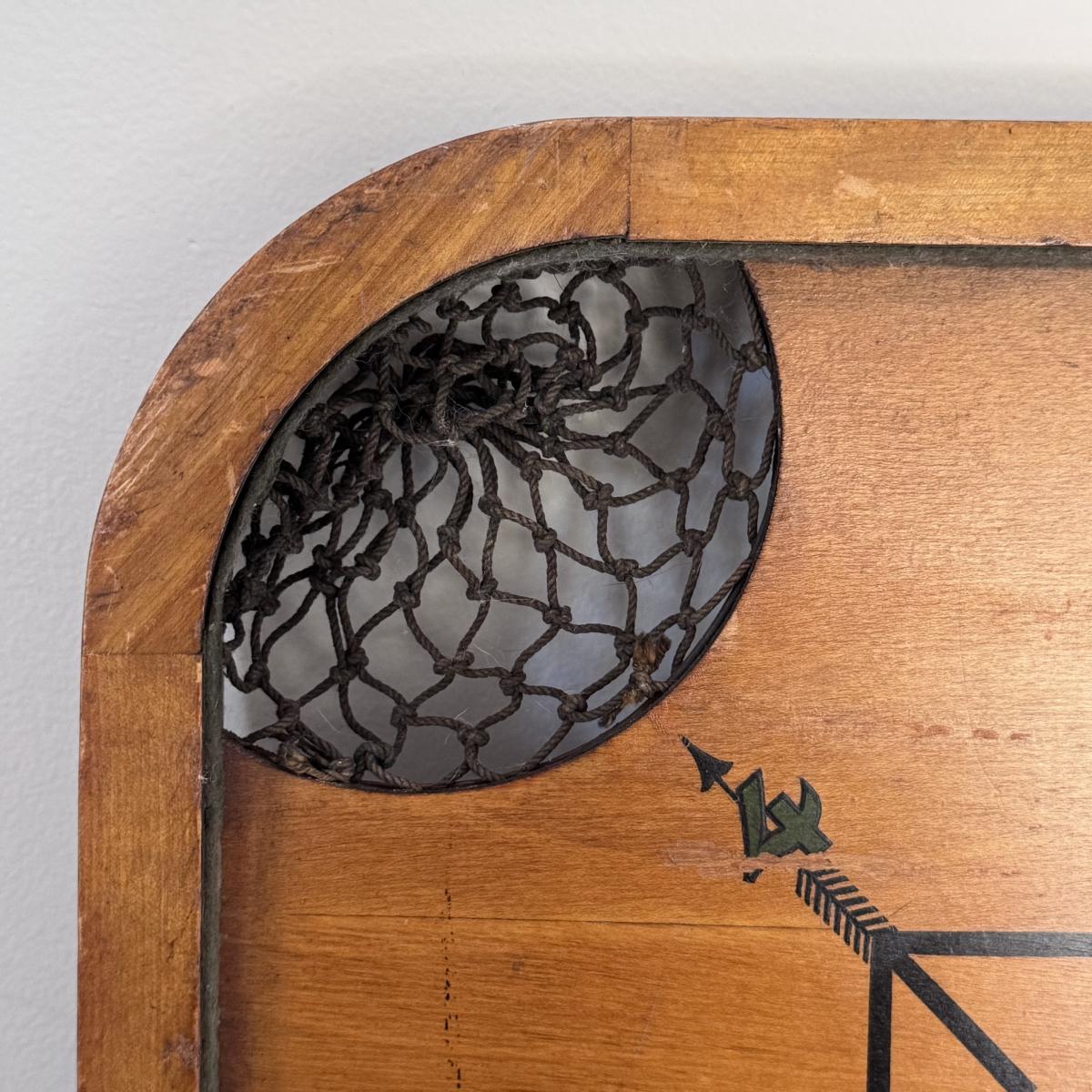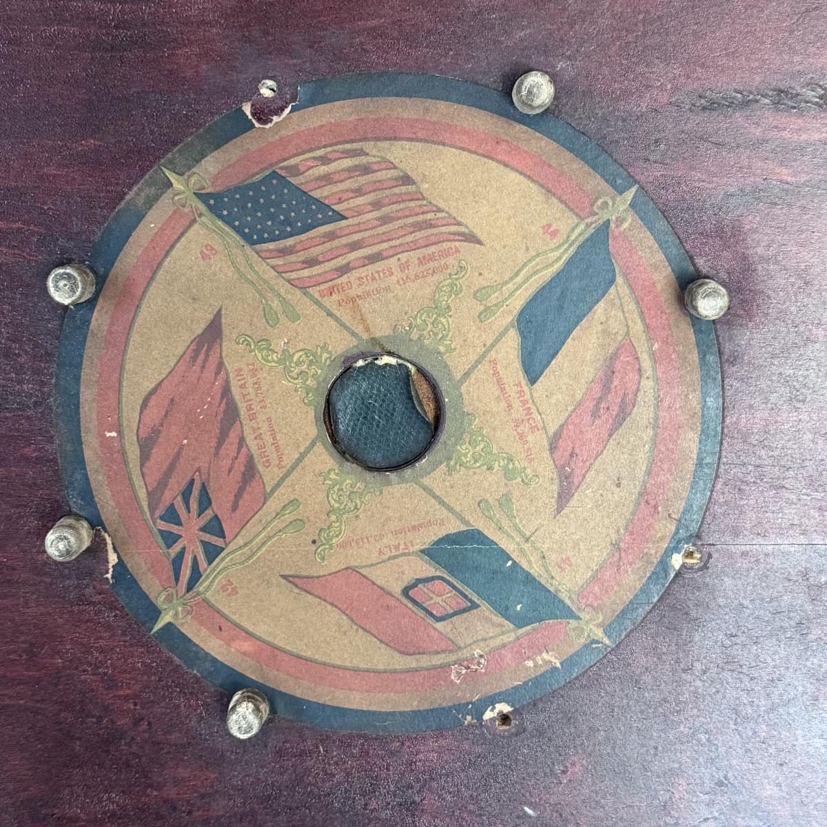 This lot includes one “Flags of The Nation” Carrom tabletop game. The game is made of wood with rope corners. There are some signs of wear due to age including some ripped paper where the decorative flags are - see pictures included. The board measures 28.5” square x 1.5”W. Shipping available.