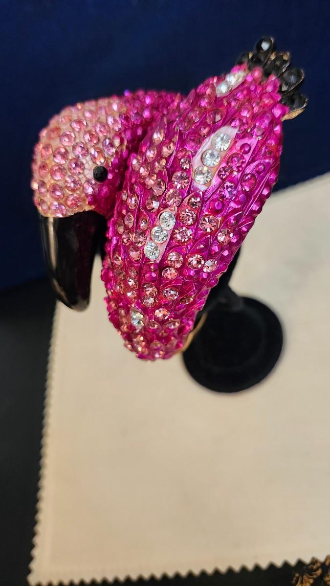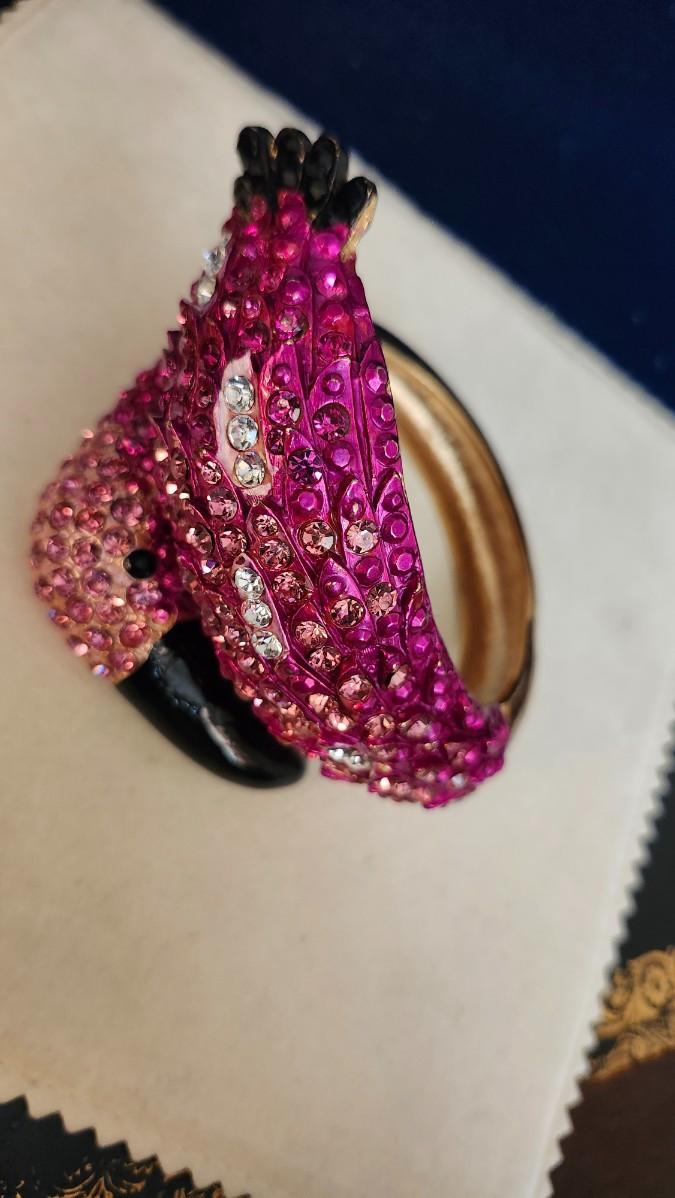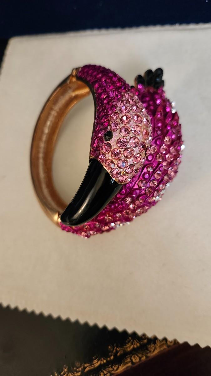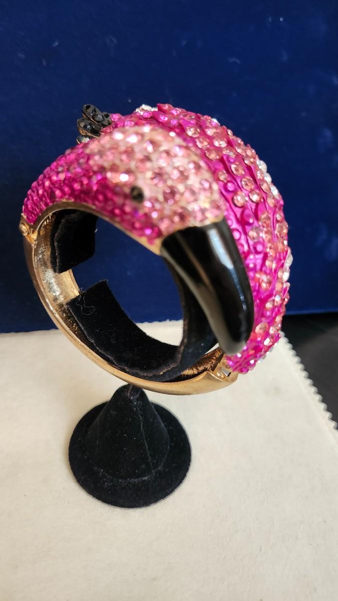 Gold Tone with pink and black rhinestones on this fun bracelet. The rhinestones are likely Swarovski, and no stones are missing. The clamp and hinge work very well.