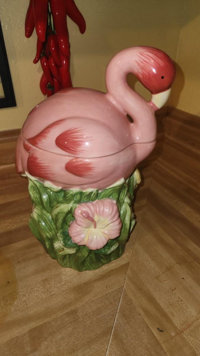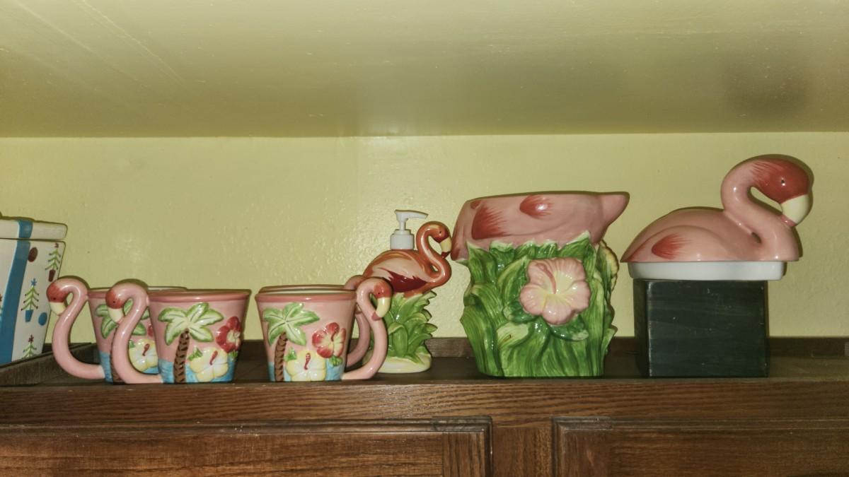 4 flamingo cups, 1 flamingo cookie jar, and 1 flamingo soap dispenser.