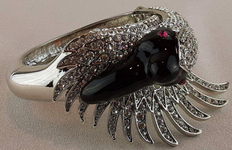 Silvertone metal oval bangle bracelet covered in crystals. Measures 2.5in outside and inside oval is 2.25in.