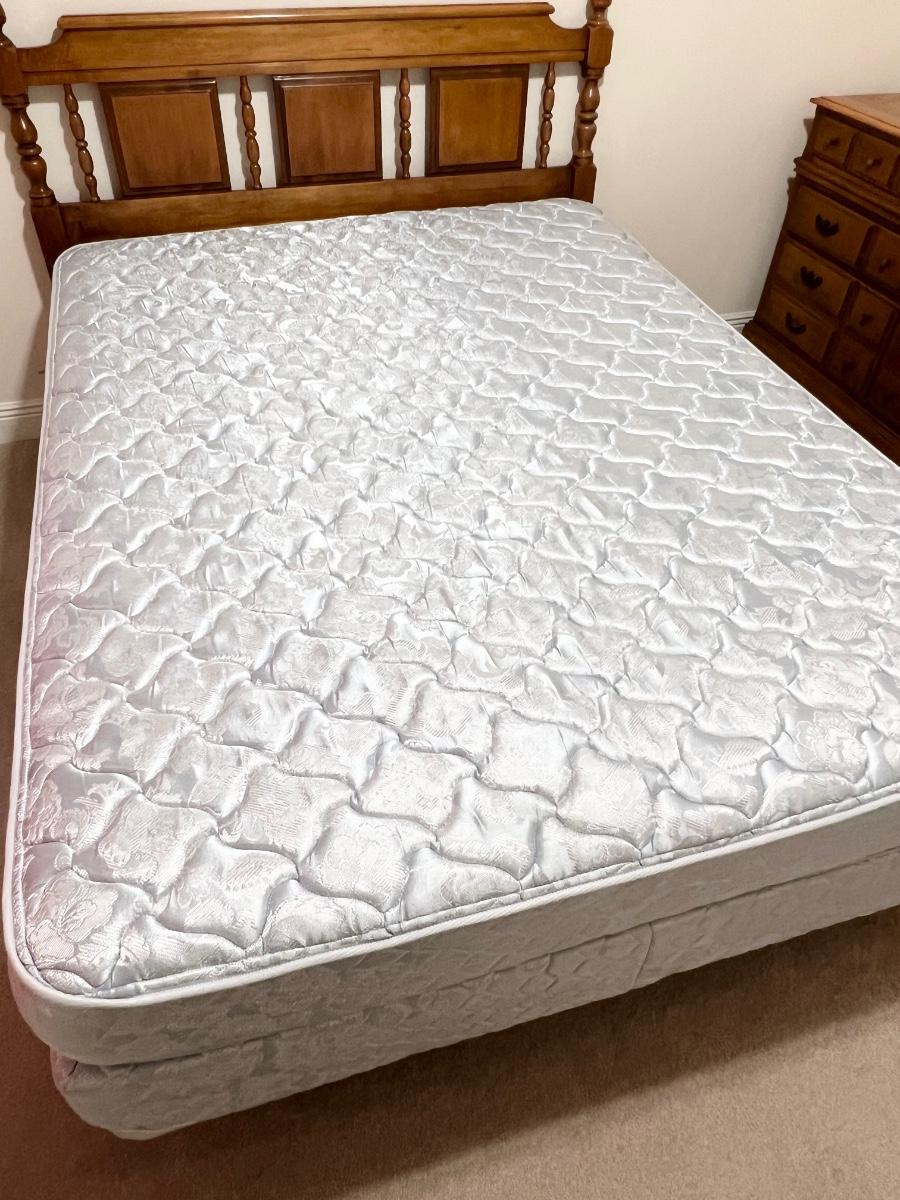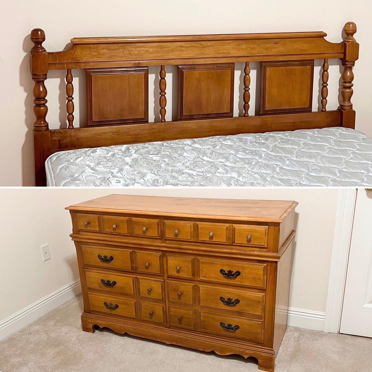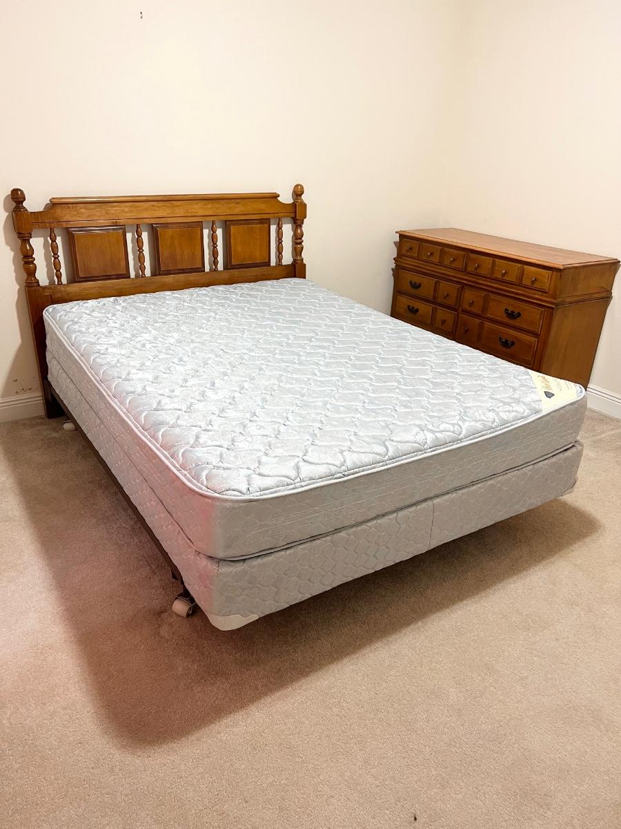 Includes: Headboard, 6 drawer dresser, bed rails, SPRING AIR mattress & box spring ~ Bed can be queen or full size ~ Mattress had a protective cover, mattress has also been disinfected, sanitized, & deodorized ~ Headboard = 45” ~ Dresser = 33” H x 50” W x 19” D