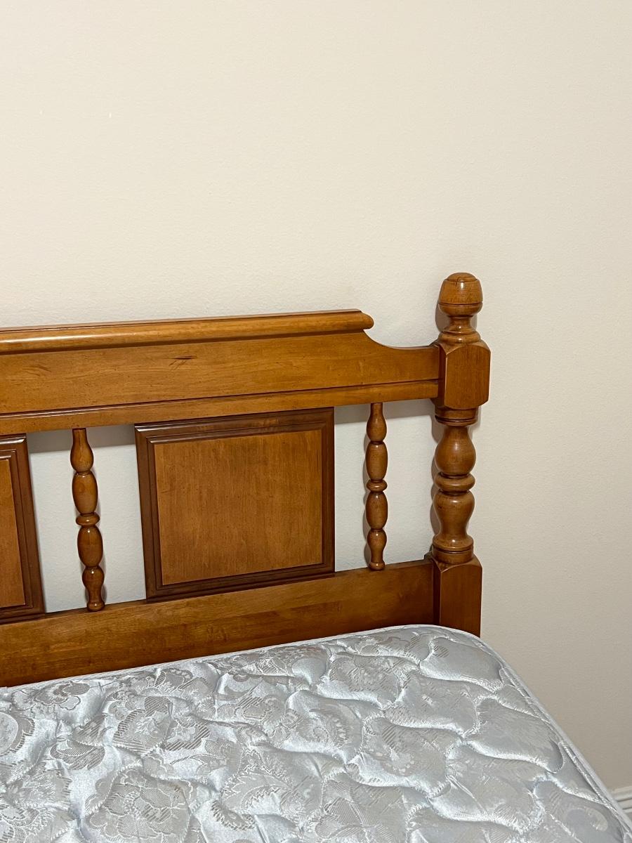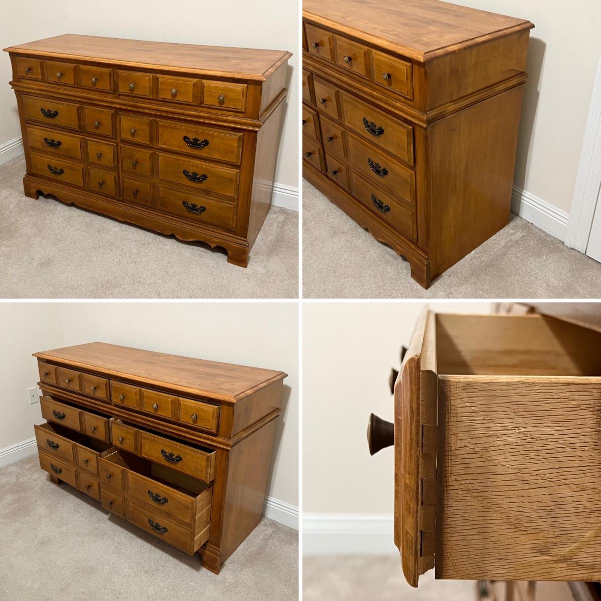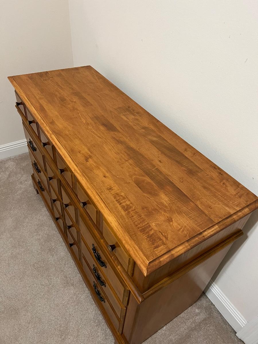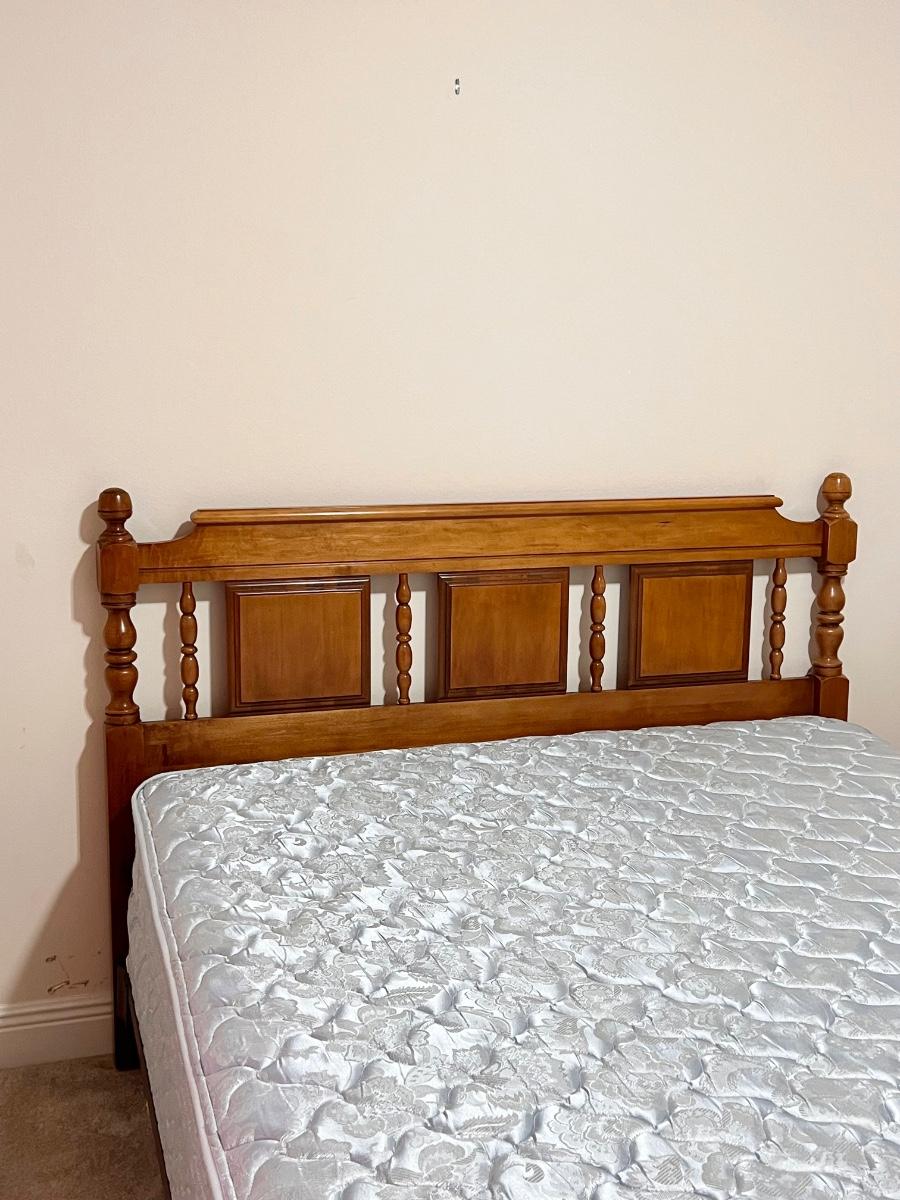 Includes: Headboard, 6 drawer dresser, bed rails, SPRING AIR mattress & box spring ~ Bed can be queen or full size ~ Mattress had a protective cover, mattress has also been disinfected, sanitized, & deodorized ~ Headboard = 45” ~ Dresser = 33” H x 50” W x 19” D