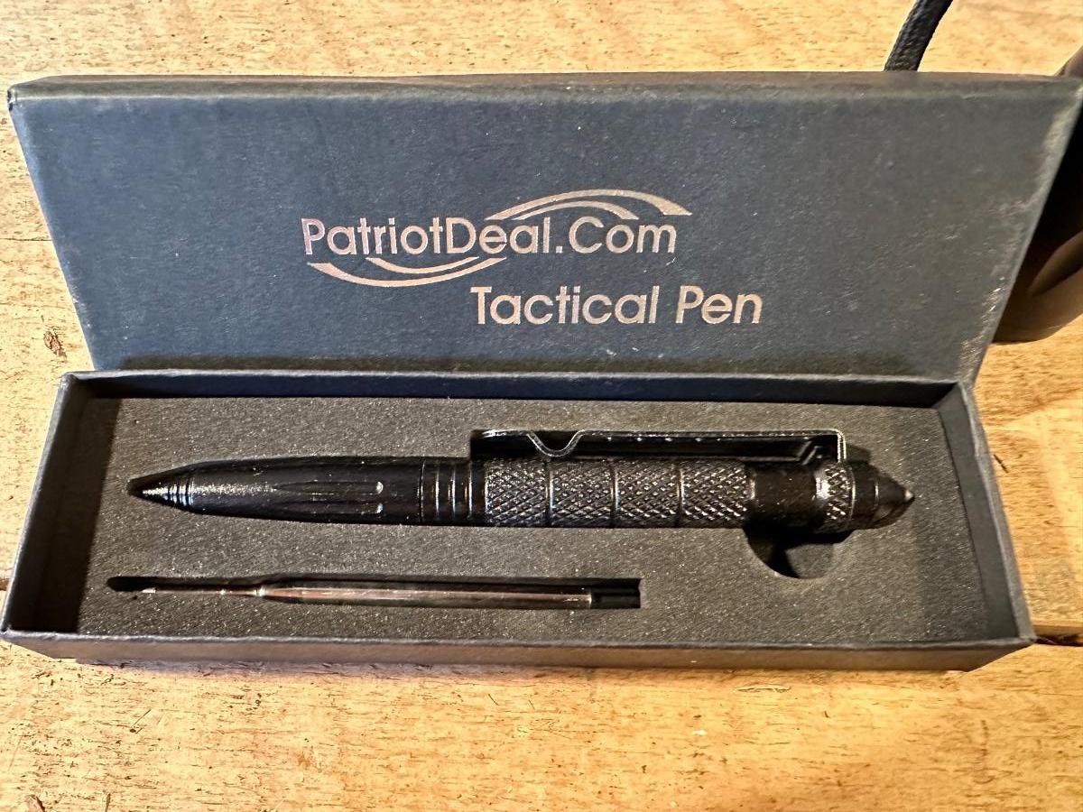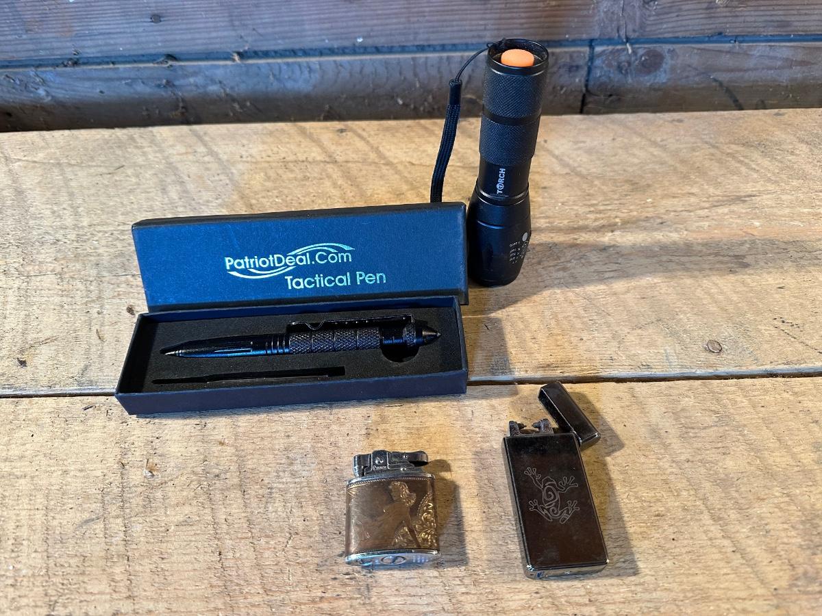 2 unique lighters, one has a nude gal and the other has a cool looking frog. Tactical Pen from Patriotdeal.com, and a Flashlight called Torch.