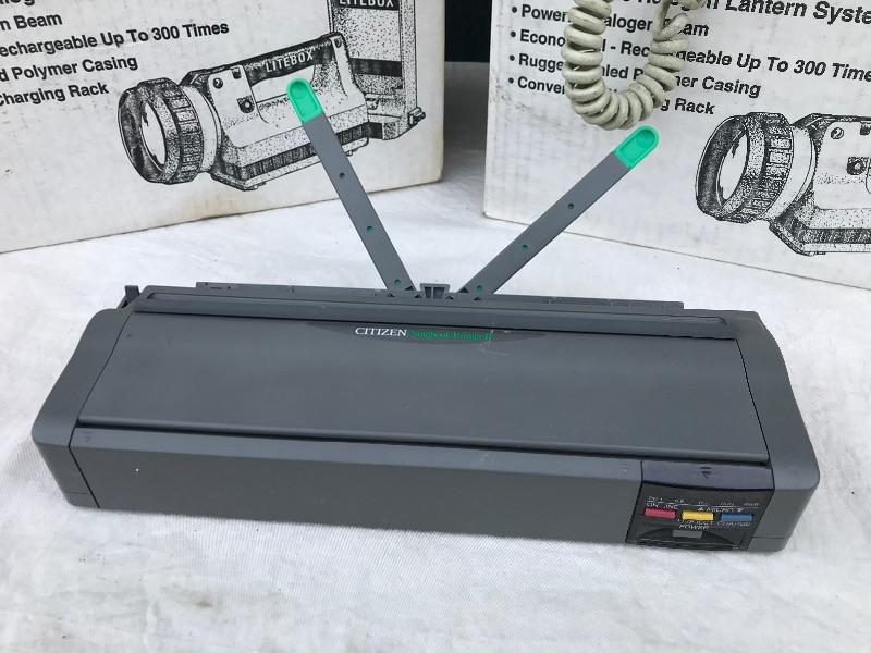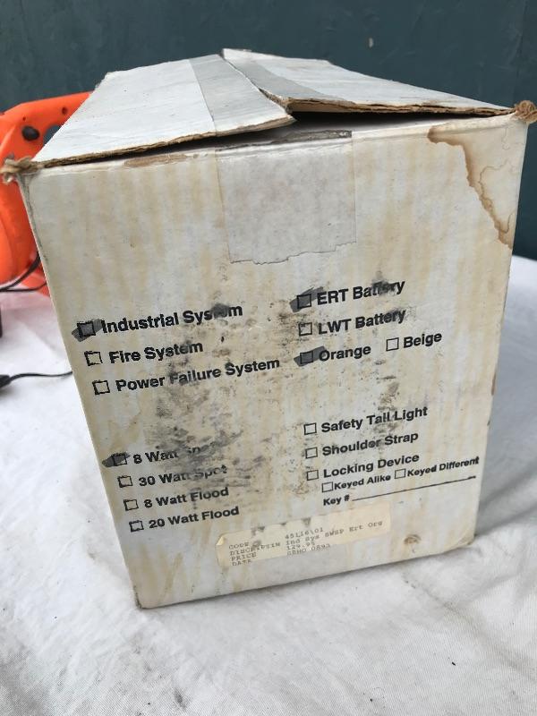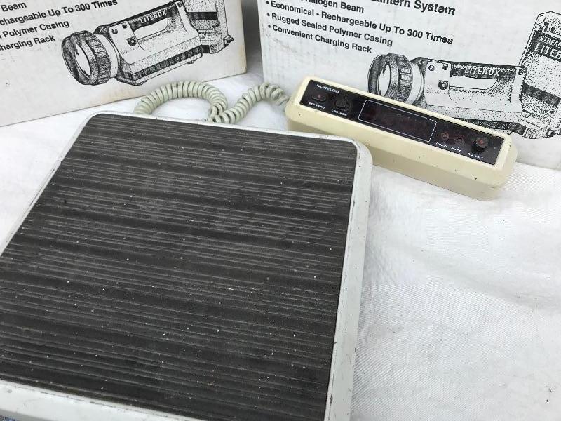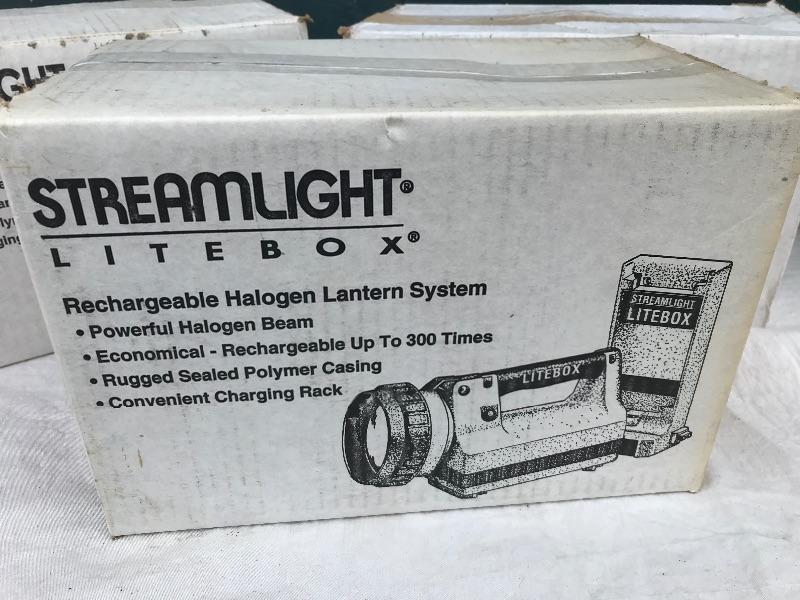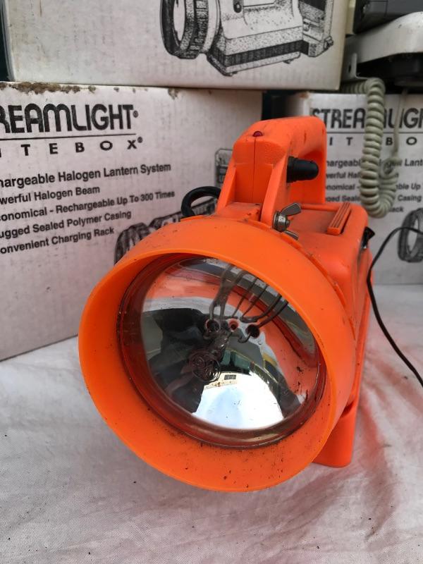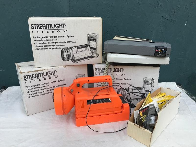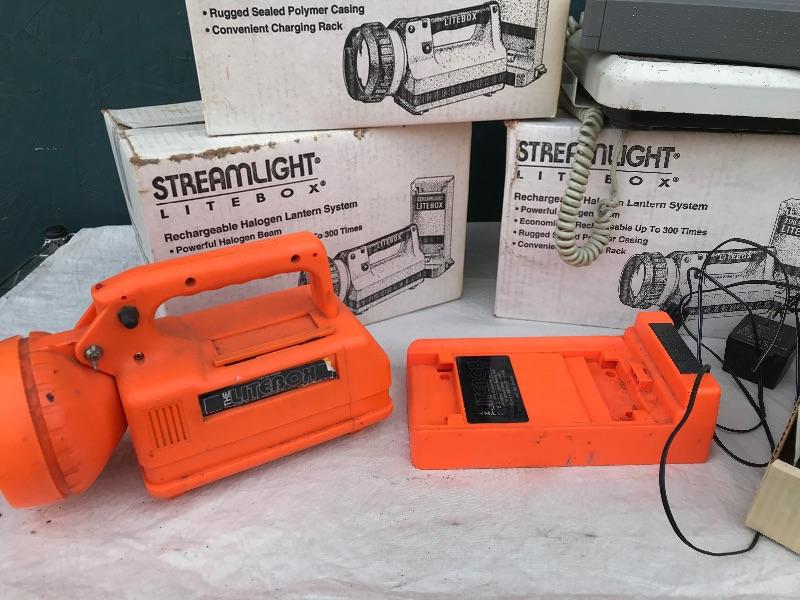Used by firefighters, high powered, industrial flashlights. Three of the Streamlights are still in original boxes and have never been used. Includes extra bulbs, a vintage portable printer, and a scale.