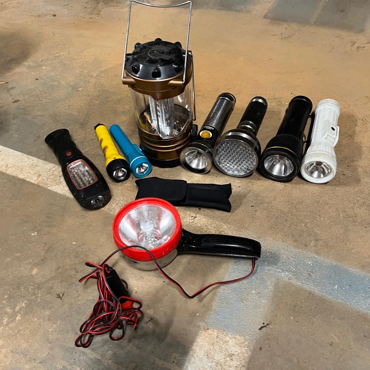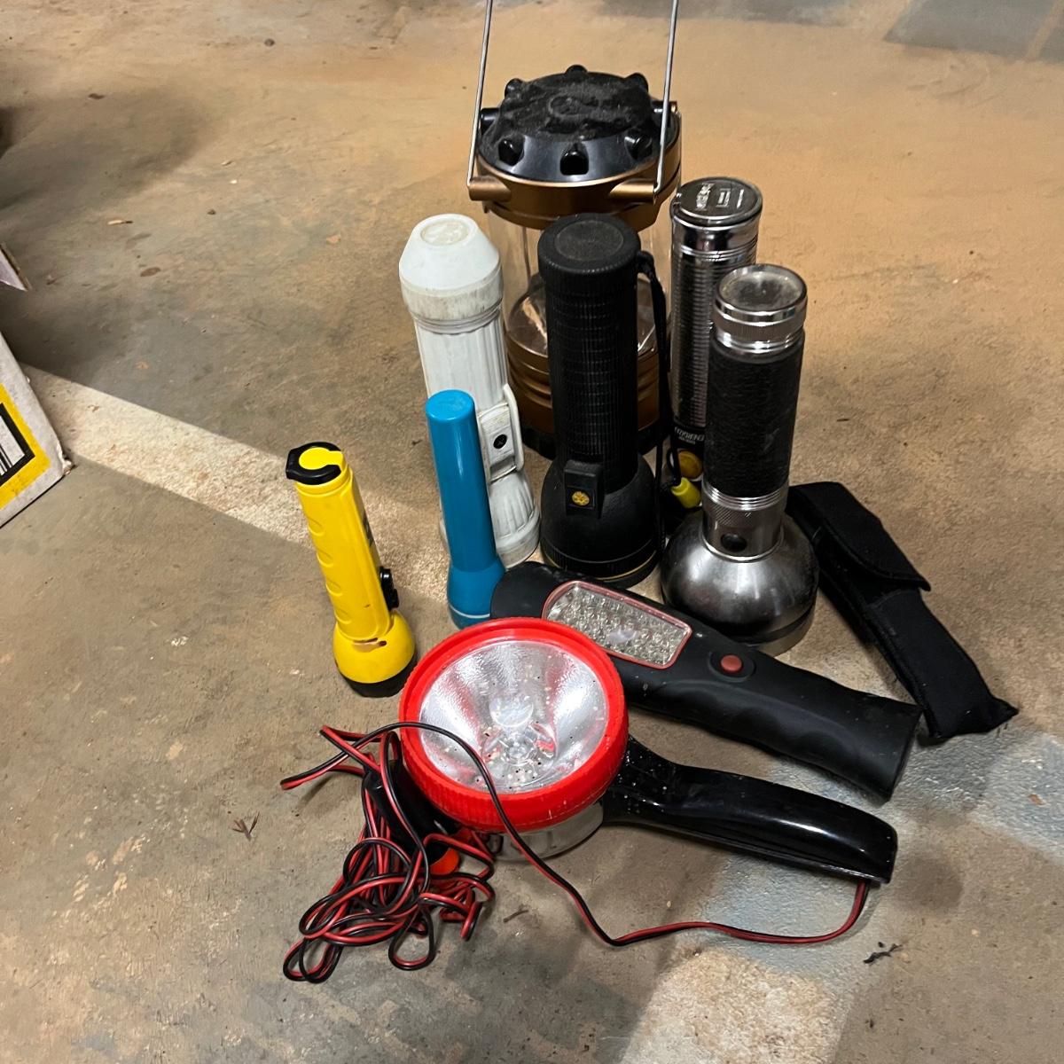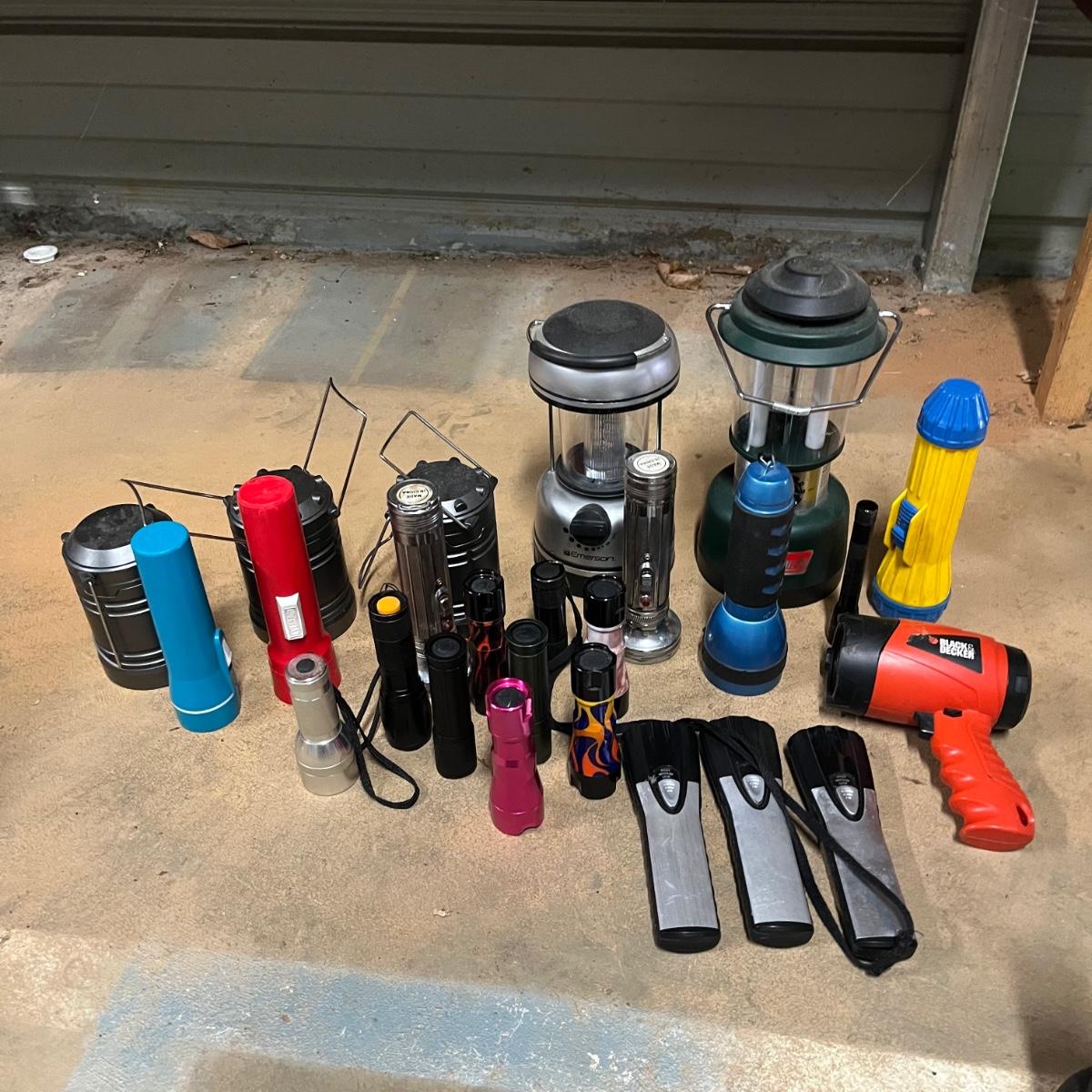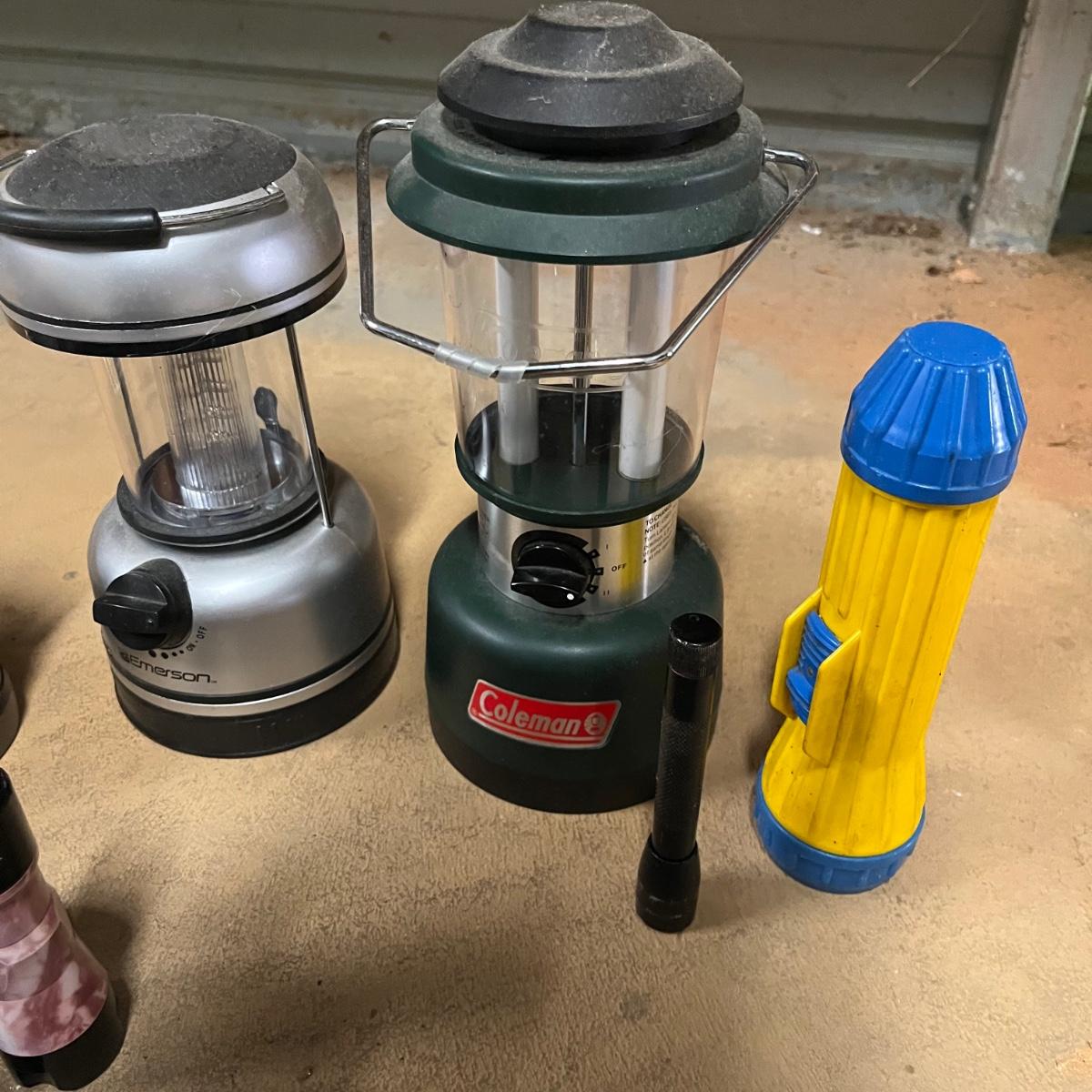 Lot includes a large selection of flashlights in a variety of sizes and shapes. Also includes Coleman lantern and four LED lanterns. First picture shows items that worked when tested (over half of the items) The others appear to need batteries.