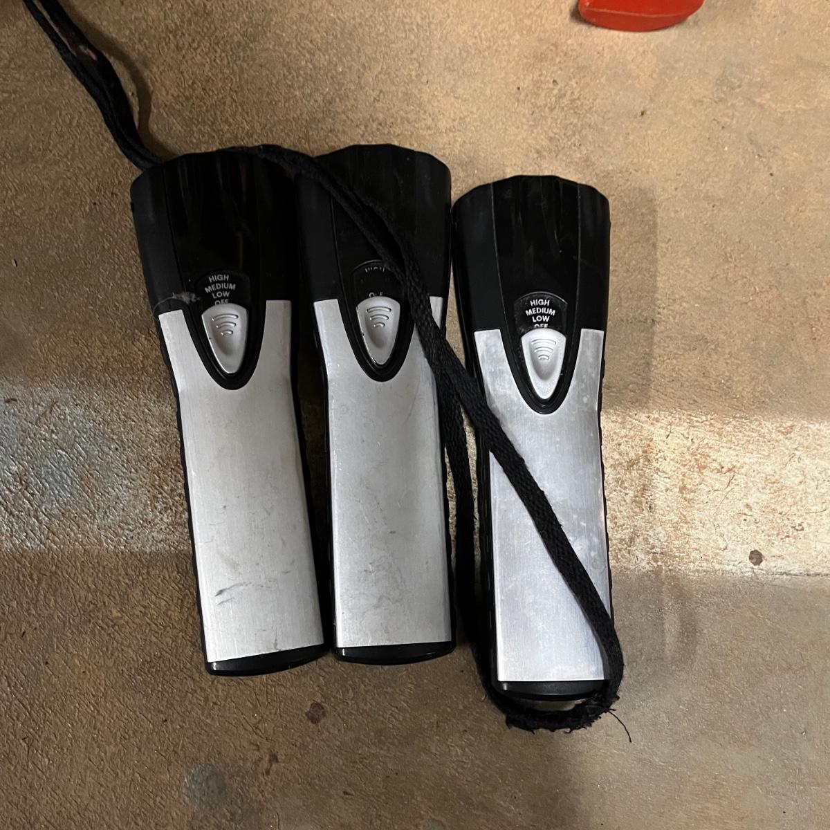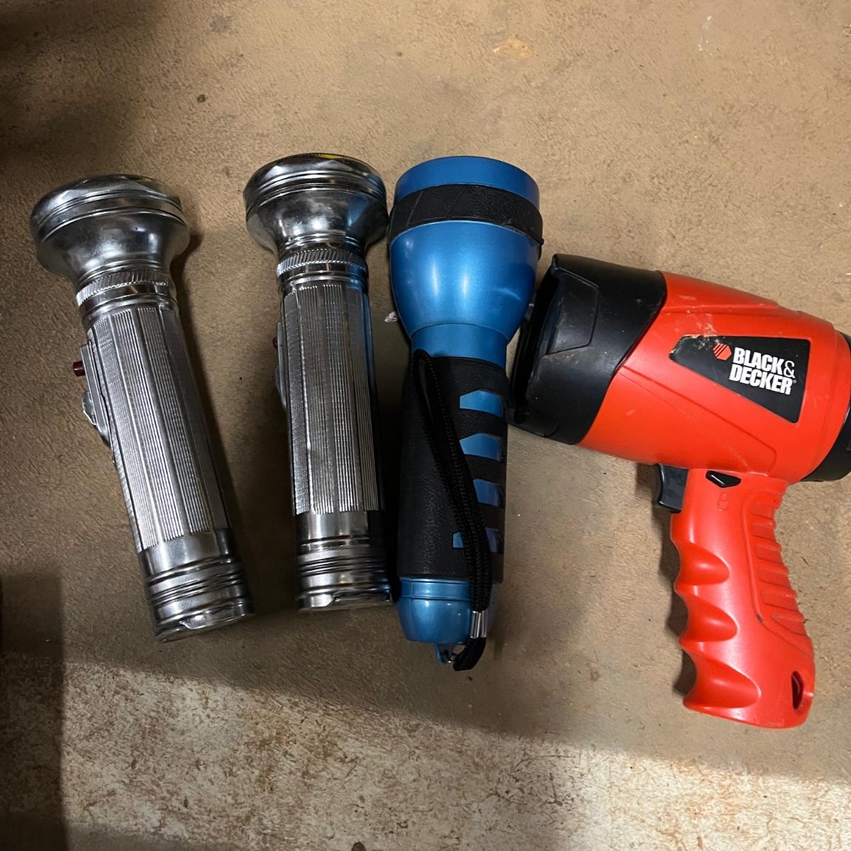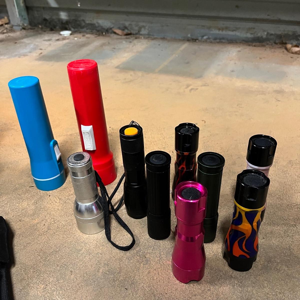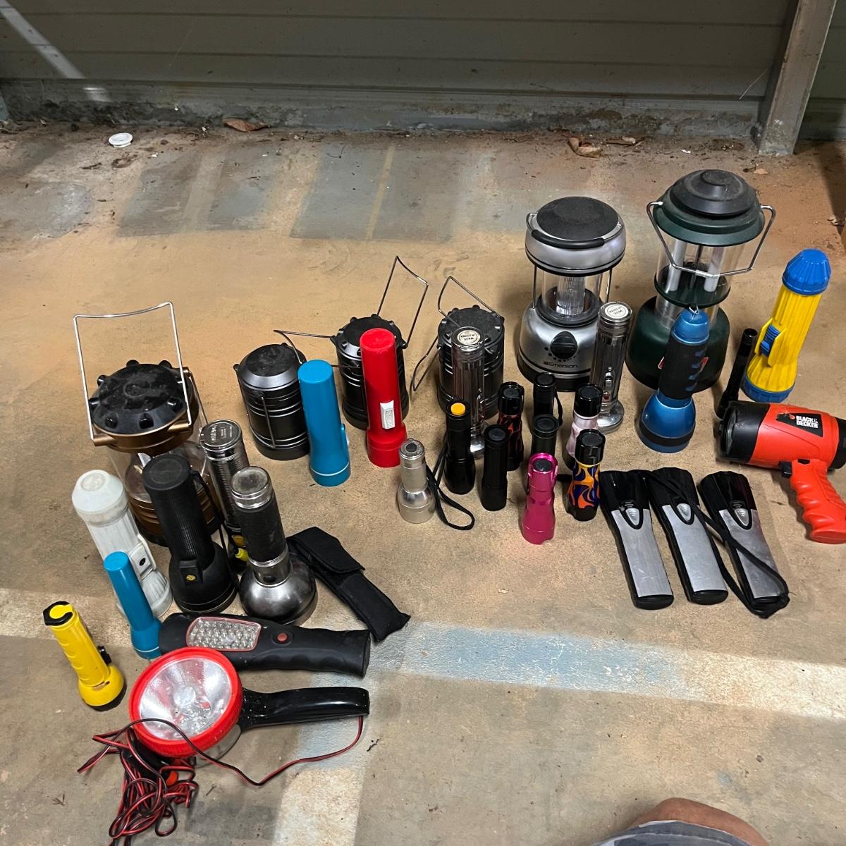Lot includes a large selection of flashlights in a variety of sizes and shapes. Also includes Coleman lantern and four LED lanterns. First picture shows items that worked when tested (over half of the items) The others appear to need batteries.