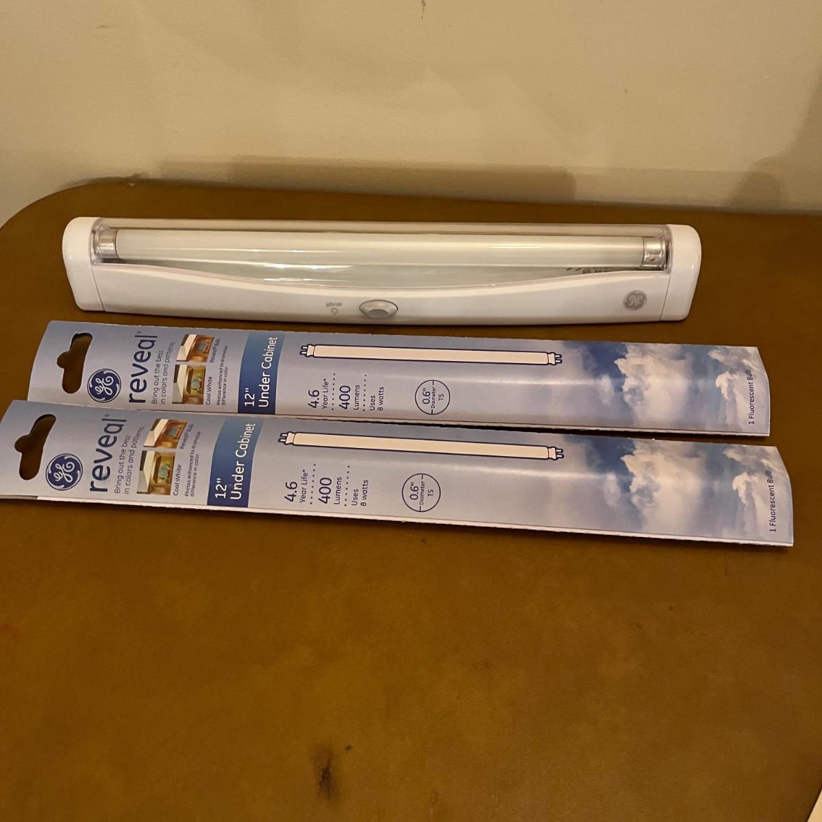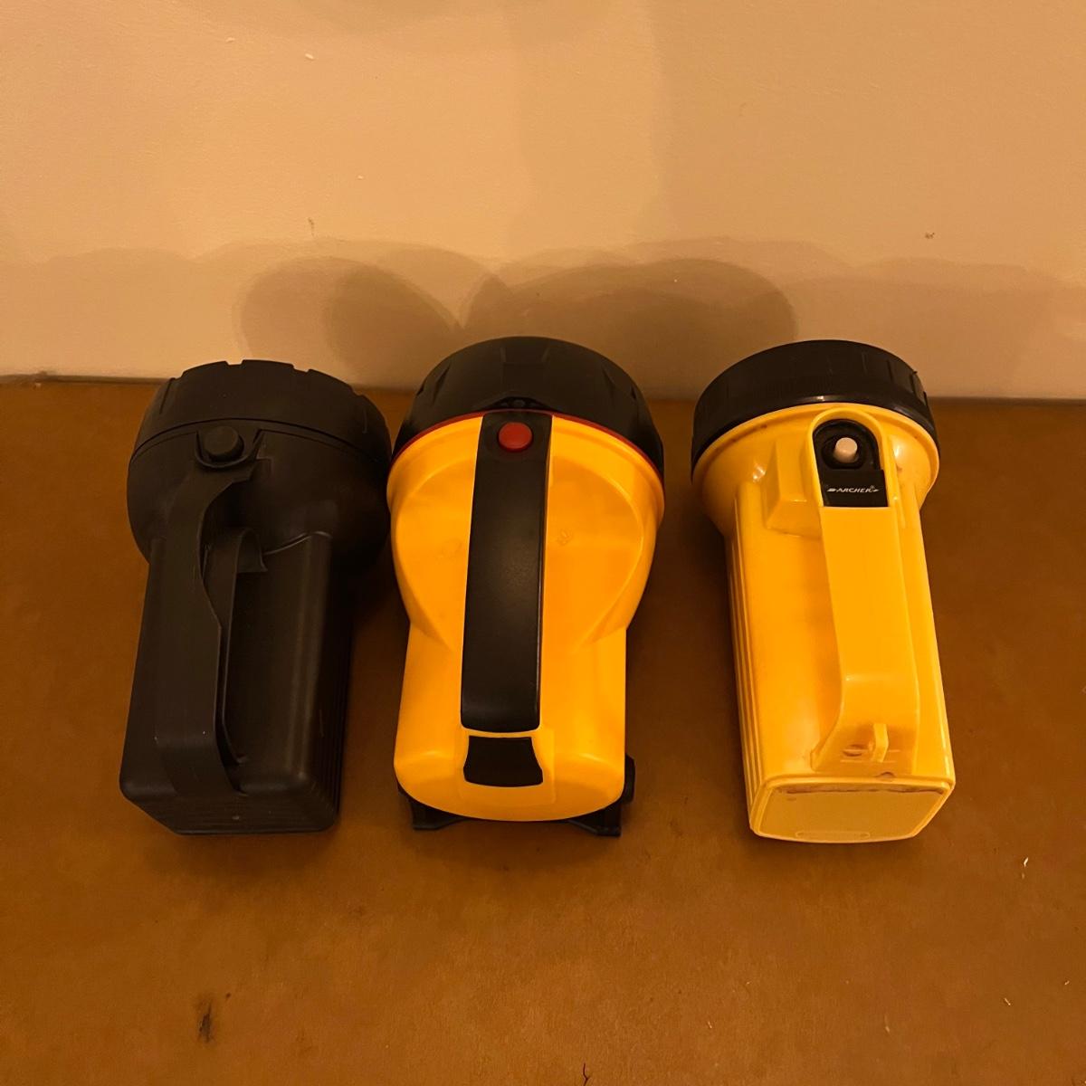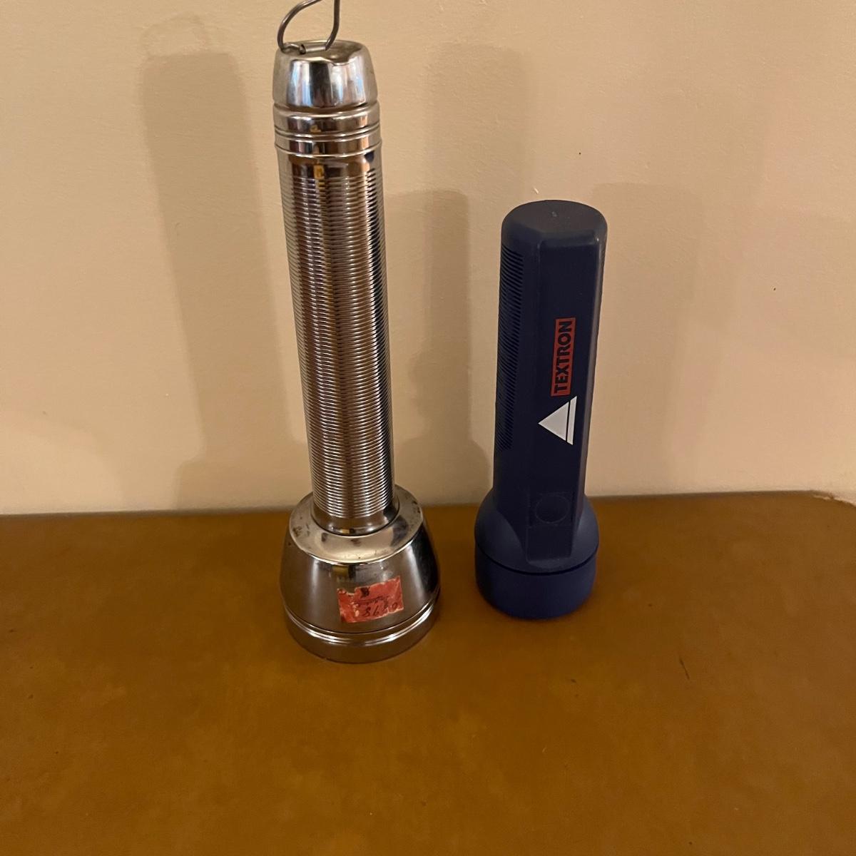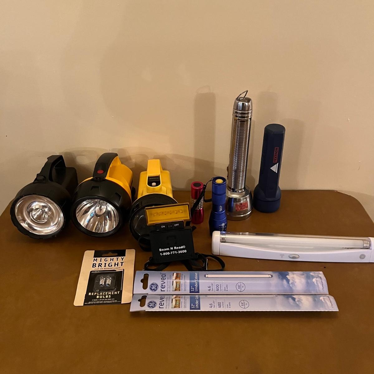 Lot includes three six volt flashlights, two LED flashlights, two D battery flashlights, GE under cabinet light with two extra bulbs and a Beam N Read light. Three flashlights are missing batteries and were not tested, the rest all worked. Under cabinet light measures 12.5” long.