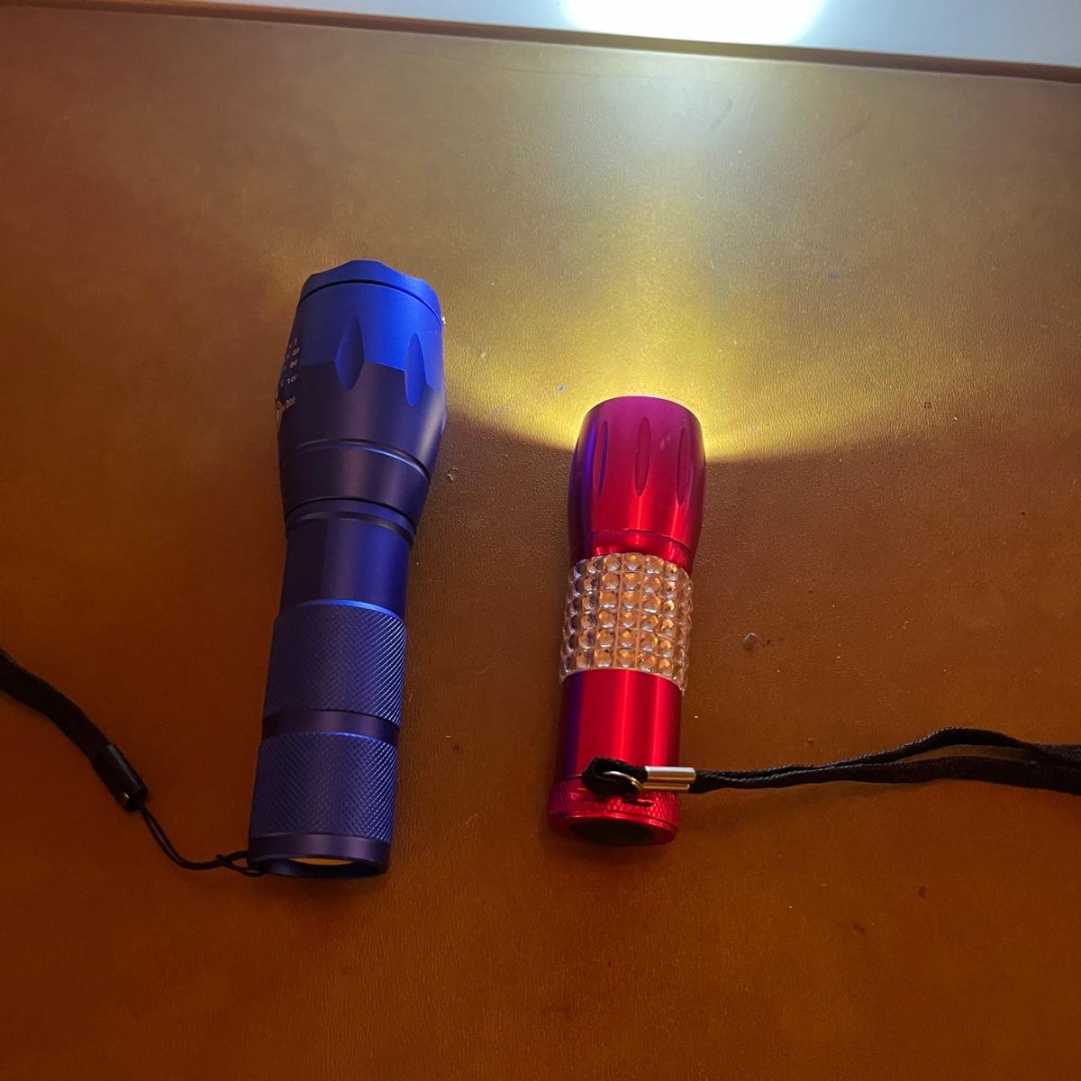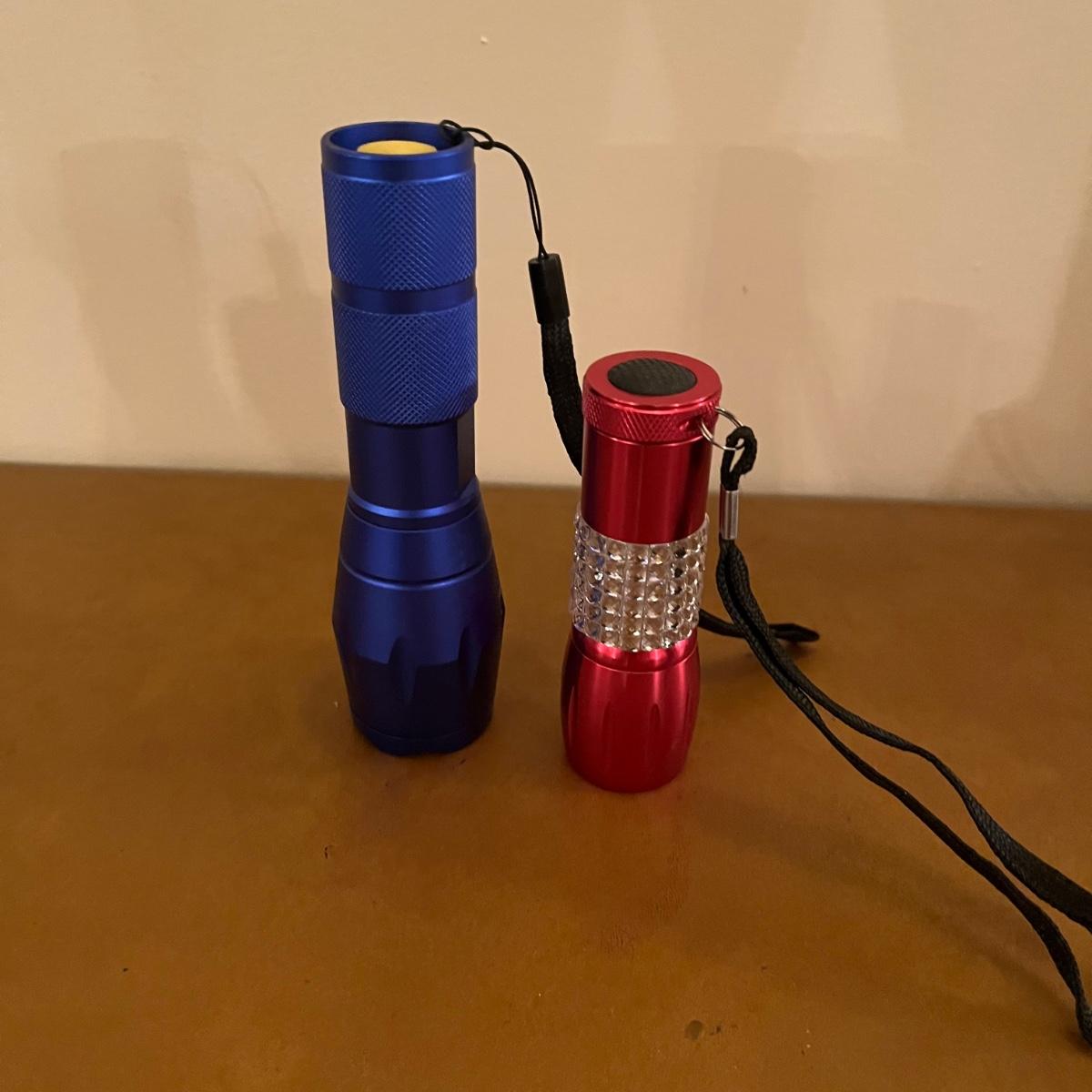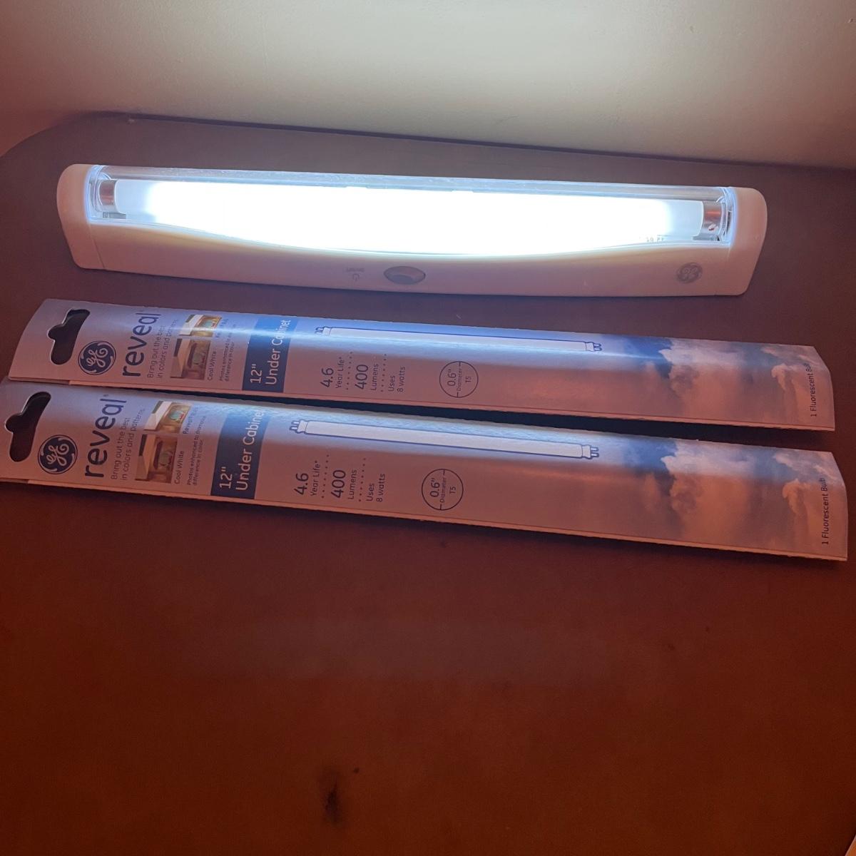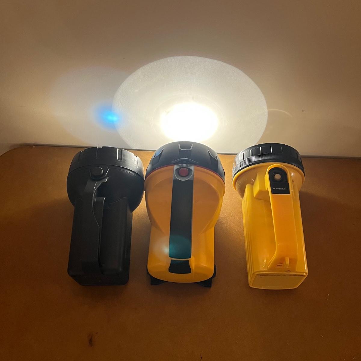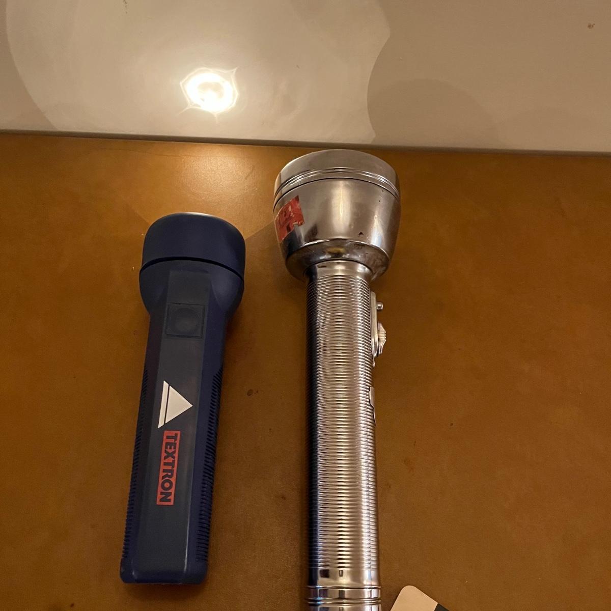 Lot includes three six volt flashlights, two LED flashlights, two D battery flashlights, GE under cabinet light with two extra bulbs and a Beam N Read light. Three flashlights are missing batteries and were not tested, the rest all worked. Under cabinet light measures 12.5” long.