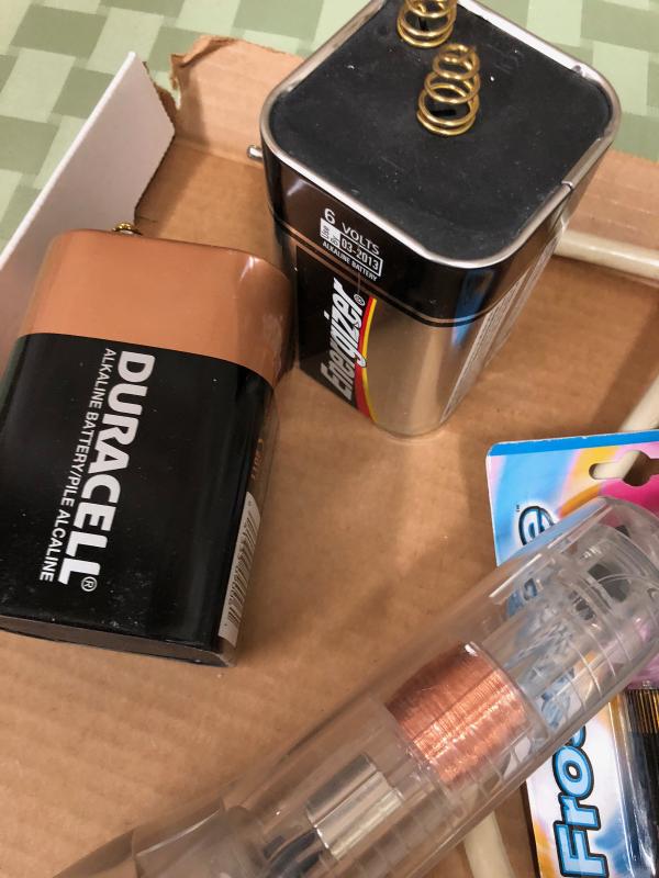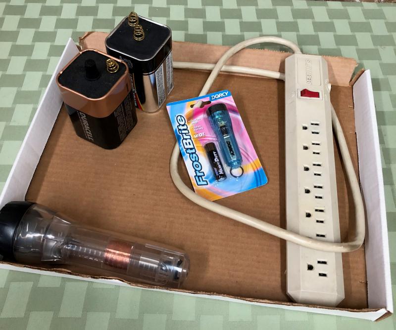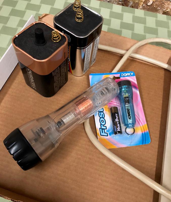 This lot contains a couple of 6volt lantern batteries..two flashlights and an AC power strip...