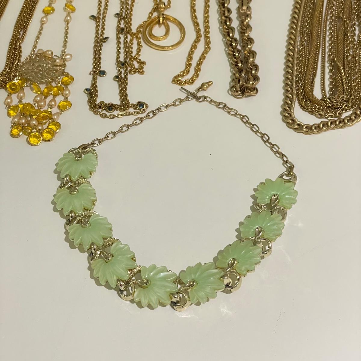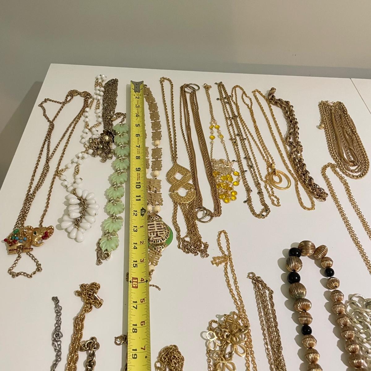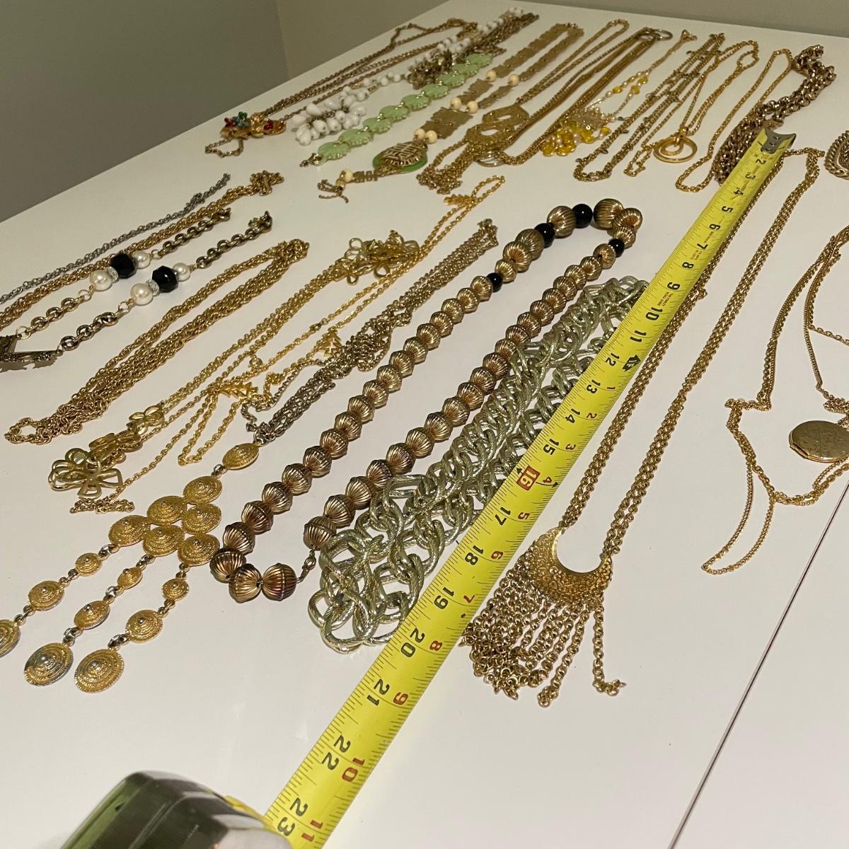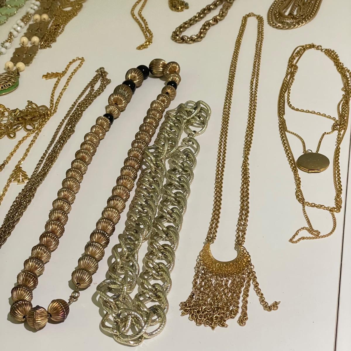Over twenty pieces of gold fashion jewelry with beads, stones and chains. Lot includes a range of lengths in the necklaces and two bracelets. One vintage necklace with amber colored gems is missing one stone, but we’ve included a broken matching necklace to replace the missing piece. The green leafy choker appears to be made of resin. See images. Shipping available.