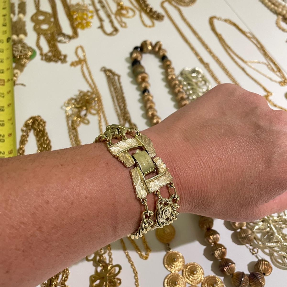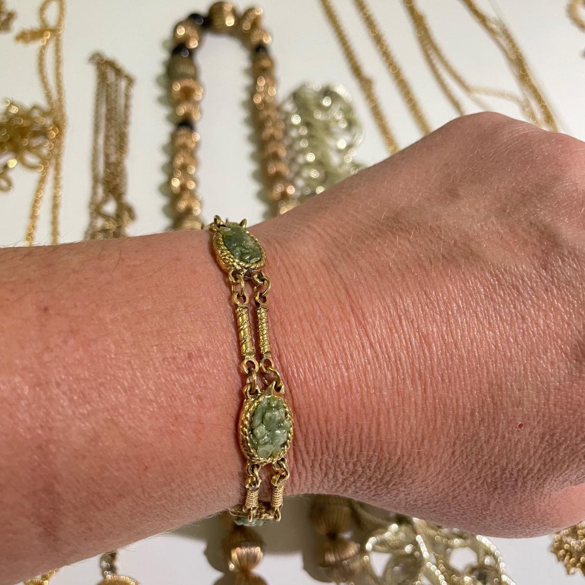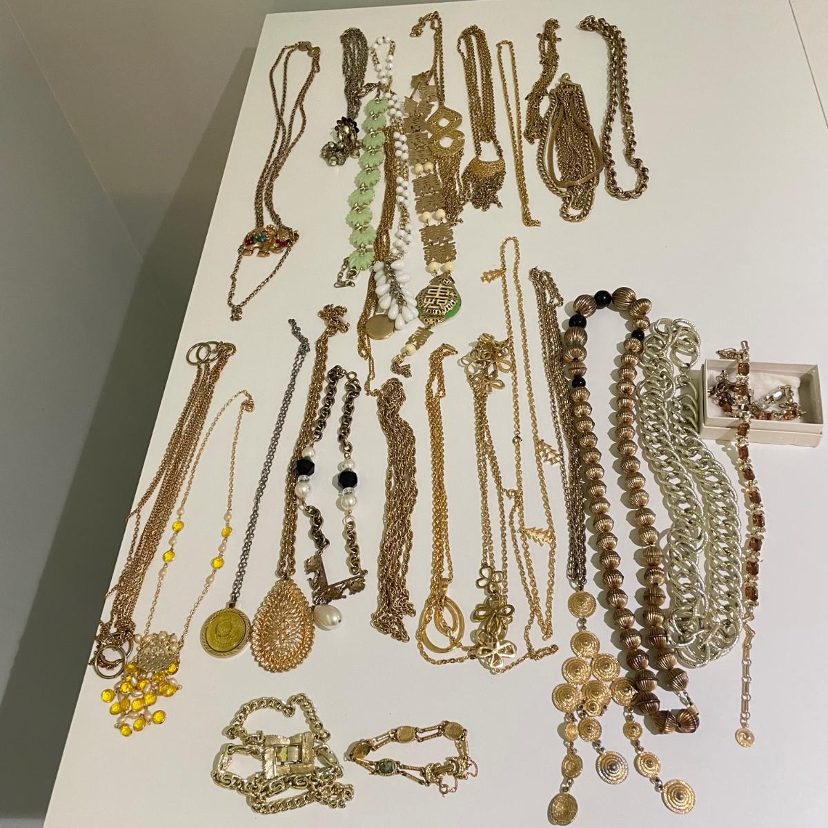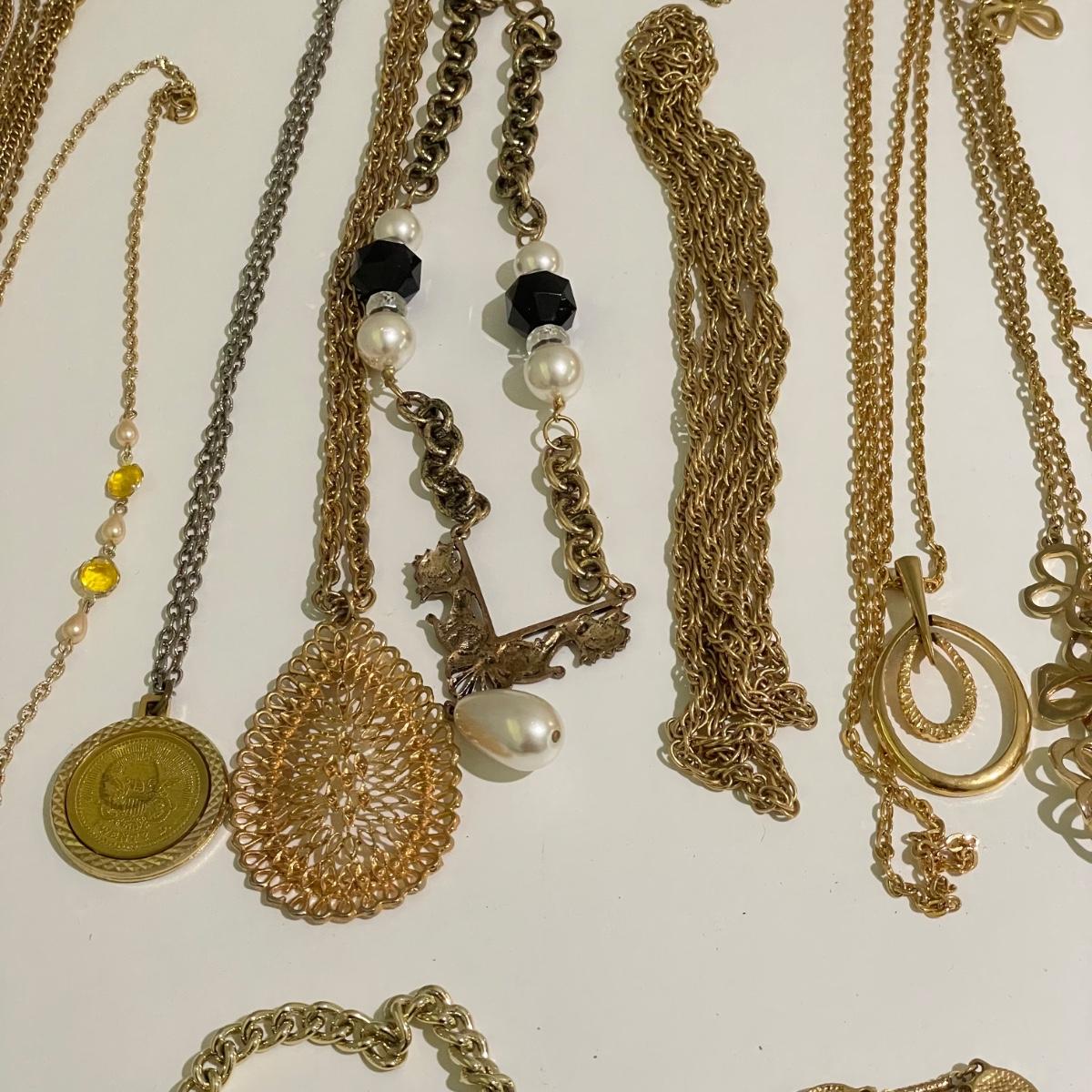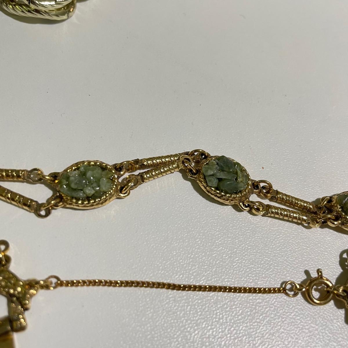 Over twenty pieces of gold fashion jewelry with beads, stones and chains. Lot includes a range of lengths in the necklaces and two bracelets. One vintage necklace with amber colored gems is missing one stone, but we’ve included a broken matching necklace to replace the missing piece. The green leafy choker appears to be made of resin. See images. Shipping available.