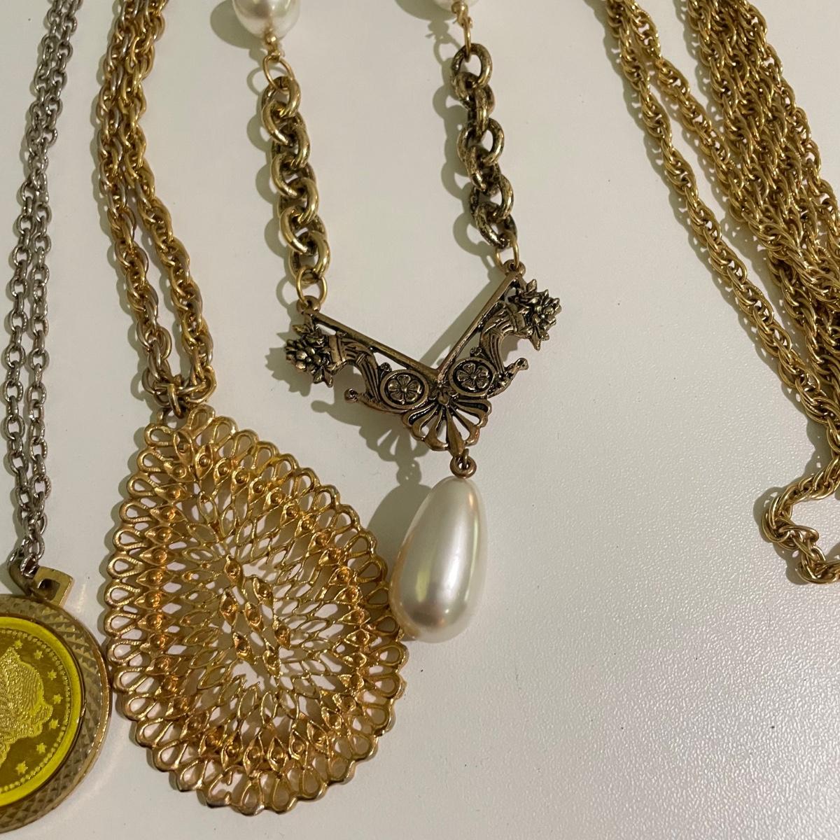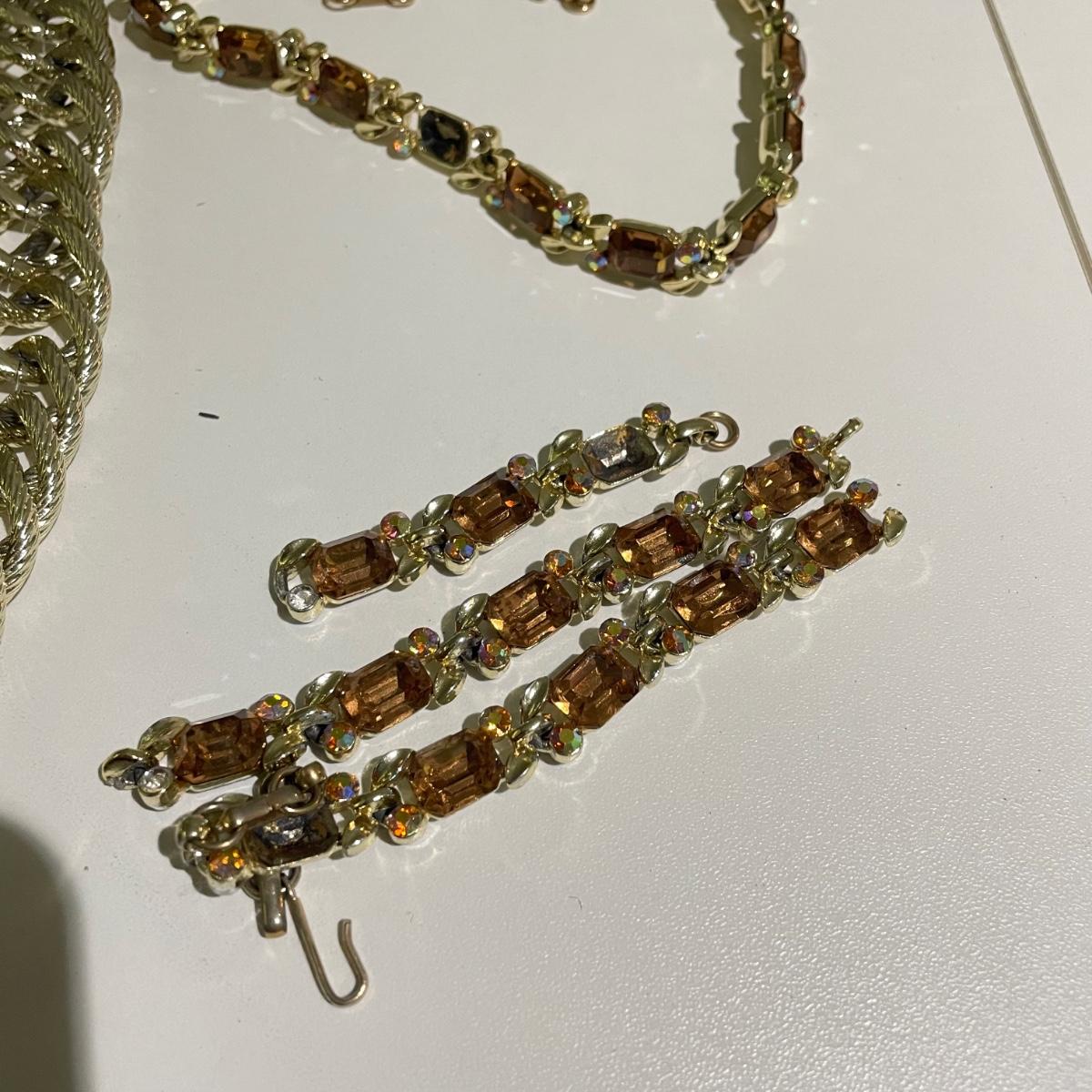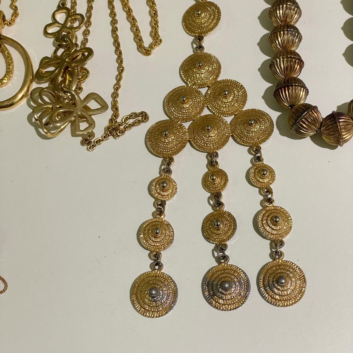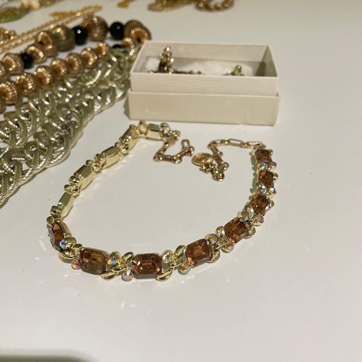 Over twenty pieces of gold fashion jewelry with beads, stones and chains. Lot includes a range of lengths in the necklaces and two bracelets. One vintage necklace with amber colored gems is missing one stone, but we’ve included a broken matching necklace to replace the missing piece. The green leafy choker appears to be made of resin. See images. Shipping available.