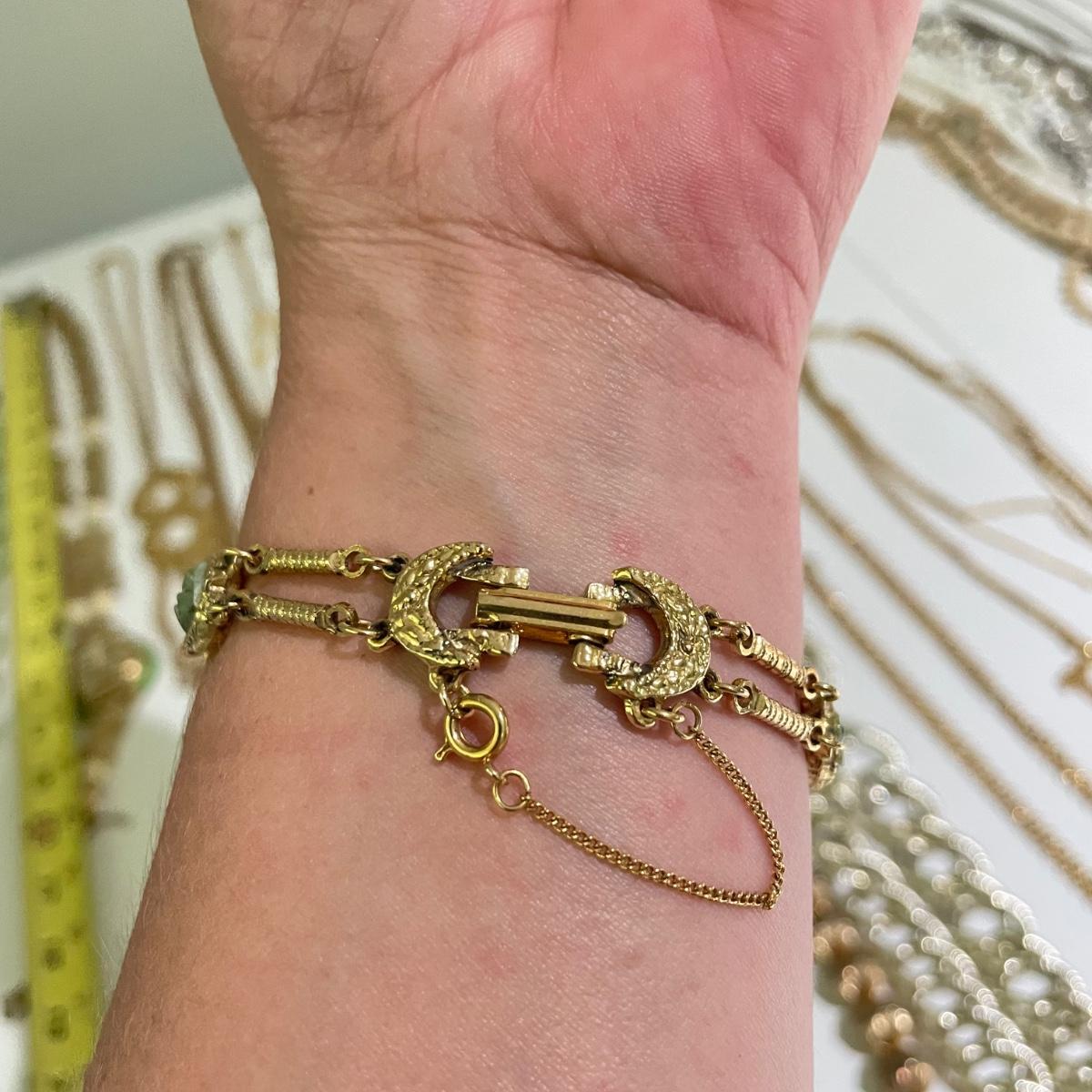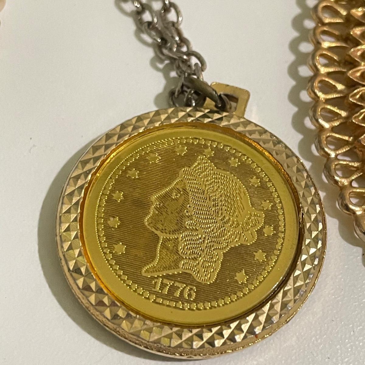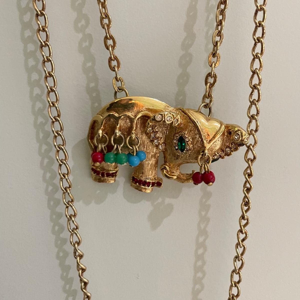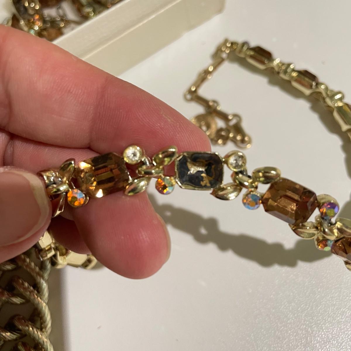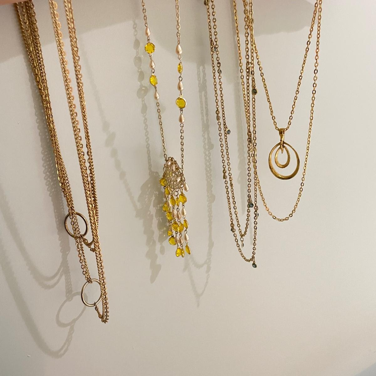 Over twenty pieces of gold fashion jewelry with beads, stones and chains. Lot includes a range of lengths in the necklaces and two bracelets. One vintage necklace with amber colored gems is missing one stone, but we’ve included a broken matching necklace to replace the missing piece. The green leafy choker appears to be made of resin. See images. Shipping available.