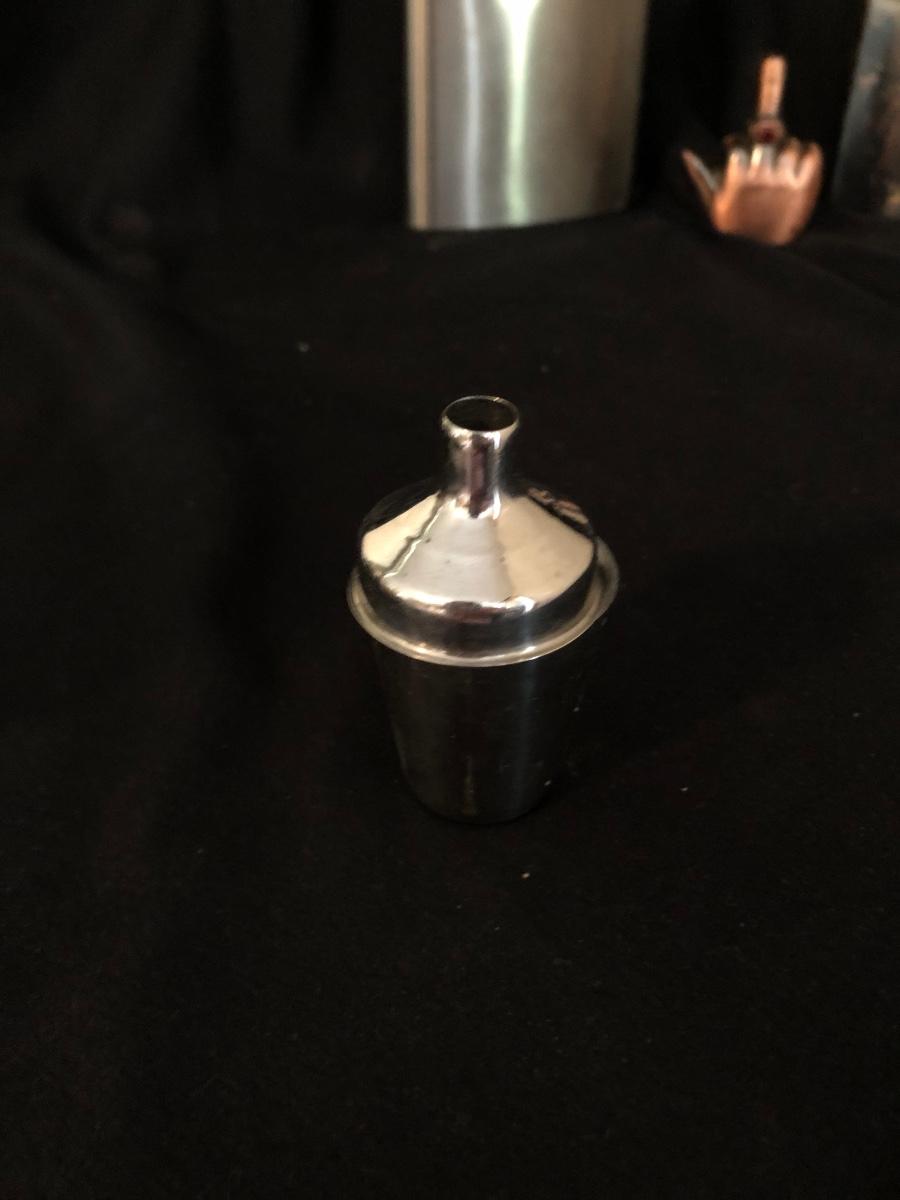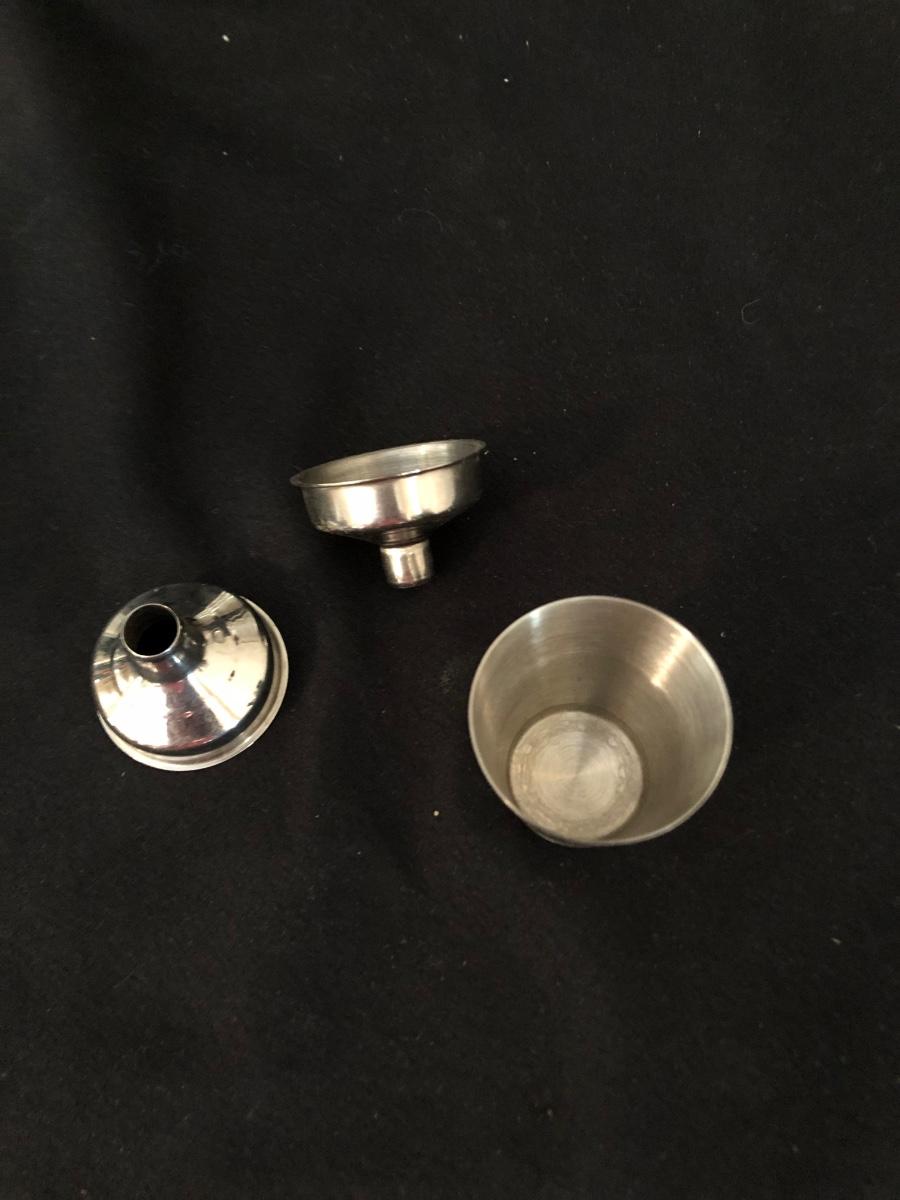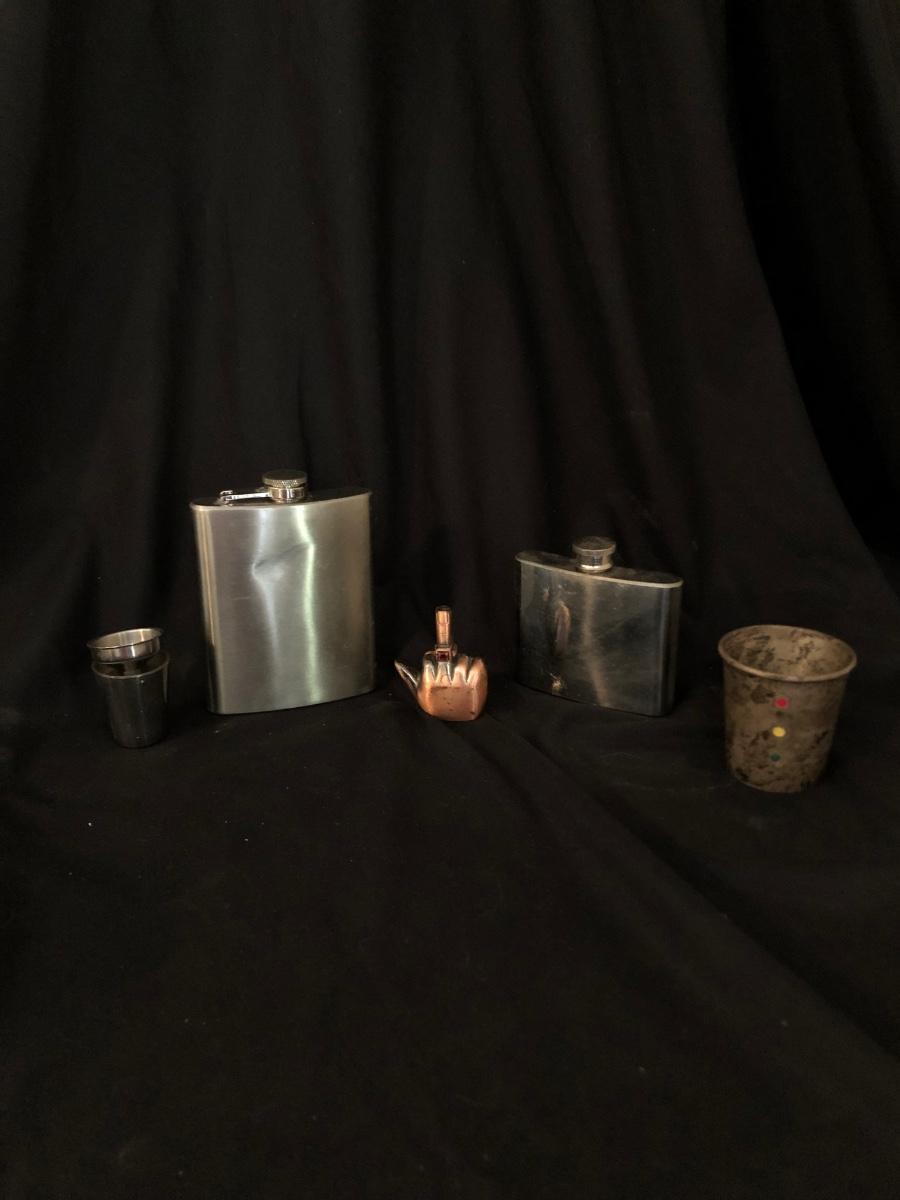 Lot includes an Alvin Sterling SS275 Stoplight jigger and two Stainless steel flasks (one smaller and one a little bigger). A functioning "middle finger" lighter, as well as a metal flask funnel are also included.