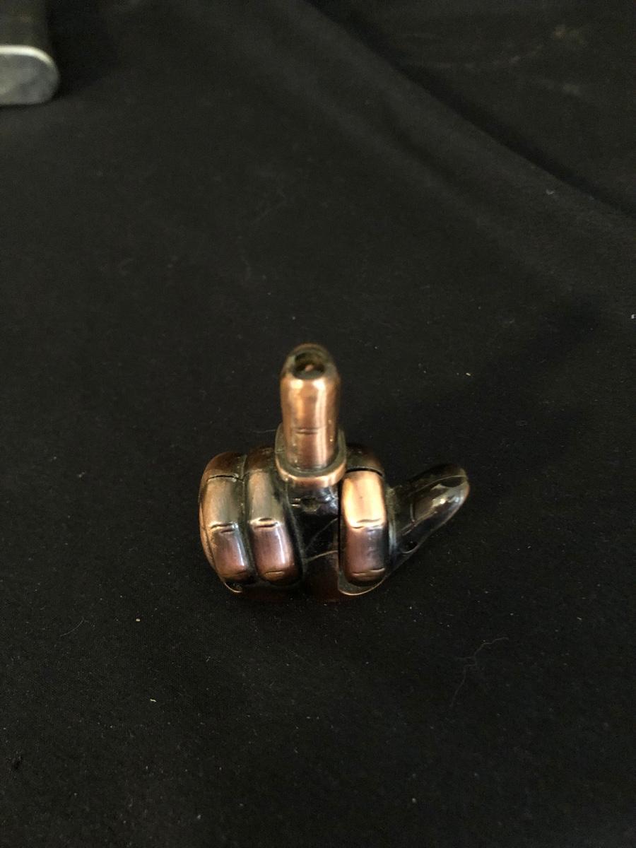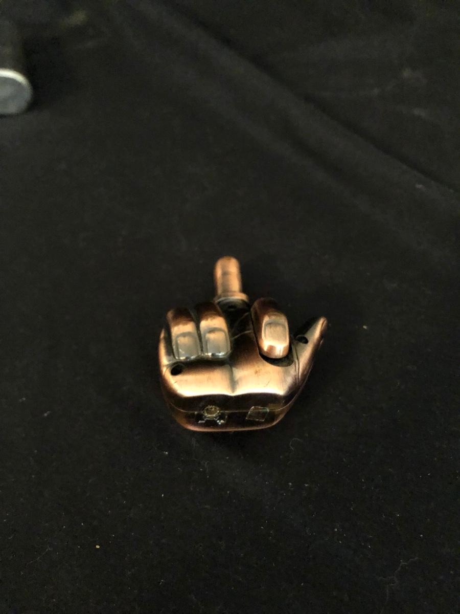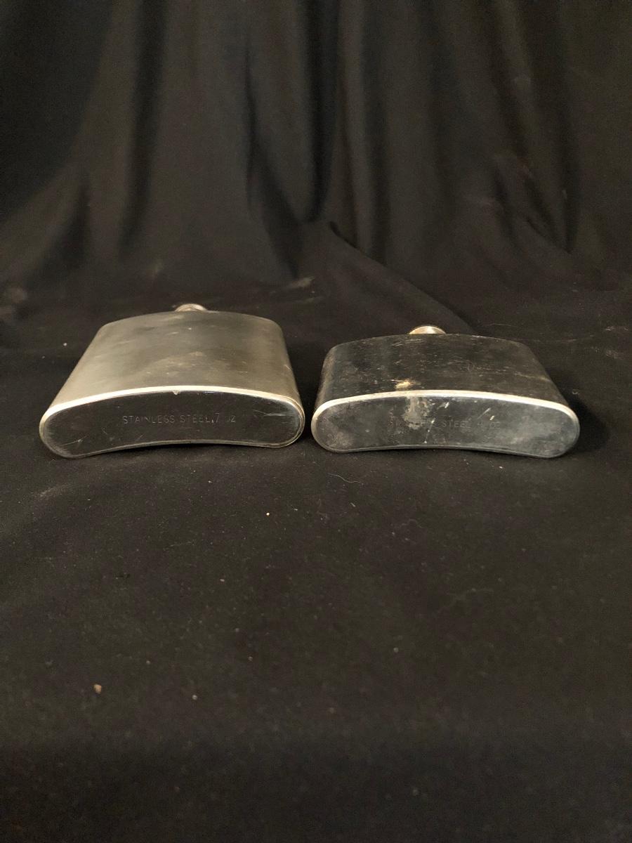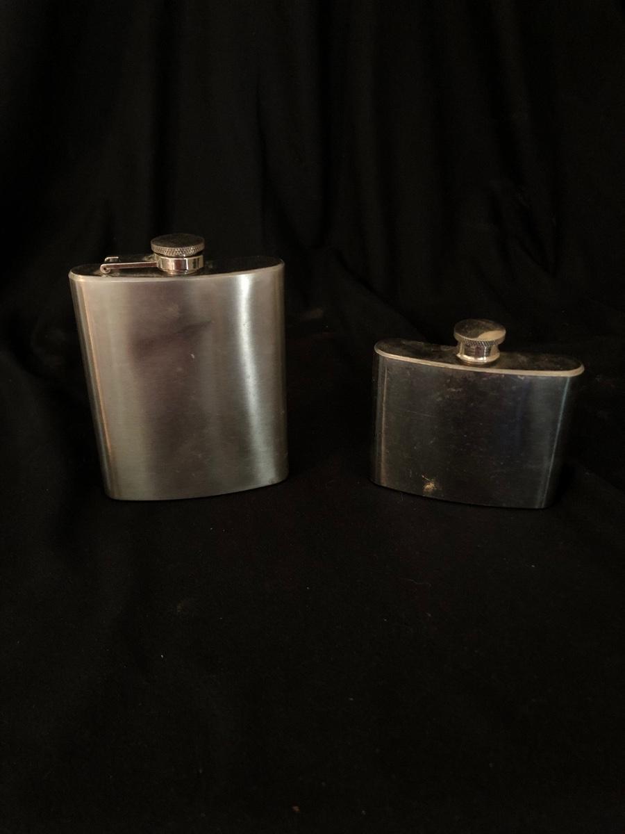 Lot includes an Alvin Sterling SS275 Stoplight jigger and two Stainless steel flasks (one smaller and one a little bigger). A functioning "middle finger" lighter, as well as a metal flask funnel are also included.