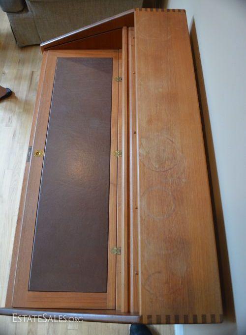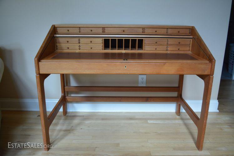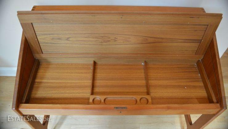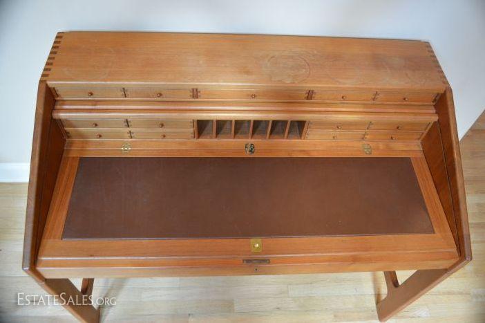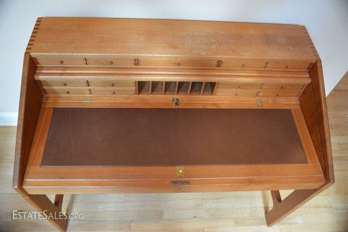 Roll top desk has a flat angle slider instead of the traditional curved slider. Several compartments inside for storage of office supplies and other items. Leather writing surface inside can be lifted up to reveal a hidden compartment below. There are a few water rings on the top side as evidenced in the pictures.