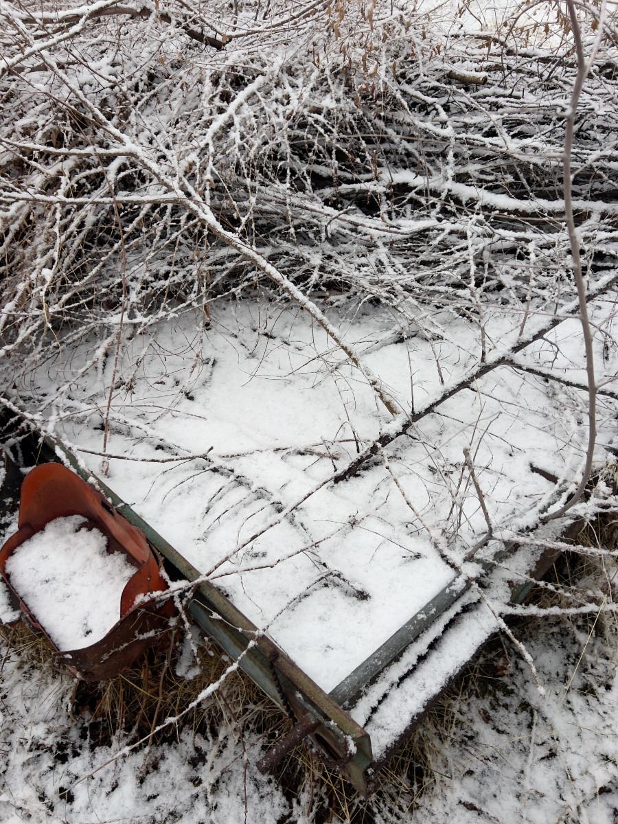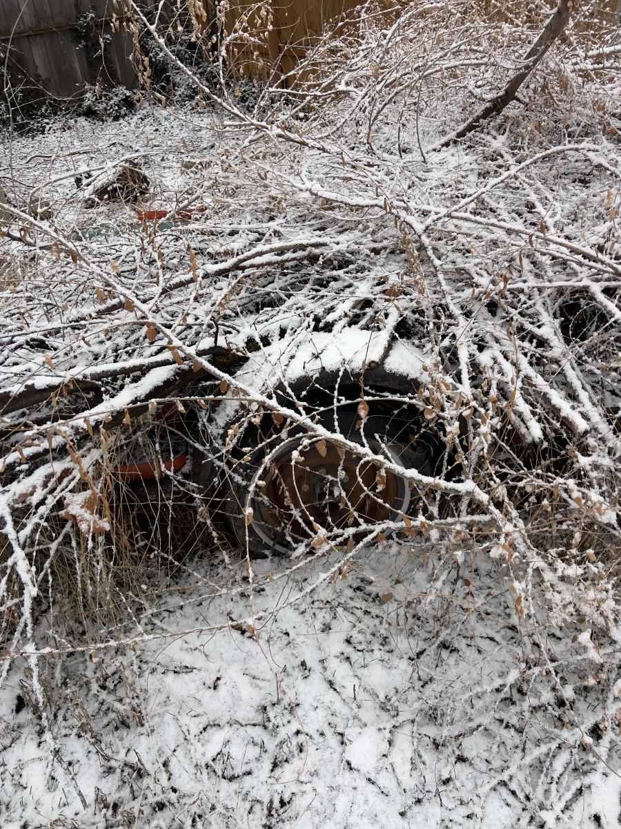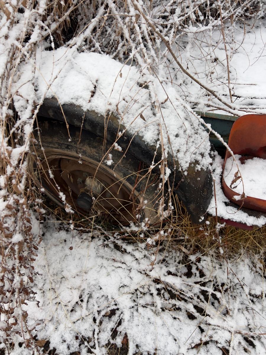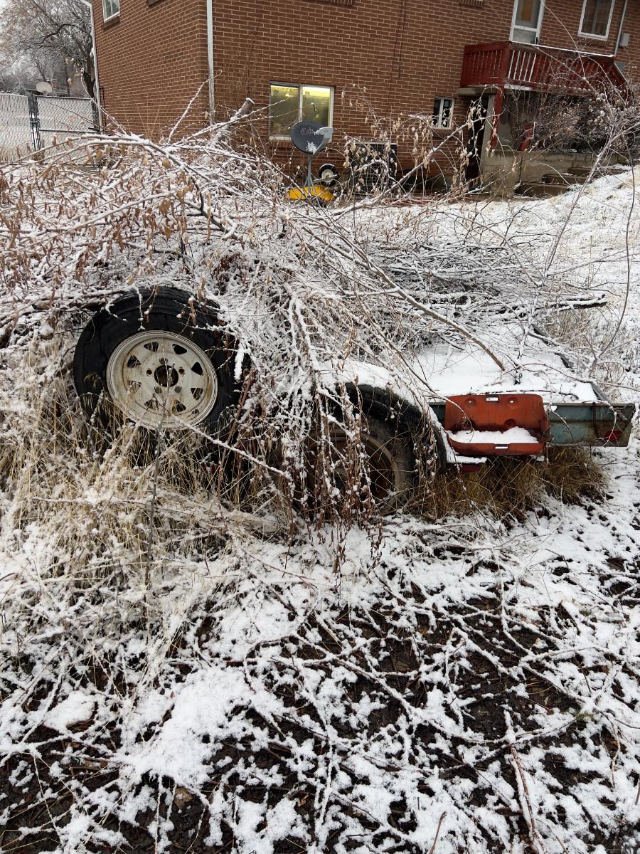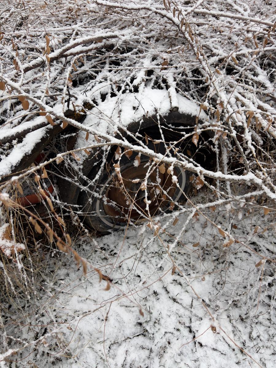 Has a load of Tree Branches. Tires are flat but should hold air. The Beads are not popped. About 72" Wide by 93" Long.