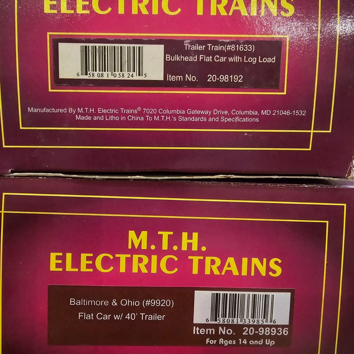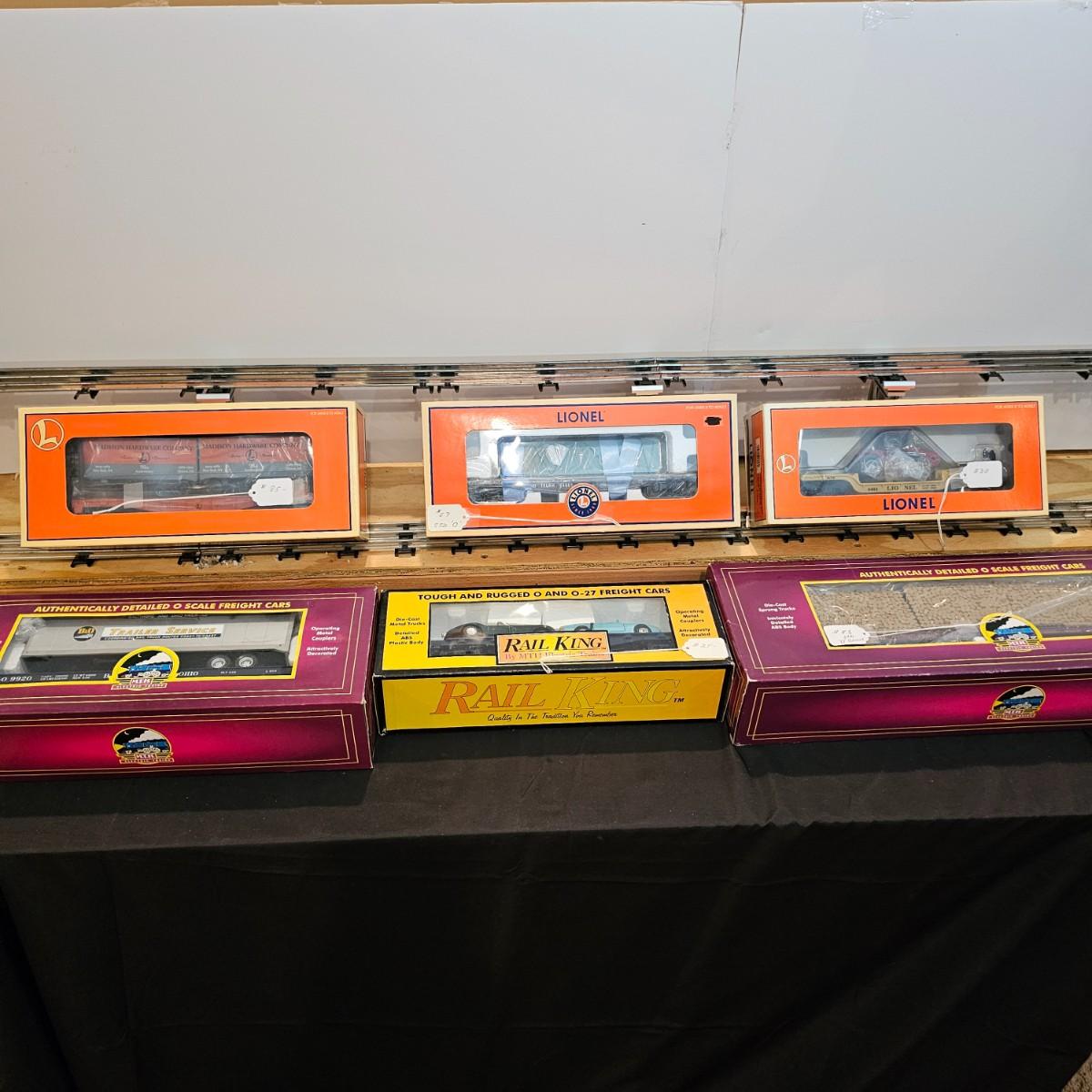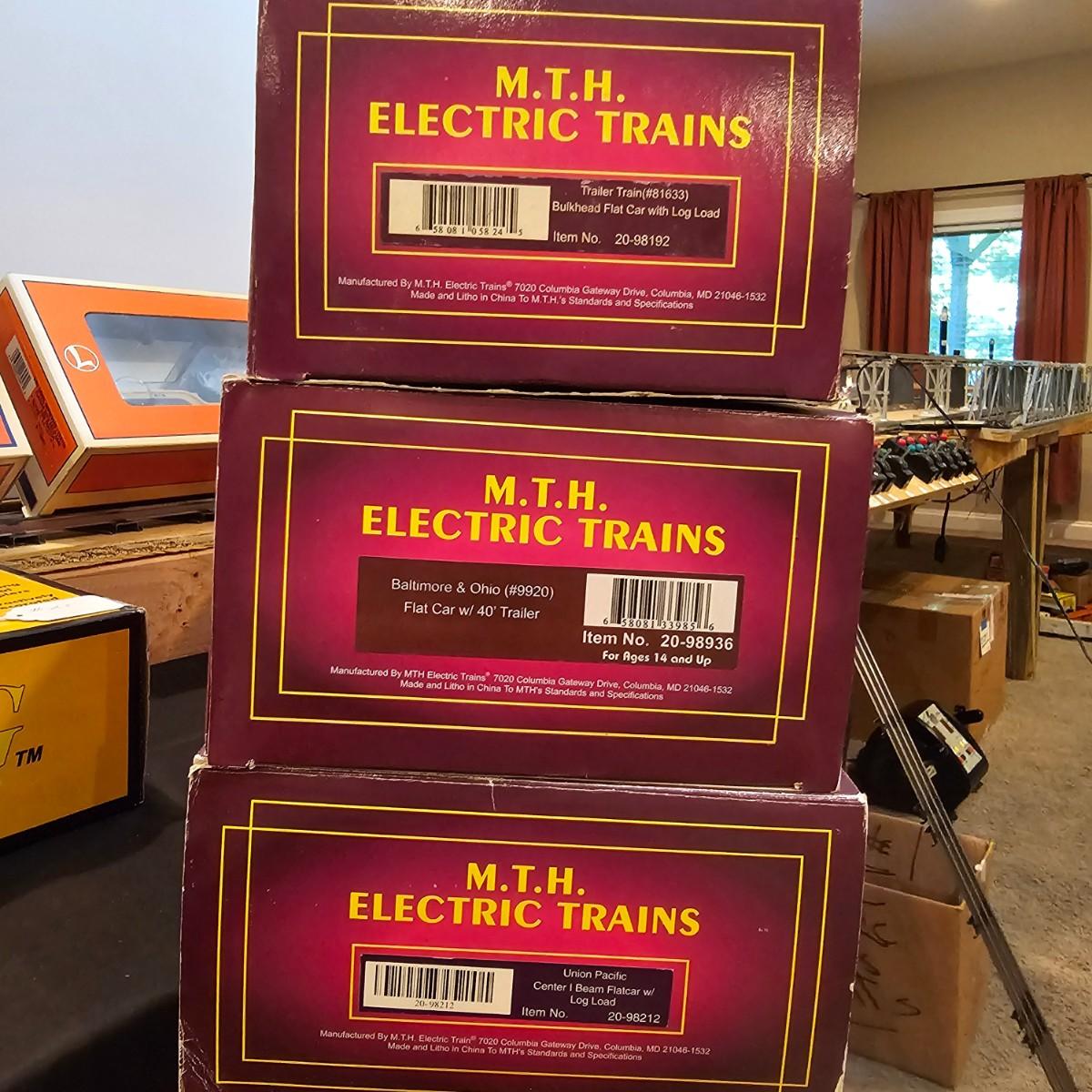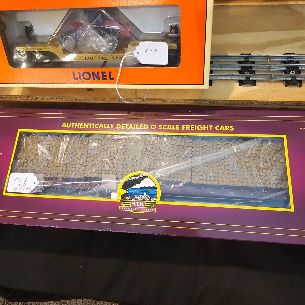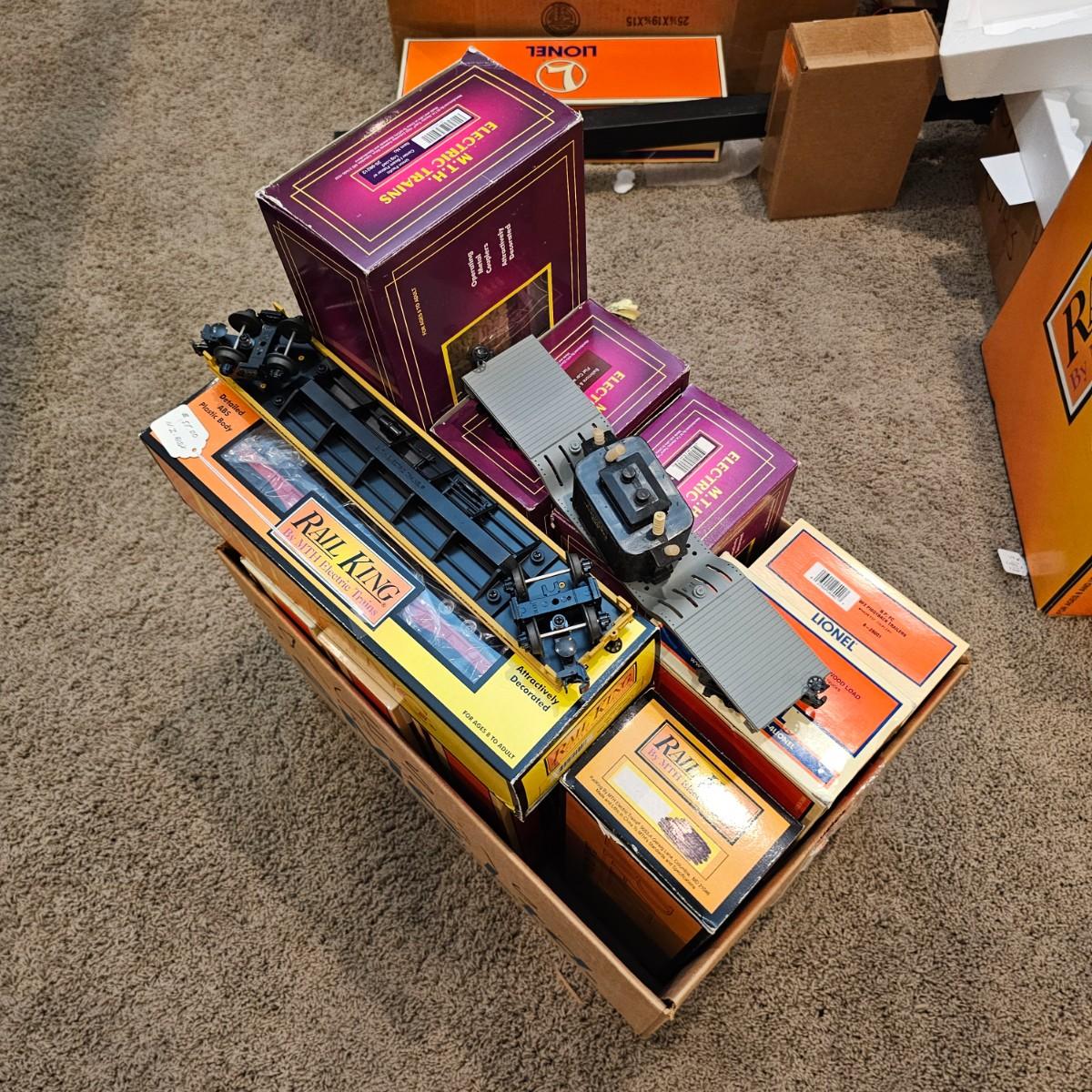 Several different styles of flatcars for specialty loads. Trailers, wood rounds, lumber, vehicles and other interesting items. Cars range from 11" to 18" in length, are all O gauge. Lionel, MTH/Rail King represented here. All but two cars have original boxes. See photos for details. Shipping available. Please note that any price tag seen on an item was not put there by Sterling Transitions and does not reflect the current value of the item. Any train tracks shown in photos are not included but are available in another lot in this sale.